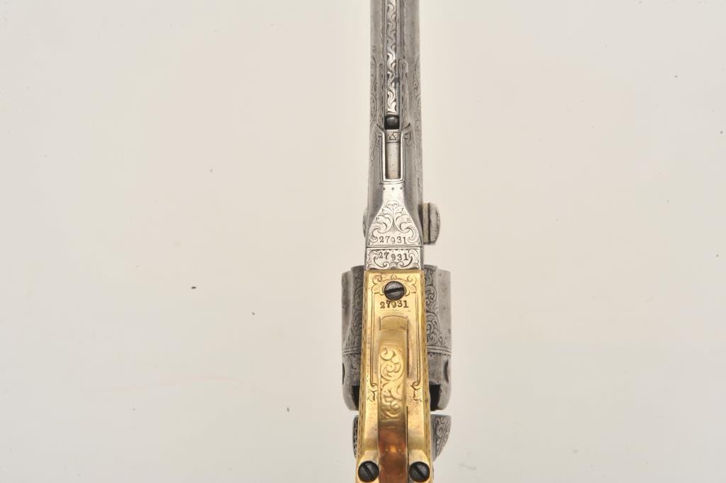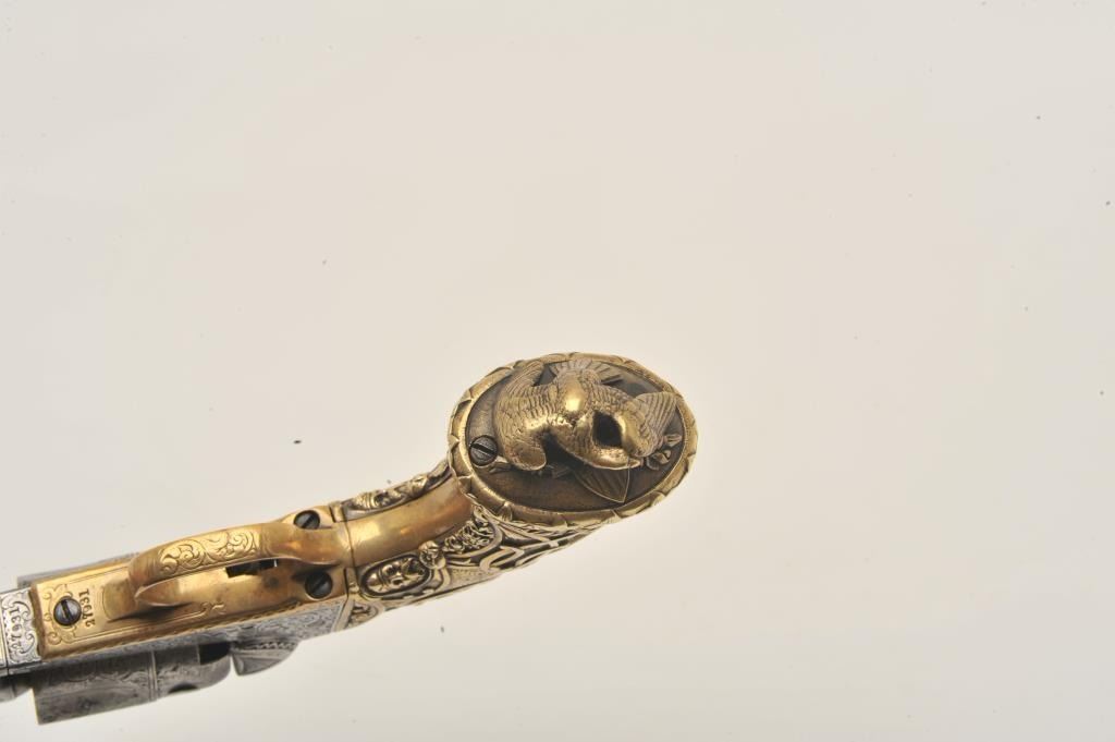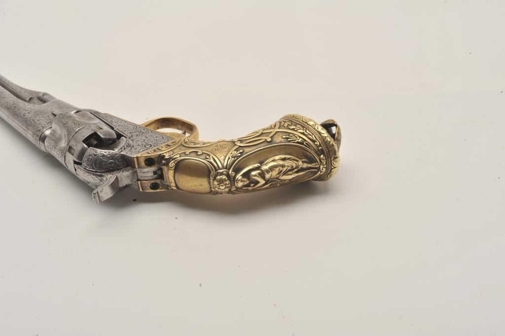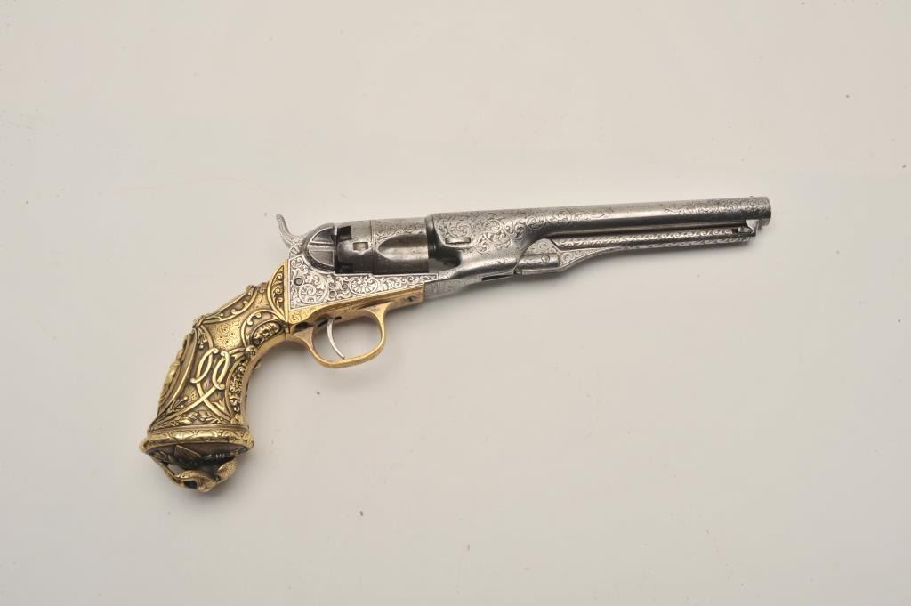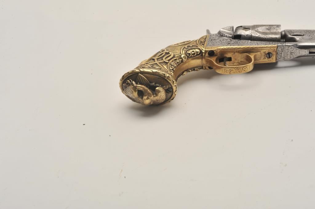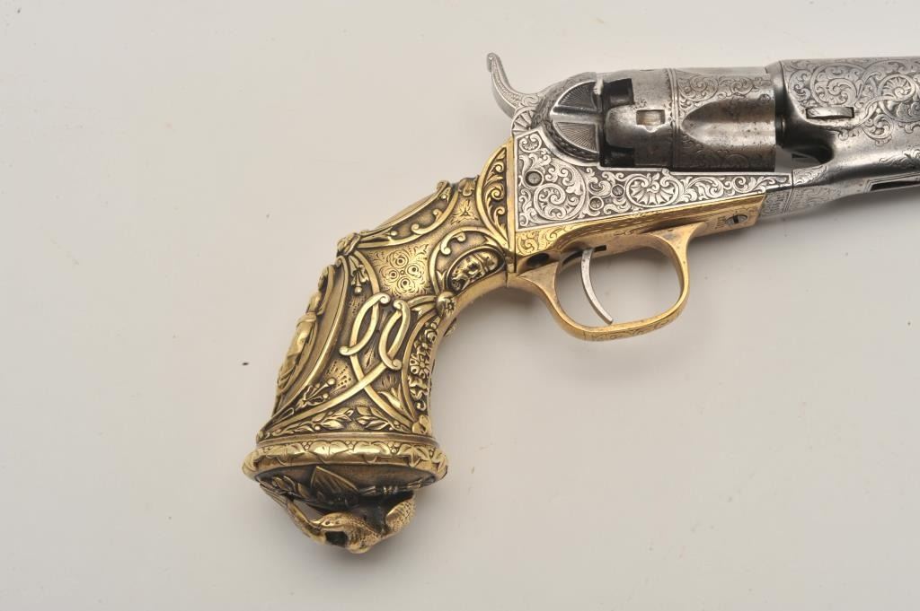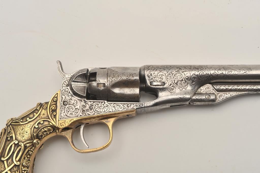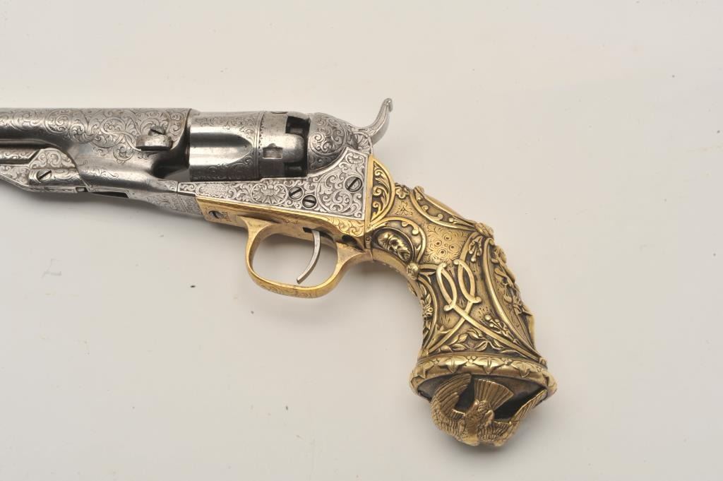 18BD-11 COLT 1862 POLICE ENGRAVEDIconic Colt 1862 Police .36 caliber percussion revolver fully and finely deluxe Nimschke engraved with authentic Mission lady and child “Tiffany” style cast metal grips, S/N 27931. This exact revolver is pictured on the cover of the "L.D. Nimschke Firearms Engraver" by R.L. Wilson and was formerly in the Norm Flayderman and Robert Petersen collections. The engraving is deluxe with superb scrolls, ribbons, arrows, and deep cut backgrounds. The metal surfaces are lightly polished and originally silvered. The grips are near fine with most of their original gold gilt. These are authentic 19th century original mission lady and child grips. Thedetail is superb and not to be confused with poor 20th century imitations. All matching serial numbers. Suitable for the most advanced percussion Colt collector or museum and rock solid pedigree. (Antique) Est.:$25,000-$50,000Iconic Colt 1862 Police .36 caliber percussion revolver fully and finely deluxe Nimschke engraved with authentic Mission lady and child “Tiffany” style cast metal grips, S/N 27931. This exact revolver is pictured on the cover of the "L.D. Nimschke Firearms Engraver" by R.L. Wilson and was formerly in the Norm Flayderman and Robert Petersen collections. The engraving is deluxe with superb scrolls, ribbons, arrows, and deep cut backgrounds. The metal surfaces are lightly polished and originally silvered. The grips are near fine with most of their original gold gilt. These are authentic 19th century original mission lady and child grips. Thedetail is superb and not to be confused with poor 20th century imitations. All matching serial numbers. Suitable for the most advanced percussion Colt collector or museum and rock solid pedigree. (Antique) Est.:$25,000-$50,000