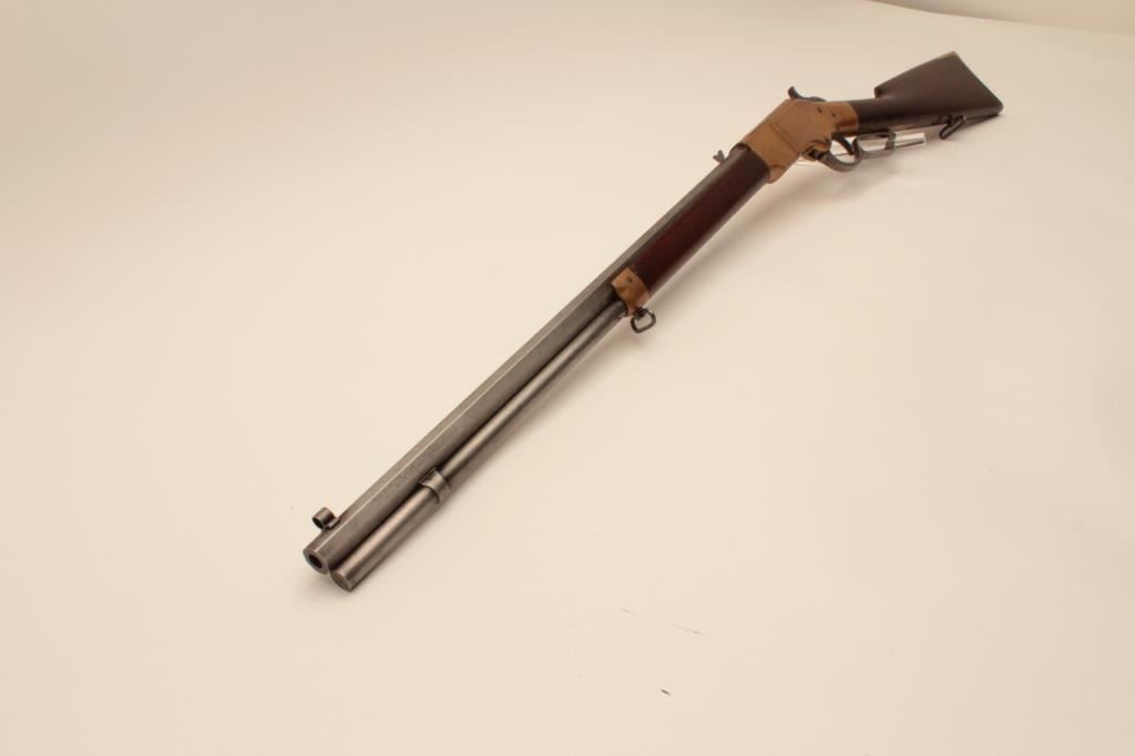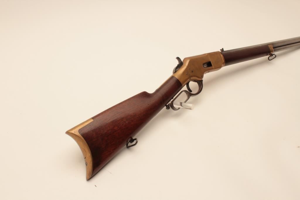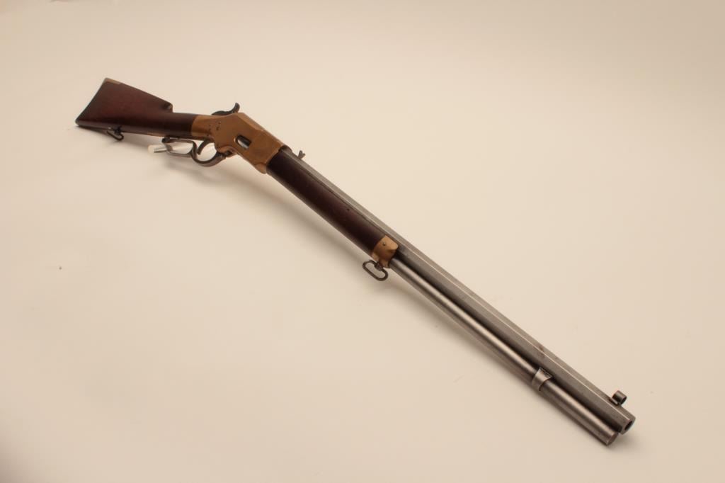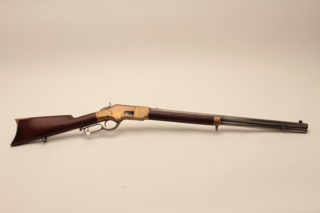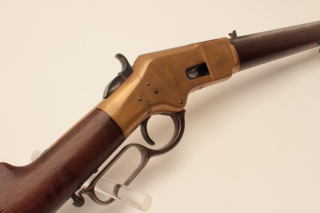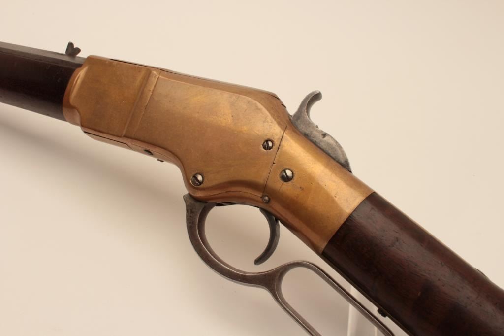 18AL-35 WINCHESTER BAYESImportant rare early Bayes Patent Winchester brass framed lever action rifle, .44 caliber, 24” octagon Henry-marked barrel, brass dust cover, wood stocks, no S/N; overall good to very good condition with pleasing taffycolored patina to brass frame and dust cover, light grey patina to barrel and loading tube, crisp action, very good bore, sling swivels and good to very good wood stocks with some old mars and scratches fromhandling and storage. Consignor’s tag notes one-of-a-kind, ex-Cody Museum display. Also accompanied by a packet of copies of Bayes Patent and information on the Bayes design, etc. (Antique). Est.:$14,000-$28,000.Important rare early Bayes Patent Winchester brass framed lever action rifle, .44 caliber, 24” octagon Henry-marked barrel, brass dust cover, wood stocks, no S/N; overall good to very good condition with pleasing taffycolored patina to brass frame and dust cover, light grey patina to barrel and loading tube, crisp action, very good bore, sling swivels and good to very good wood stocks with some old mars and scratches fromhandling and storage. Consignor’s tag notes one-of-a-kind, ex-Cody Museum display. Also accompanied by a packet of copies of Bayes Patent and information on the Bayes design, etc. (Antique). Est.:$14,000-$28,000.