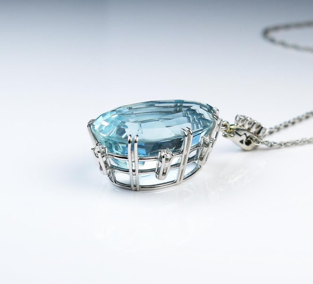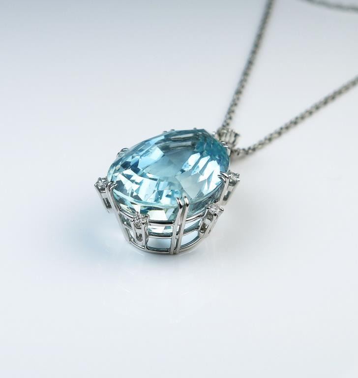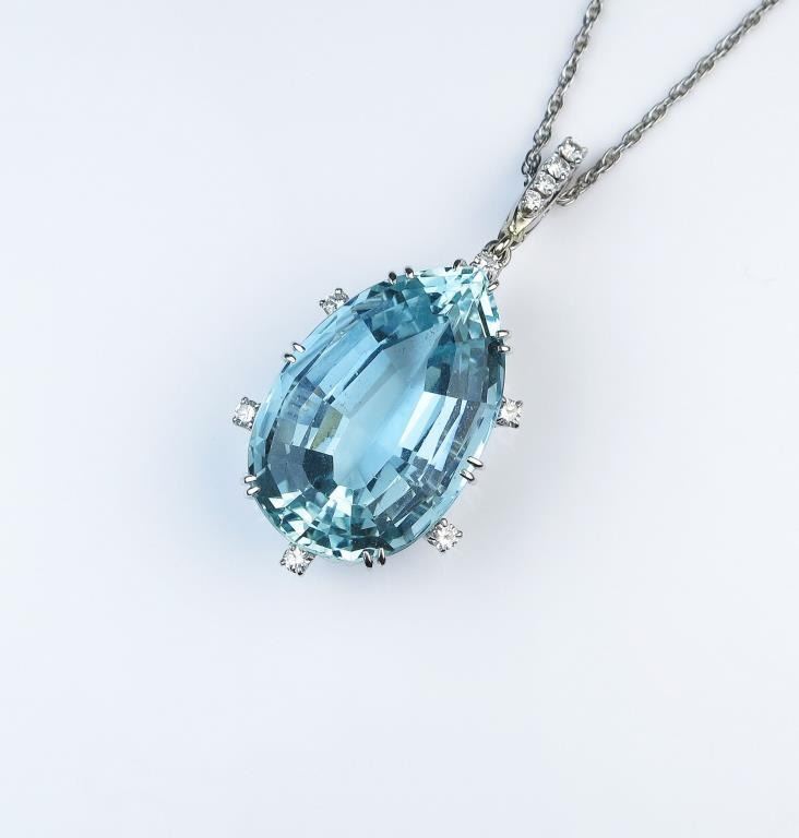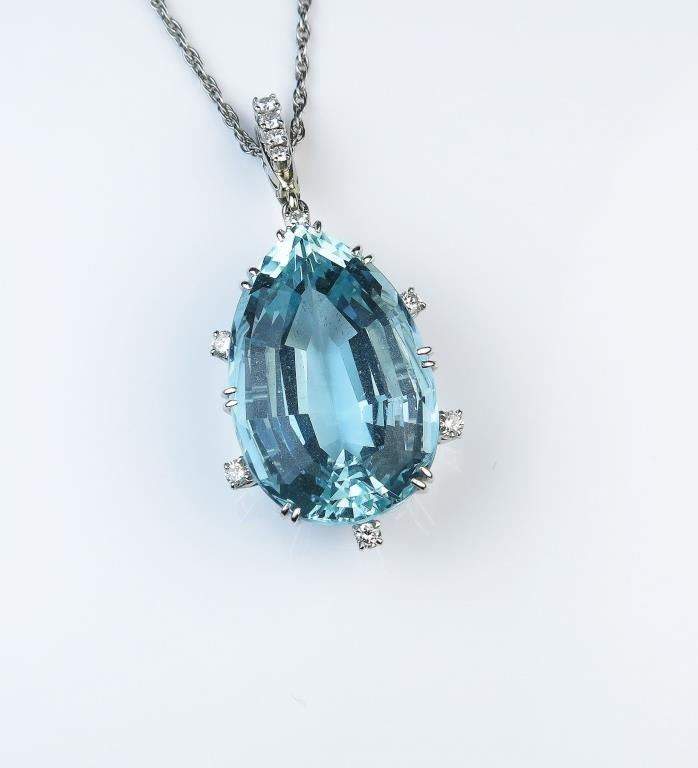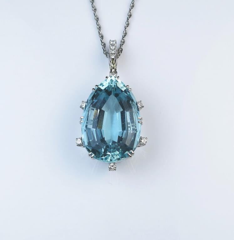 18CAI-2 AQUAMARINE PENDANTExceptional Platinum pendant featuring a fine Pear shape Aquamarine weighing over 40.00 carats set with Diamonds weighing approx. 0.50 carats of G-H colors and VS clarity. Please see Full Appraisal at over $30,000Estimates $10,000-$15,000Exceptional Platinum pendant featuring a fine Pear shape Aquamarine weighing over 40.00 carats set with Diamonds weighing approx. 0.50 carats of G-H colors and VS clarity. Please see Full Appraisal at over $30,000Estimates $10,000-$15,000