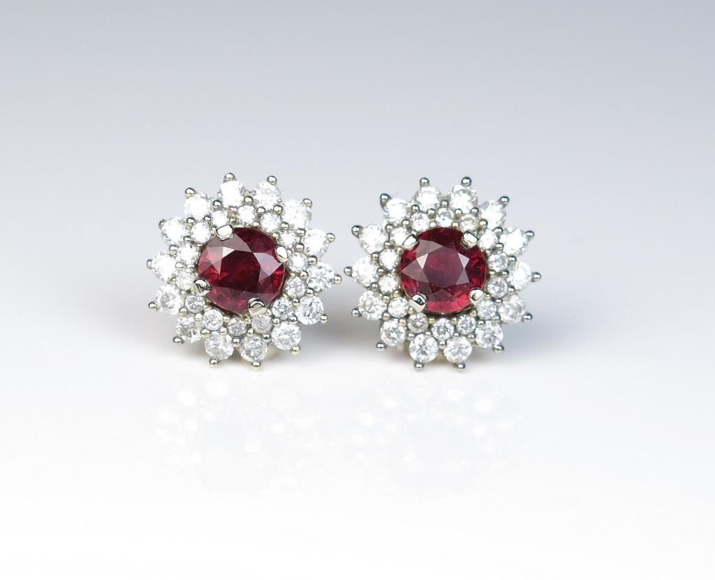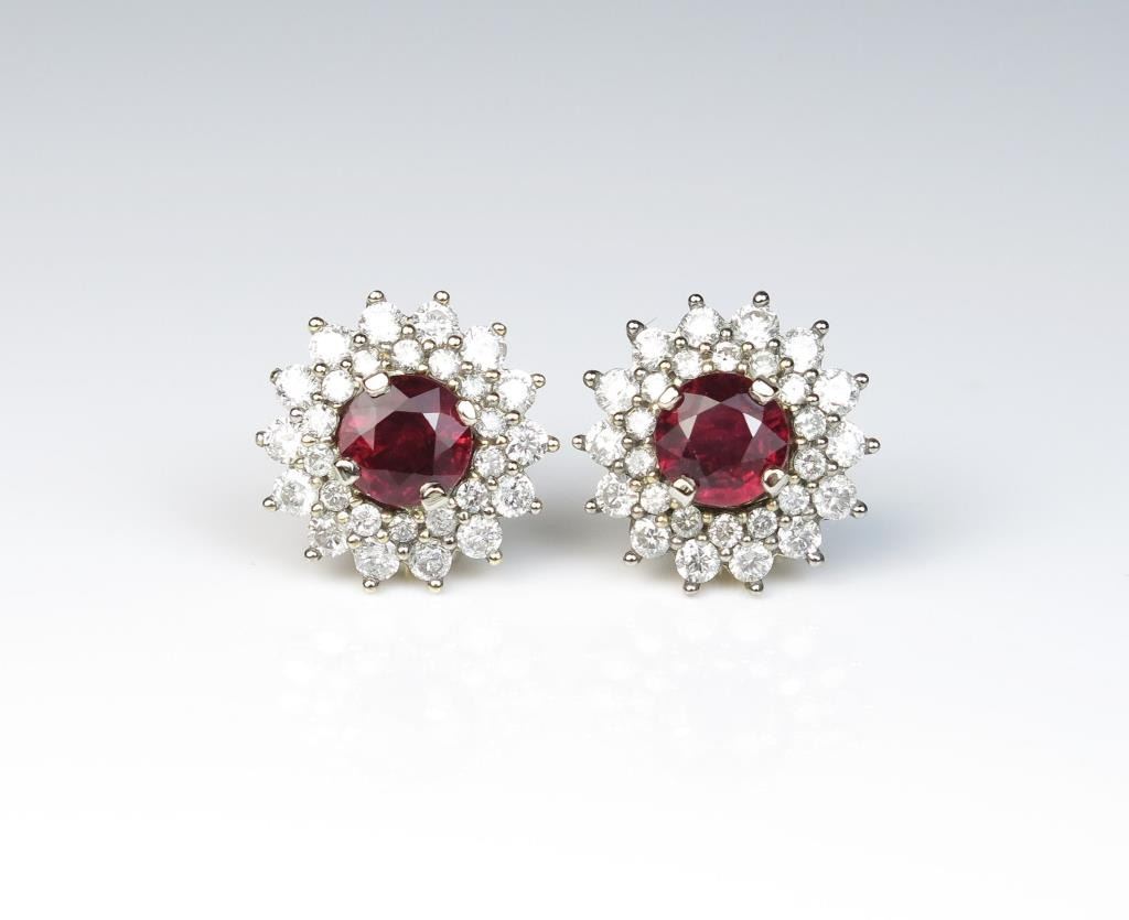 18CAI-15 RUBY EARRINGSExceptional pigeon blood Ruby earrings featuring two matching round natural NO treatment Rubies weighing 2.08 carats and 60 round Diamonds weighing approx. 2.47 carats of F/G colors in a two tone 14 karat goldsetting. Full Retail Appraisal at $37,500.00 Estimates $8,000-$15,000 Very rare itemExceptional pigeon blood Ruby earrings featuring two matching round natural NO treatment Rubies weighing 2.08 carats and 60 round Diamonds weighing approx. 2.47 carats of F/G colors in a two tone 14 karat goldsetting. Full Retail Appraisal at $37,500.00 Estimates $8,000-$15,000 Very rare item