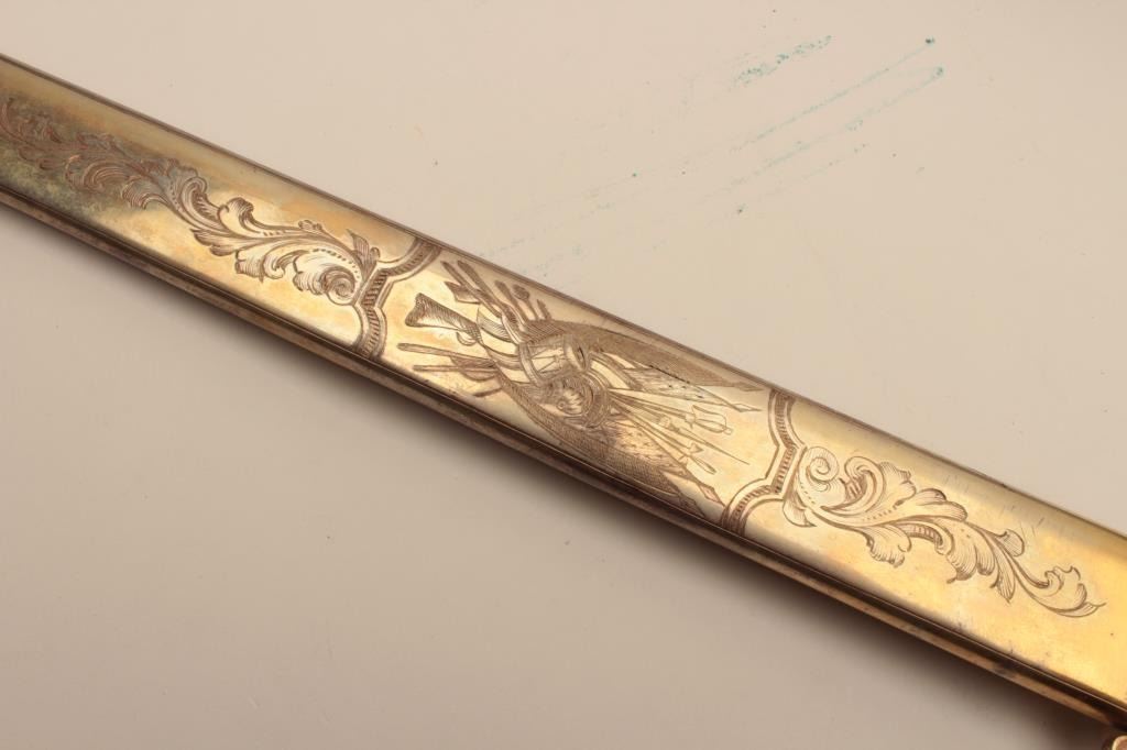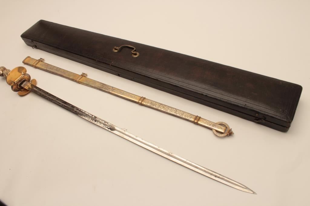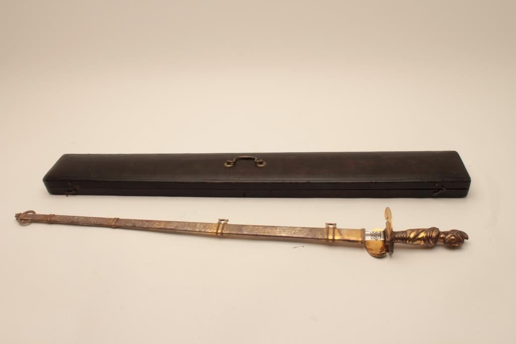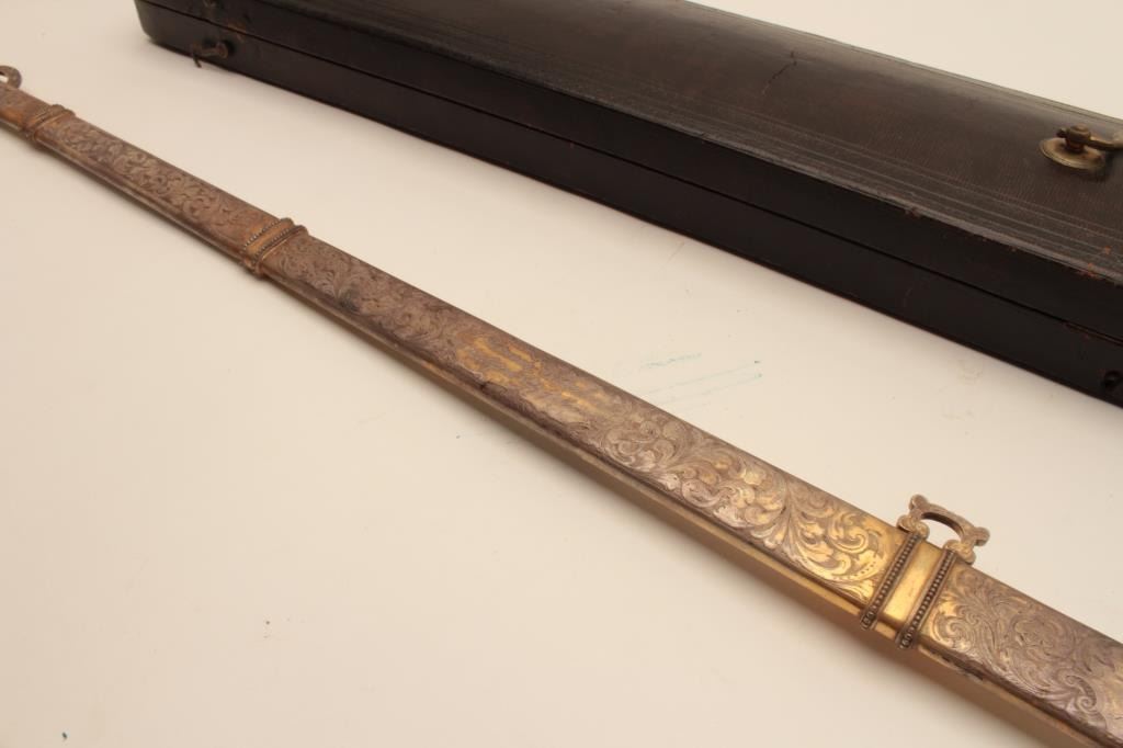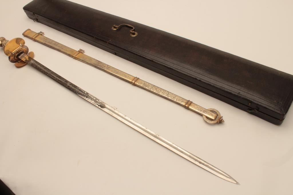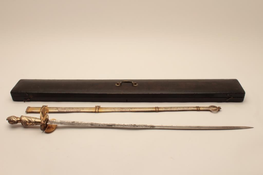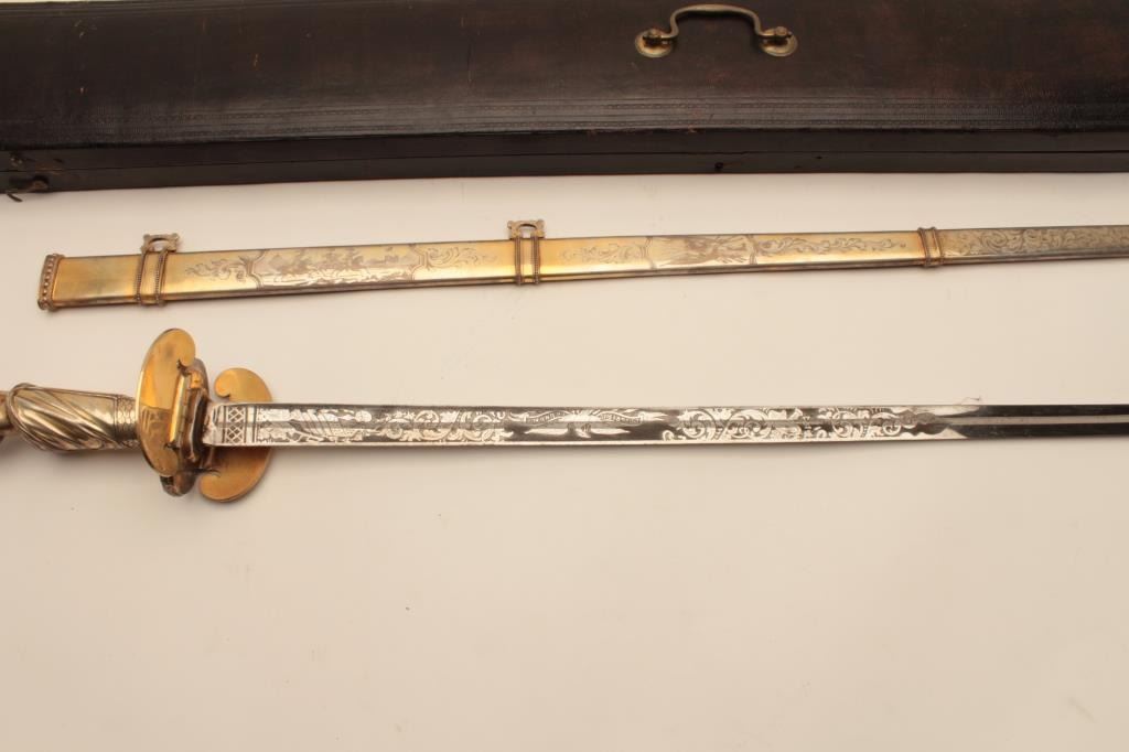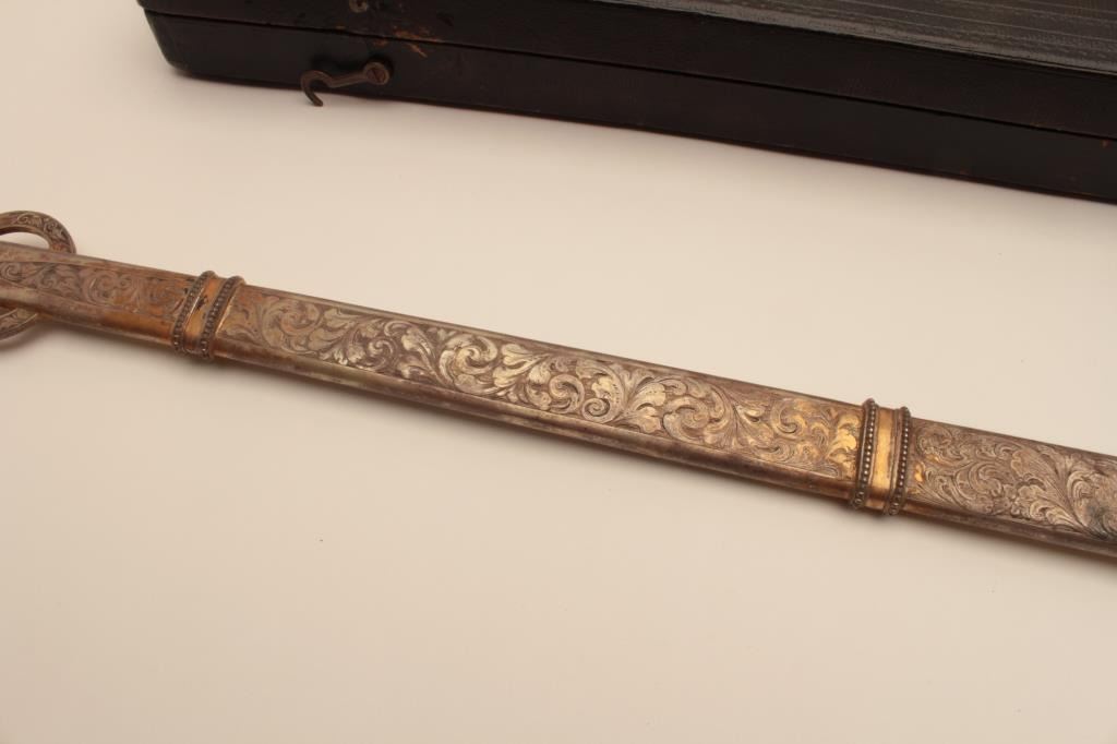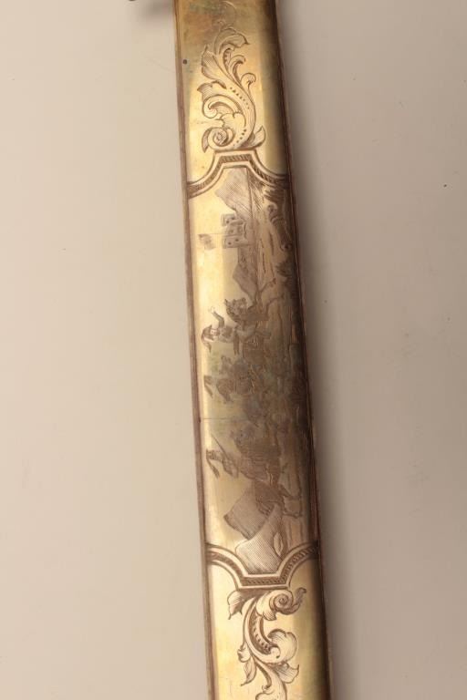 EVE-54 PRESENTATION SWORDImportant and fine Mexican War presentation sword inscribed, “Presented by the citizens of Delhi to Lieutenant Frederick Steele of the 2nd United States infantry for the gallant and conduct by which he distinguished himself in the late battles before the city of Mexico”. The sword is also finely hand engraved on the reverse with battle scene of American forces in Mexico. The hilt is cast with figure of Roman soldier and the balanceof the scabbard is finely and richly scroll engraved. The blade shows etching of eagles and scrolls and is in excellent condition. The sword shows 50%-60% gold gilt over silver. Contained in Moroccan leather covered fitted case. The case is marked in gilt book binder letters, “Ball, Tompkins, and Black manufacturers, No 247, Broadway, New York”. The sword measures 40 ½” overall with a 32 ½” blade. Several letters of correspondencebetween Eric Vaule and Bill Guthman (Guthman Americana) concerning this sword are included along with a huge research binder on the history of Frederick Steele. Fredrick Steele was a descendent of pilgrims from theImportant and fine Mexican War presentation sword inscribed, “Presented by the citizens of Delhi to Lieutenant Frederick Steele of the 2nd United States infantry for the gallant and conduct by which he distinguished himself in the late battles before the city of Mexico”. The sword is also finely hand engraved on the reverse with battle scene of American forces in Mexico. The hilt is cast with figure of Roman soldier and the balanceof the scabbard is finely and richly scroll engraved. The blade shows etching of eagles and scrolls and is in excellent condition. The sword shows 50%-60% gold gilt over silver. Contained in Moroccan leather covered fitted case. The case is marked in gilt book binder letters, “Ball, Tompkins, and Black manufacturers, No 247, Broadway, New York”. The sword measures 40 ½” overall with a 32 ½” blade. Several letters of correspondencebetween Eric Vaule and Bill Guthman (Guthman Americana) concerning this sword are included along with a huge research binder on the history of Frederick Steele. Fredrick Steele was a descendent of pilgrims from the