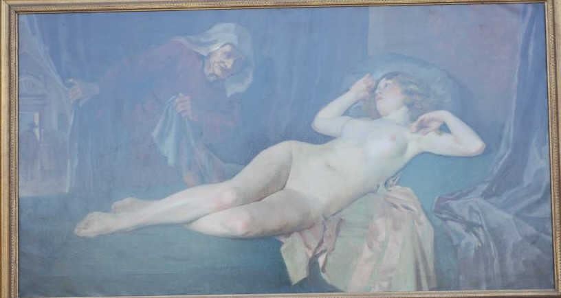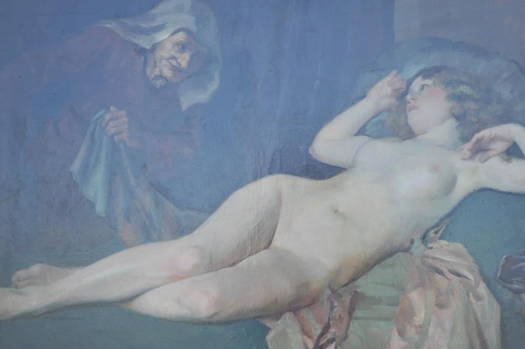 EVE-43 OIL ON CANVASOil on canvas signed lower right (Illegible) 19th to 20th century. Nicely restored fairly recently. Shows nude with crone telling of gentleman “callers”. Measures 25 ¼” x 37”. The estate of Eric Vaule. Est.: $2500-$5000Oil on canvas signed lower right (Illegible) 19th to 20th century. Nicely restored fairly recently. Shows nude with crone telling of gentleman “callers”. Measures 25 ¼” x 37”. The estate of Eric Vaule. Est.: $2500-$5000