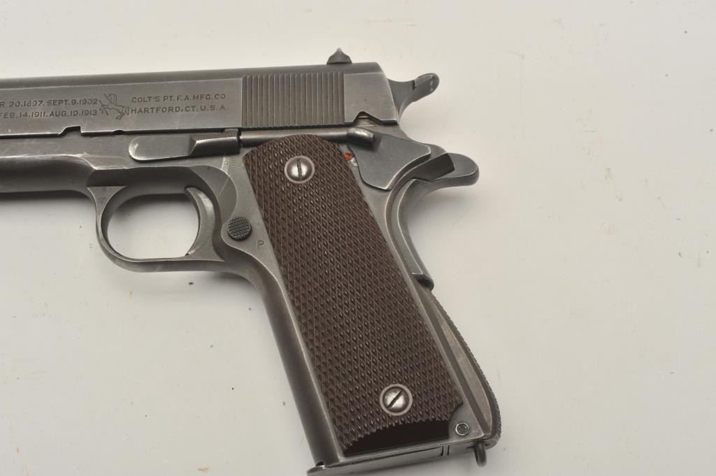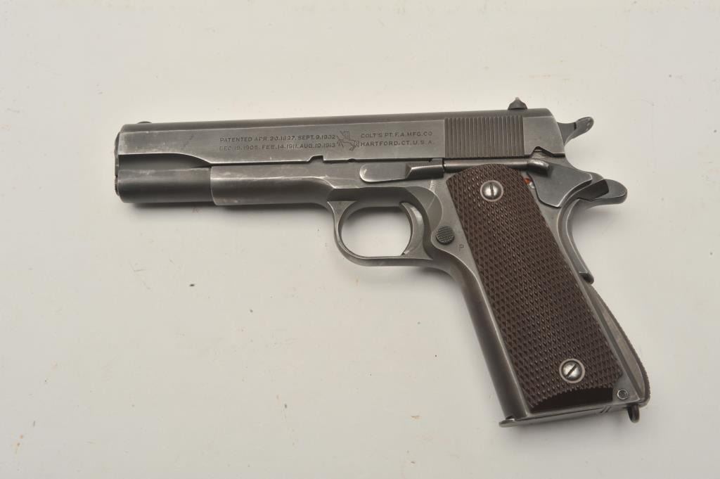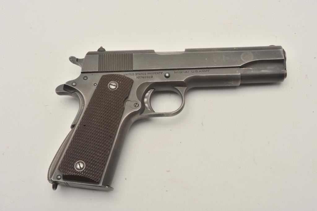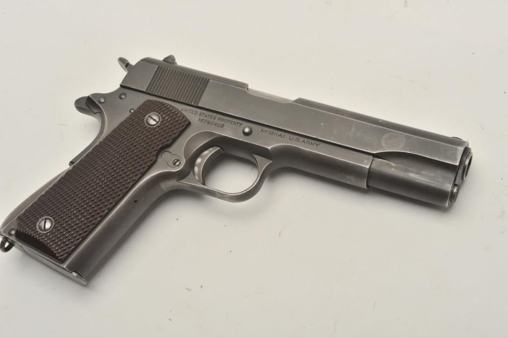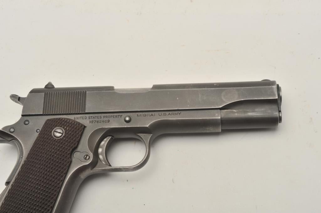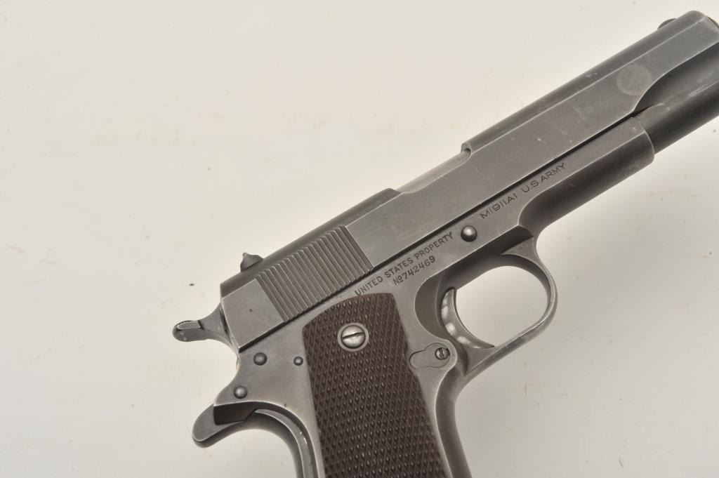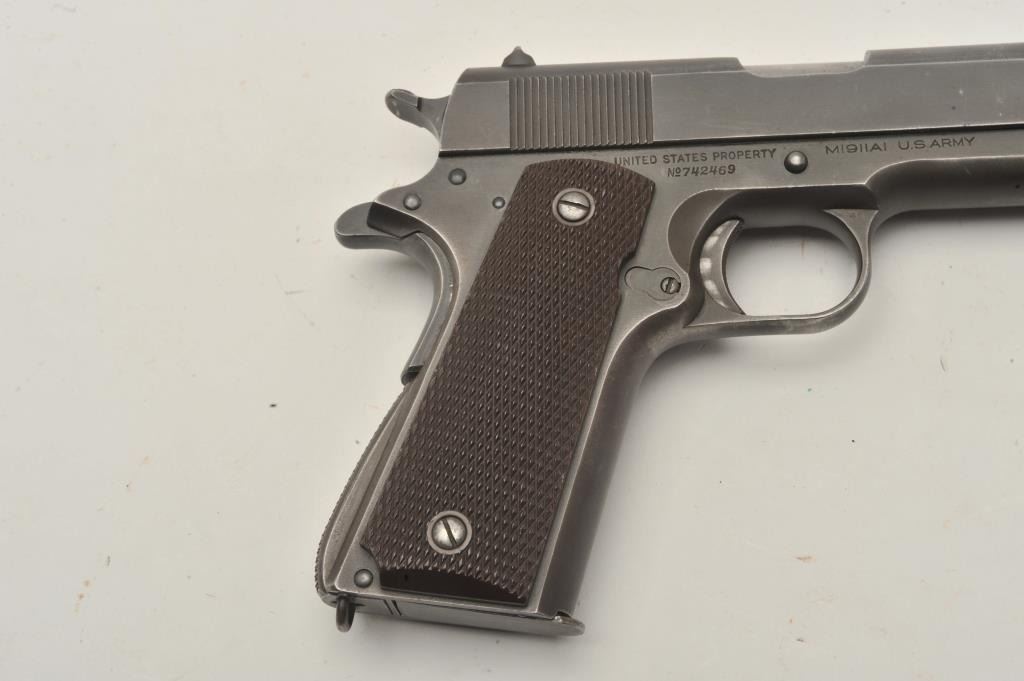 17FR-36 COLT 1911 #742469Colt 1911 A1 Transition U.S. Army semi-auto pistol, .45 caliber, Serial #742469. The pistol is in very good overall condition with a 5” barrel. The pistol retains the majority of its muted military finishwith high point edge and muzzle wear noted. The checkered plastic grips are in fine condition with only light storage and handling marks observed. The pistol is marked, “RS” inspected. The bore is verygood, the markings are sharp and the action is crisp. The pistol is US Army and US property marked. An outstanding World War II era 1911 manufactured in 1941. The lot includes one correct magazine. From the the estate of Larry Gaertner. Est.: $2,000-$4,000. (C+R)Colt 1911 A1 Transition U.S. Army semi-auto pistol, .45 caliber, Serial #742469. The pistol is in very good overall condition with a 5” barrel. The pistol retains the majority of its muted military finishwith high point edge and muzzle wear noted. The checkered plastic grips are in fine condition with only light storage and handling marks observed. The pistol is marked, “RS” inspected. The bore is verygood, the markings are sharp and the action is crisp. The pistol is US Army and US property marked. An outstanding World War II era 1911 manufactured in 1941. The lot includes one correct magazine. From the the estate of Larry Gaertner. Est.: $2,000-$4,000. (C+R)