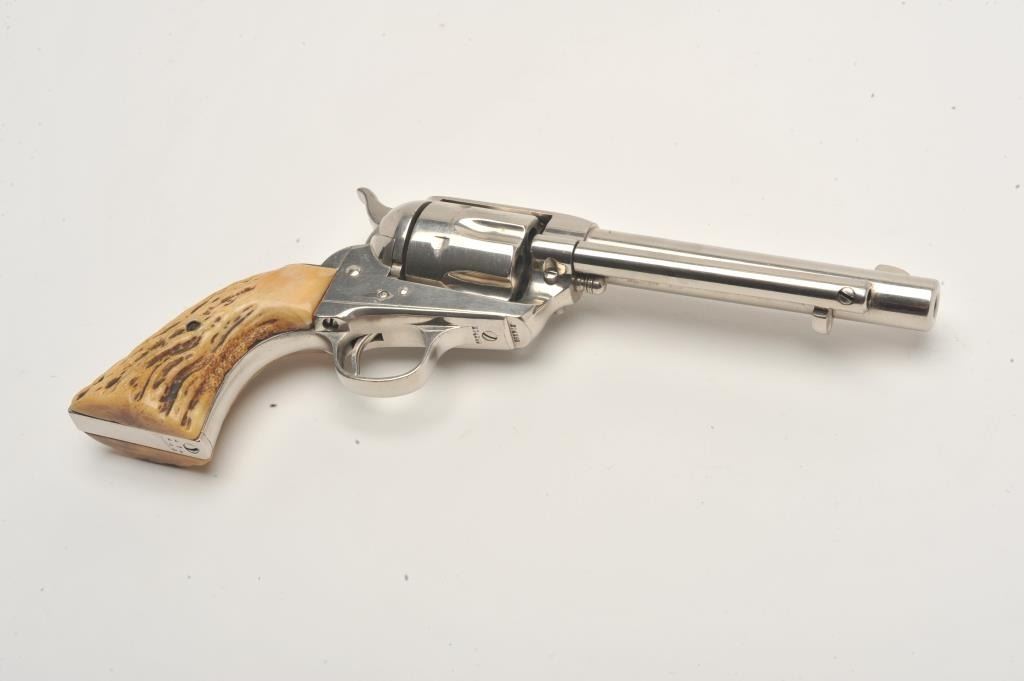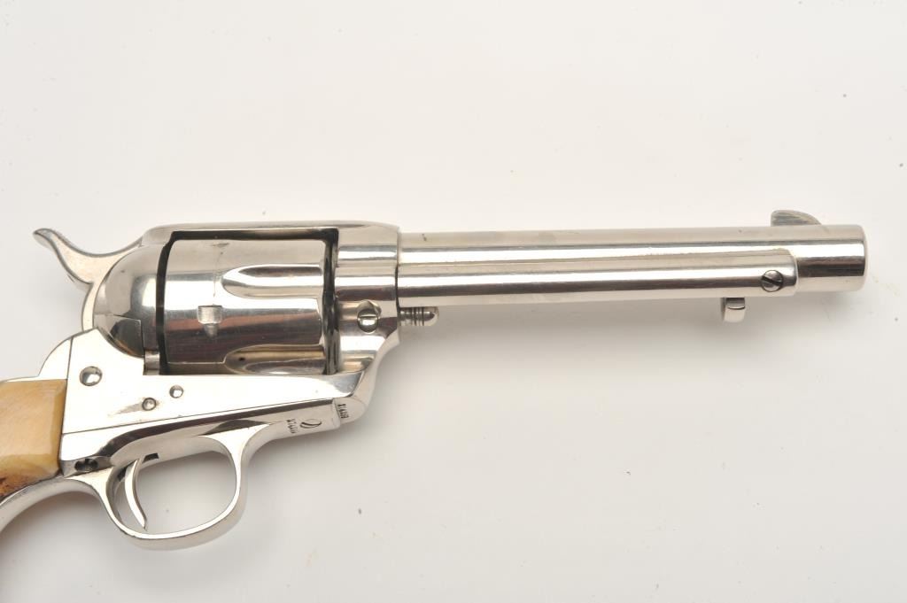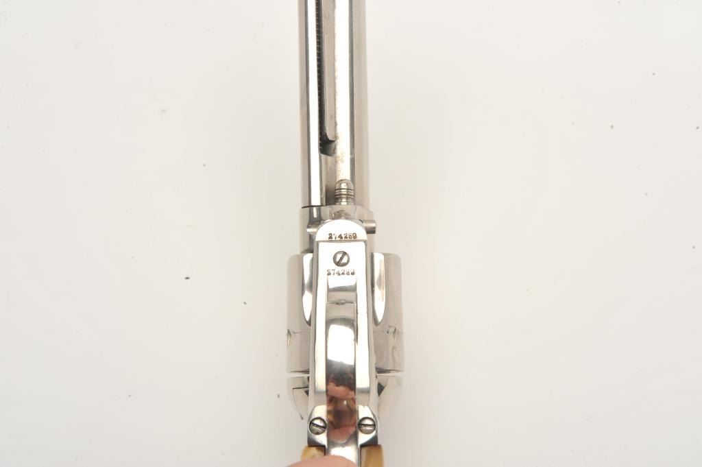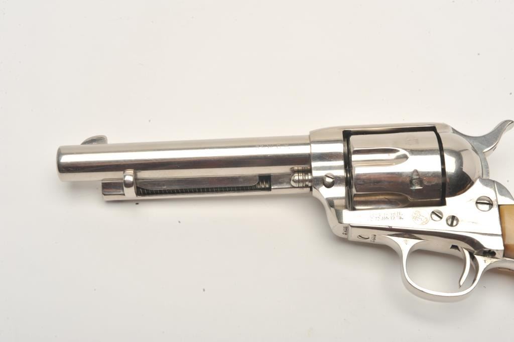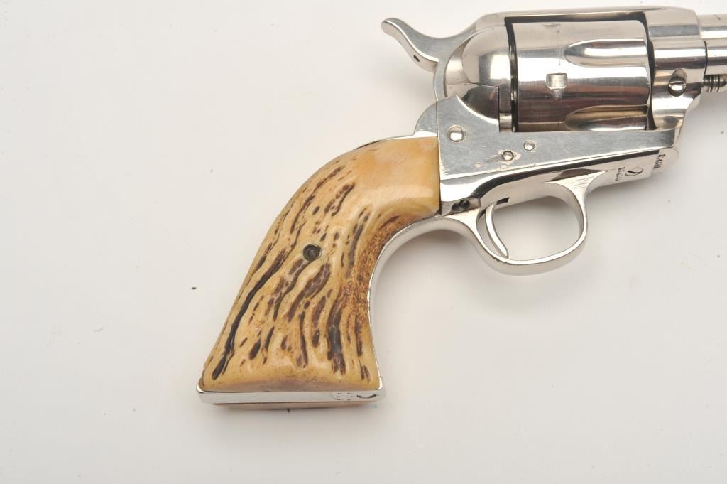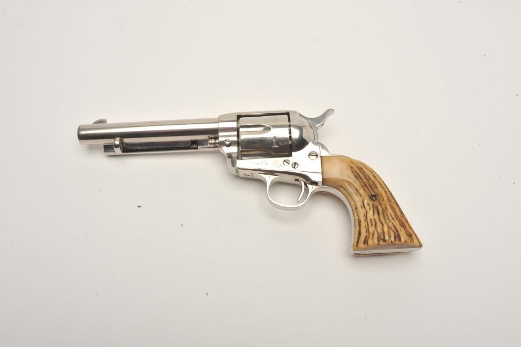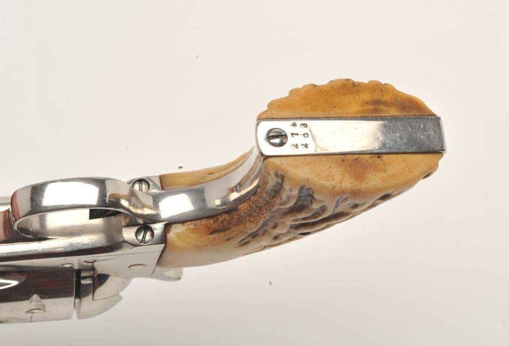 17FS-25 COLT SA 5.5" .32/20 W/LETTER #274289Colt SAA revolver, .32 W.C.F. caliber, 5.5” barrel, old re-nickel finish, stag grips, S/N 274289, in overall good to very good condition showing the majority of its old re-finish, fair to good bore, crispaction, sharp markings, very good grips; accompanied by a Colt factory letter confirming caliber and barrel length, stocks “Not Listed”, originally blued finish, shipped to Simmons Hardware Co., St. Louis,MO. on Jan. 20, 1906, fifteen guns in shipment. (C&R/No PPT). Est.: $1,400-$2,800.Colt SAA revolver, .32 W.C.F. caliber, 5.5” barrel, old re-nickel finish, stag grips, S/N 274289, in overall good to very good condition showing the majority of its old re-finish, fair to good bore, crispaction, sharp markings, very good grips; accompanied by a Colt factory letter confirming caliber and barrel length, stocks “Not Listed”, originally blued finish, shipped to Simmons Hardware Co., St. Louis,MO. on Jan. 20, 1906, fifteen guns in shipment. (C&R/No PPT). Est.: $1,400-$2,800.