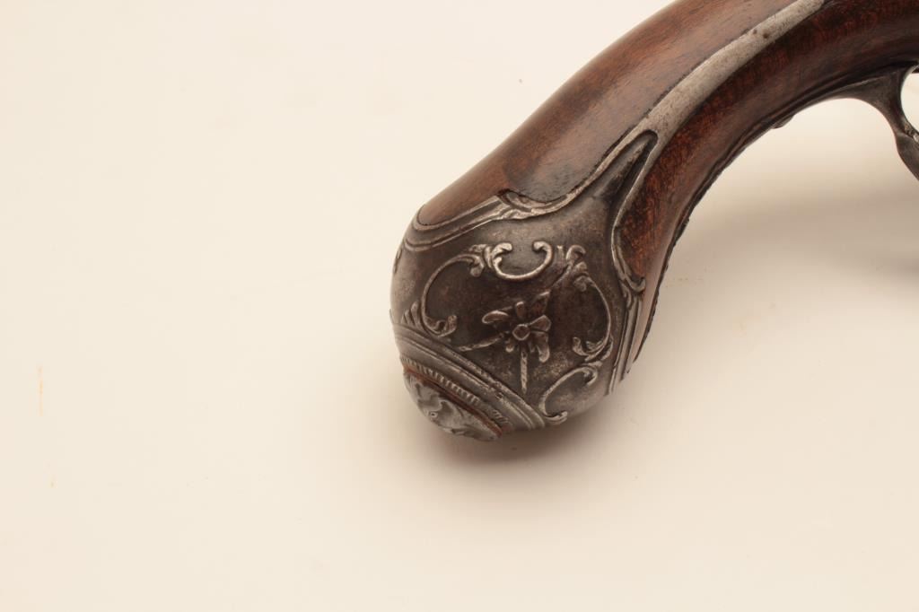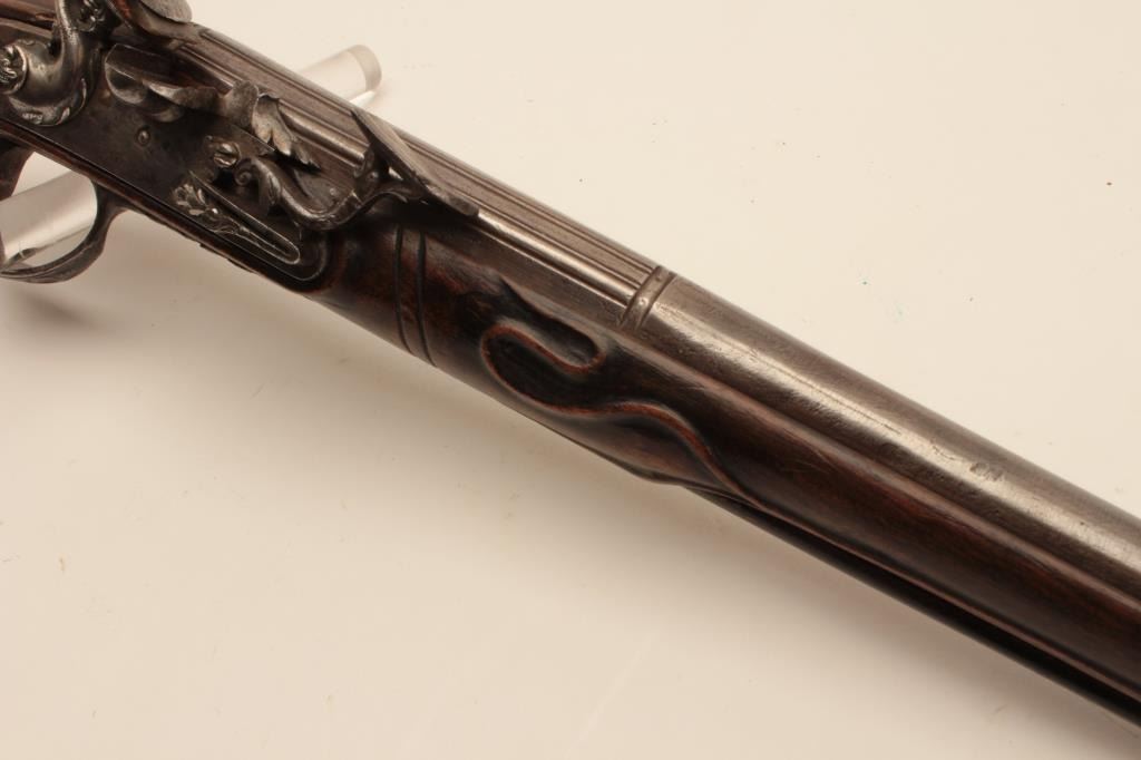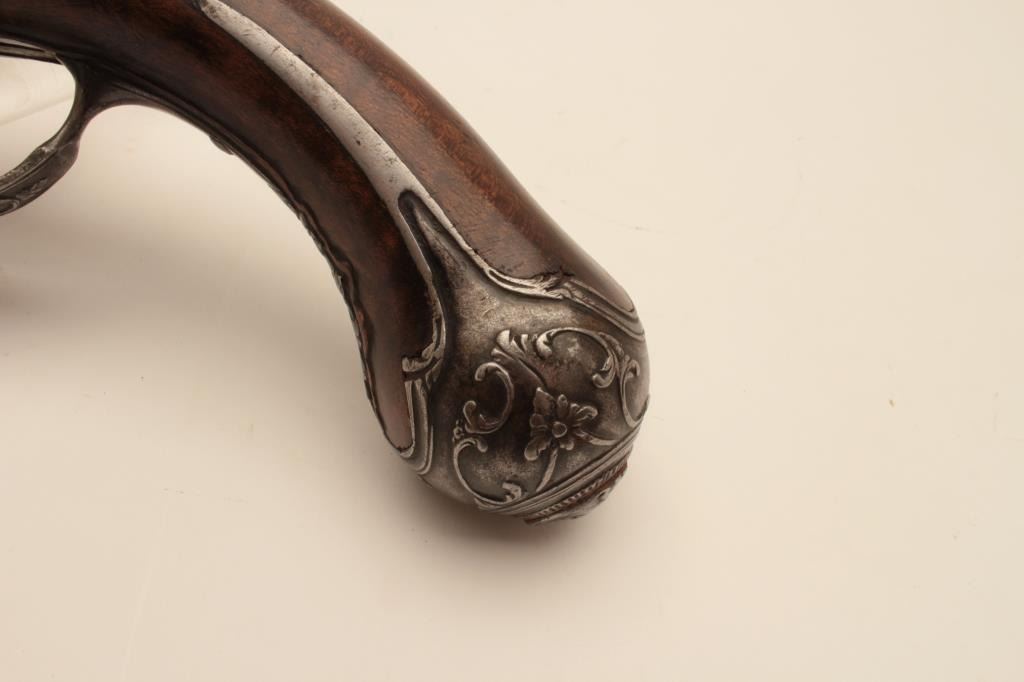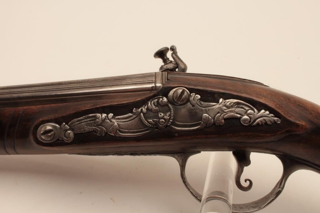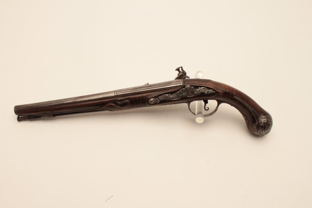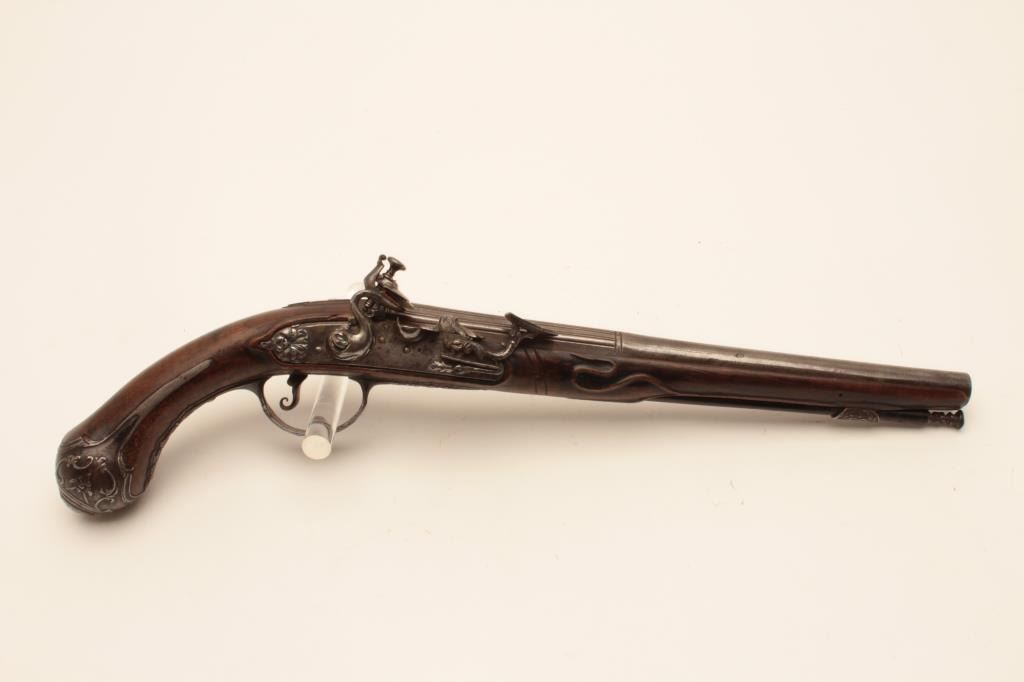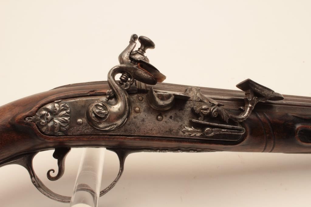 18CF-23 SNAPHANCE PISTOLHolster size Italian snaphance pistol with chiseled steel lock and mounts circa 18th century. Measures 18 ½” overall with a 11 ½” barrel of .58 caliber smoothbore. The lock shows correct original parts with qualitychiseling of faces, serpents, monsters and scrolls. The mounts show good quality raised scrollwork. The stock shows minor repair with excellent restoration and still sharp raised carving. Metal surfaces are good. Correctstyle ramrod. A very big and quite good snaphance. (Antique) Est.: $3500-$7000Holster size Italian snaphance pistol with chiseled steel lock and mounts circa 18th century. Measures 18 ½” overall with a 11 ½” barrel of .58 caliber smoothbore. The lock shows correct original parts with qualitychiseling of faces, serpents, monsters and scrolls. The mounts show good quality raised scrollwork. The stock shows minor repair with excellent restoration and still sharp raised carving. Metal surfaces are good. Correctstyle ramrod. A very big and quite good snaphance. (Antique) Est.: $3500-$7000