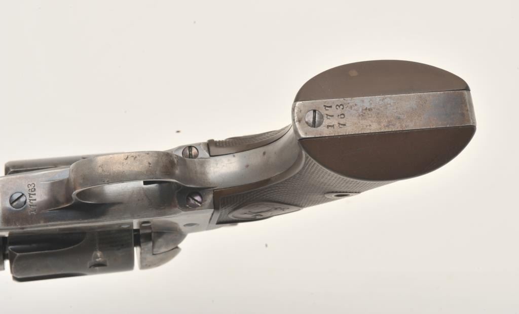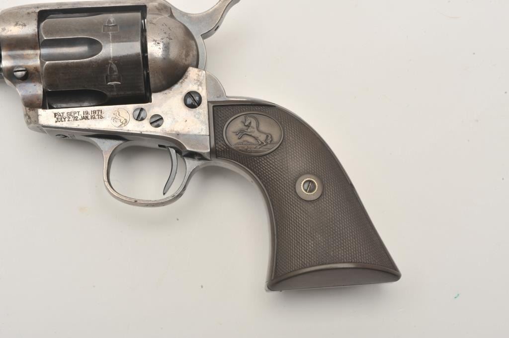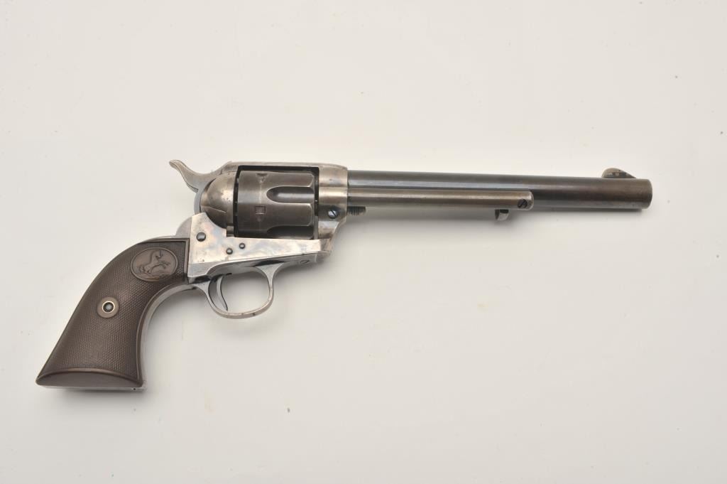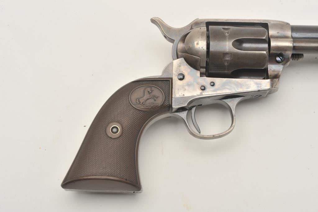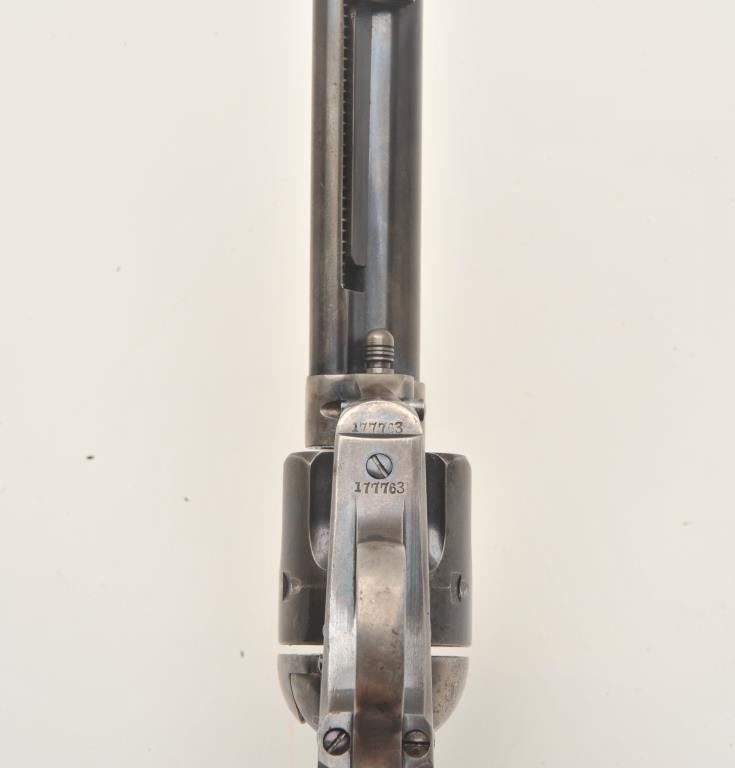 18CMT-4 COLT SAA #177763Colt SAA revolver, .38 WCF caliber, 7 ½” barrel, blue and case hardened finished, checkered hard rubber grips, Serial # 177763. Accompanied by a Colt factory letter confirming all features; sold to W.J. Brown,address unavailable, shipped to A. F. Shapleigh Hardware Company, St. Louis, Missouri on April 14, 1898, one gun in shipment. In overall very good to near fine condition with considerable original bluefinish mixed with brown patina to barrel assembly and cylinder. Considerable original case colors mixed with silver toning to frame and hammer. The bore is very good and the action is crisp with sharp markings andvery good hard rubber grips. The front sight has been replaced by what appears to be an old period replacement utilizing a silver coin. The pistol may be researchable given one gun in shipment through A.F. Shapleigh to an individual likely from the St. Louis area. Est.: $4,000-$6,000. (Antique).Colt SAA revolver, .38 WCF caliber, 7 ½” barrel, blue and case hardened finished, checkered hard rubber grips, Serial # 177763. Accompanied by a Colt factory letter confirming all features; sold to W.J. Brown,address unavailable, shipped to A. F. Shapleigh Hardware Company, St. Louis, Missouri on April 14, 1898, one gun in shipment. In overall very good to near fine condition with considerable original bluefinish mixed with brown patina to barrel assembly and cylinder. Considerable original case colors mixed with silver toning to frame and hammer. The bore is very good and the action is crisp with sharp markings andvery good hard rubber grips. The front sight has been replaced by what appears to be an old period replacement utilizing a silver coin. The pistol may be researchable given one gun in shipment through A.F. Shapleigh to an individual likely from the St. Louis area. Est.: $4,000-$6,000. (Antique).