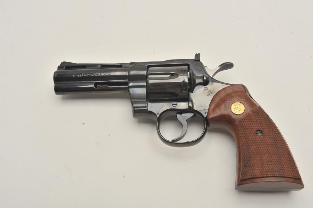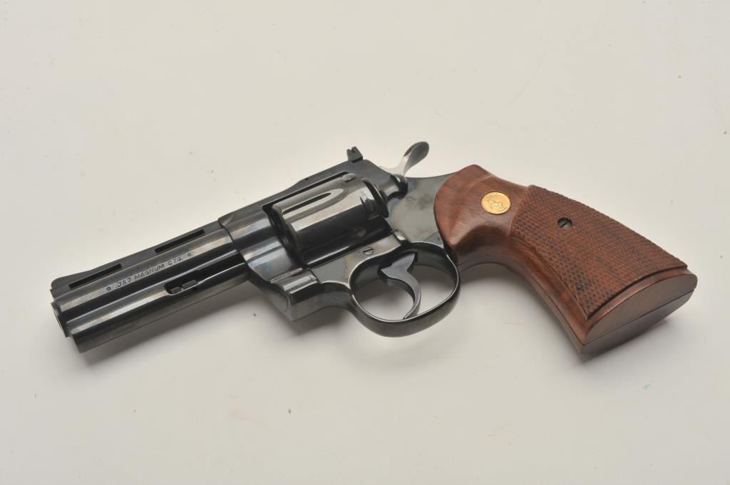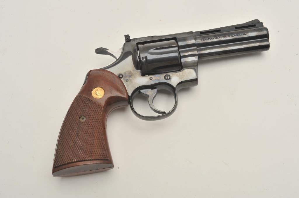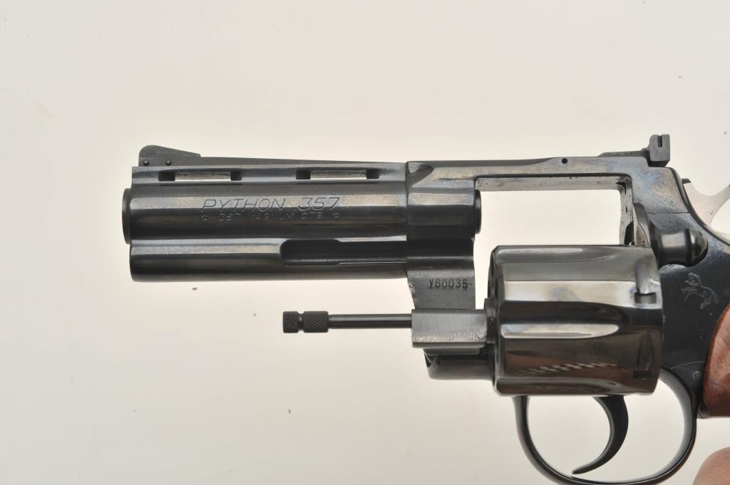 18BG-1 COLT PYTHON #160035Colt Python DA revolver, .357 Magnum caliber, 4” ventilated rib barrel, blued finish, checkered wood medallion grips, S/N V60035, in overall fine condition showing little use or handling; fine bore, action, markings andgrips. (Modern/PPT). Est.: $1,400-$2,800.Colt Python DA revolver, .357 Magnum caliber, 4” ventilated rib barrel, blued finish, checkered wood medallion grips, S/N V60035, in overall fine condition showing little use or handling; fine bore, action, markings andgrips. (Modern/PPT). Est.: $1,400-$2,800.