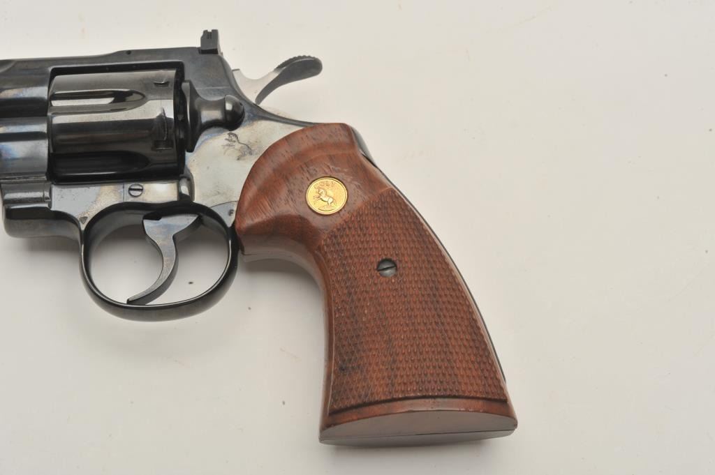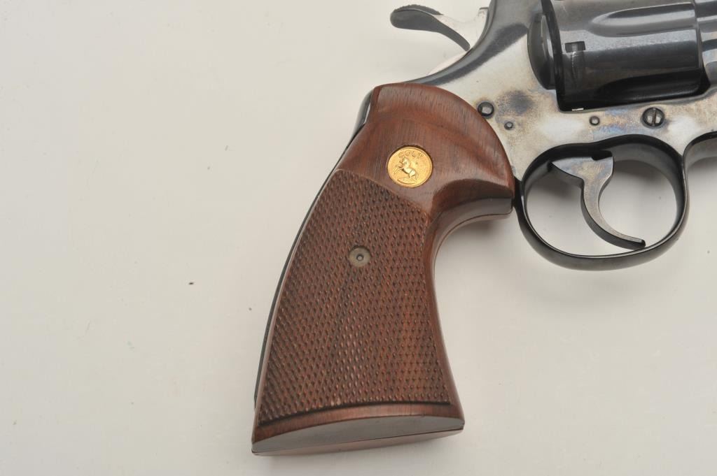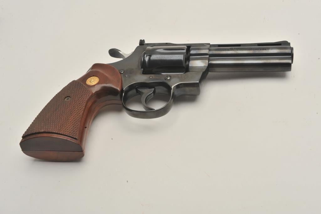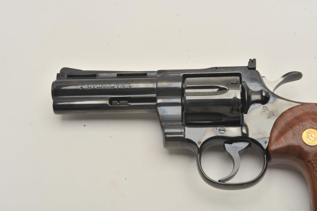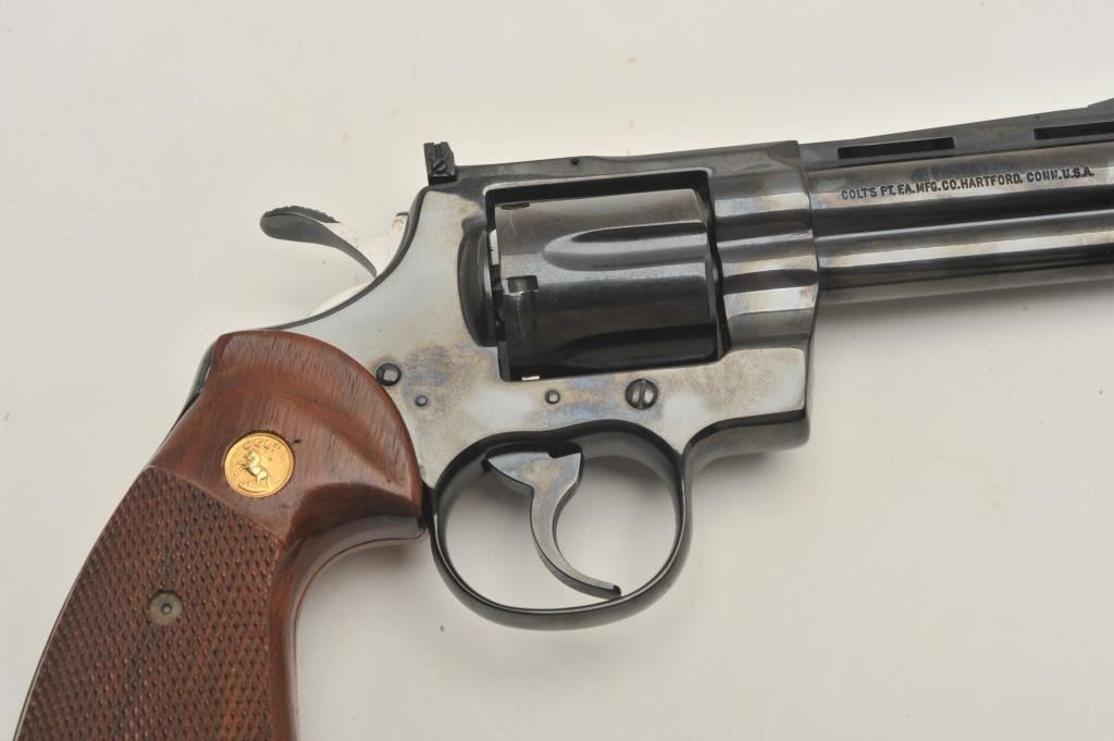 18BG-1 COLT PYTHON #160035Colt Python DA revolver, .357 Magnum caliber, 4” ventilated rib barrel, blued finish, checkered wood medallion grips, S/N V60035, in overall fine condition showing little use or handling; fine bore, action, markings andgrips. (Modern/PPT). Est.: $1,400-$2,800.Colt Python DA revolver, .357 Magnum caliber, 4” ventilated rib barrel, blued finish, checkered wood medallion grips, S/N V60035, in overall fine condition showing little use or handling; fine bore, action, markings andgrips. (Modern/PPT). Est.: $1,400-$2,800.