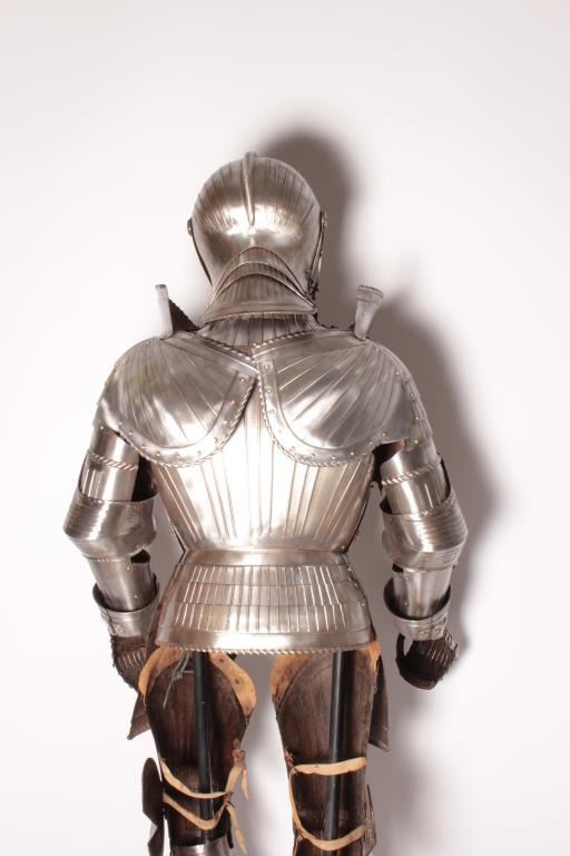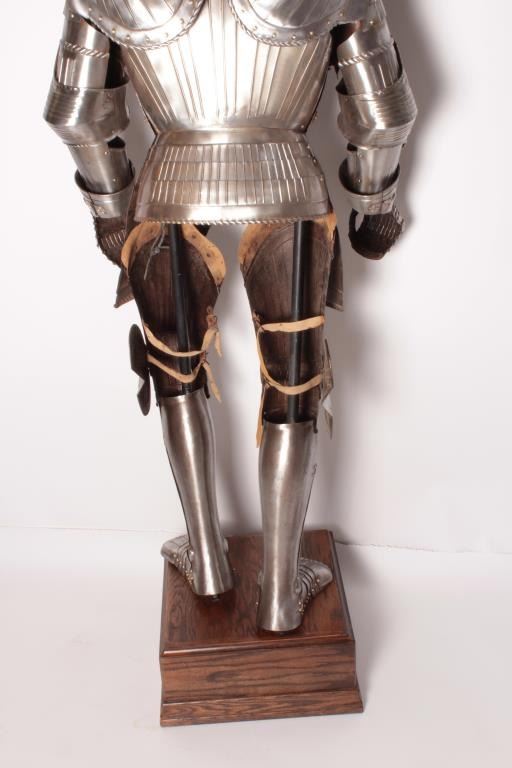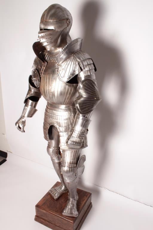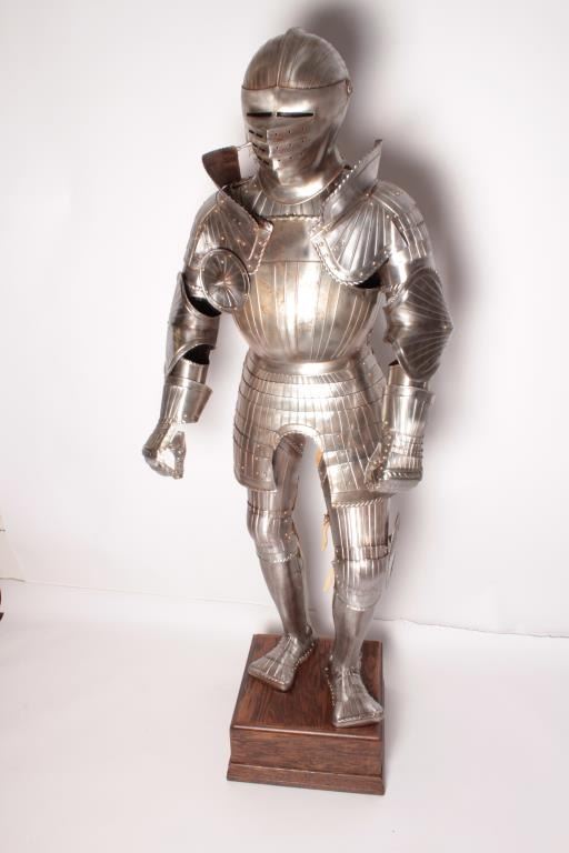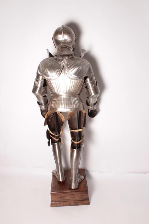 18AT-1 MAXIMILLIAN STYLE FLUTED ARMORVictorian era armourer’s copy of Maximiilin fluted armor probably by Schmidt. Finely formed and fabricated metal that is a genuine antique though not of Mid-16th century period. Several master armourer’s in Franceand Germany recreated “Castle Armour” to adorn the great halls and castles of Europe. Armor was rare and collected in the 19th century! Measures approximately 67” in height on stand. The condition is very good andstraps intact and hangs or displays well. Similar example though not as well shaped in our in opinion fetched over $20,000 in The William Ashby auction. Est.: $8,000-$16,000Victorian era armourer’s copy of Maximiilin fluted armor probably by Schmidt. Finely formed and fabricated metal that is a genuine antique though not of Mid-16th century period. Several master armourer’s in Franceand Germany recreated “Castle Armour” to adorn the great halls and castles of Europe. Armor was rare and collected in the 19th century! Measures approximately 67” in height on stand. The condition is very good andstraps intact and hangs or displays well. Similar example though not as well shaped in our in opinion fetched over $20,000 in The William Ashby auction. Est.: $8,000-$16,000