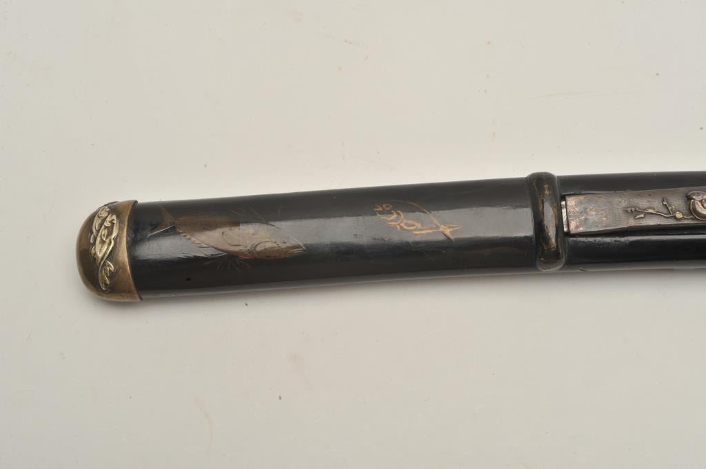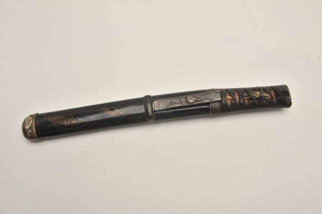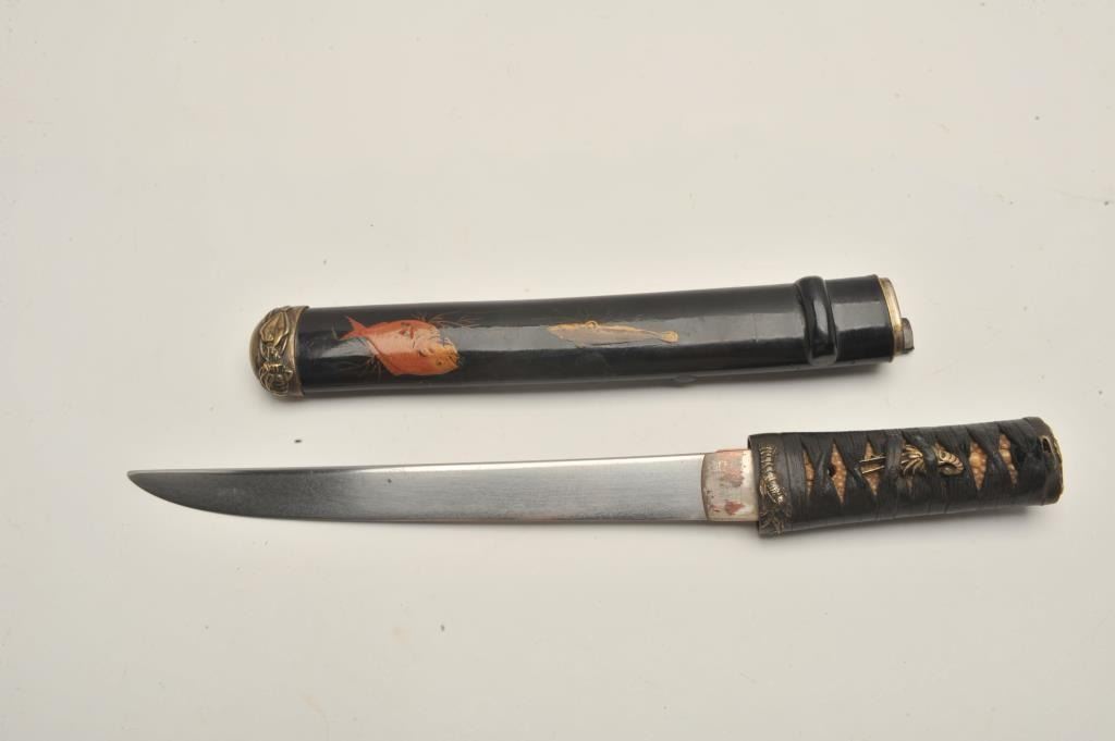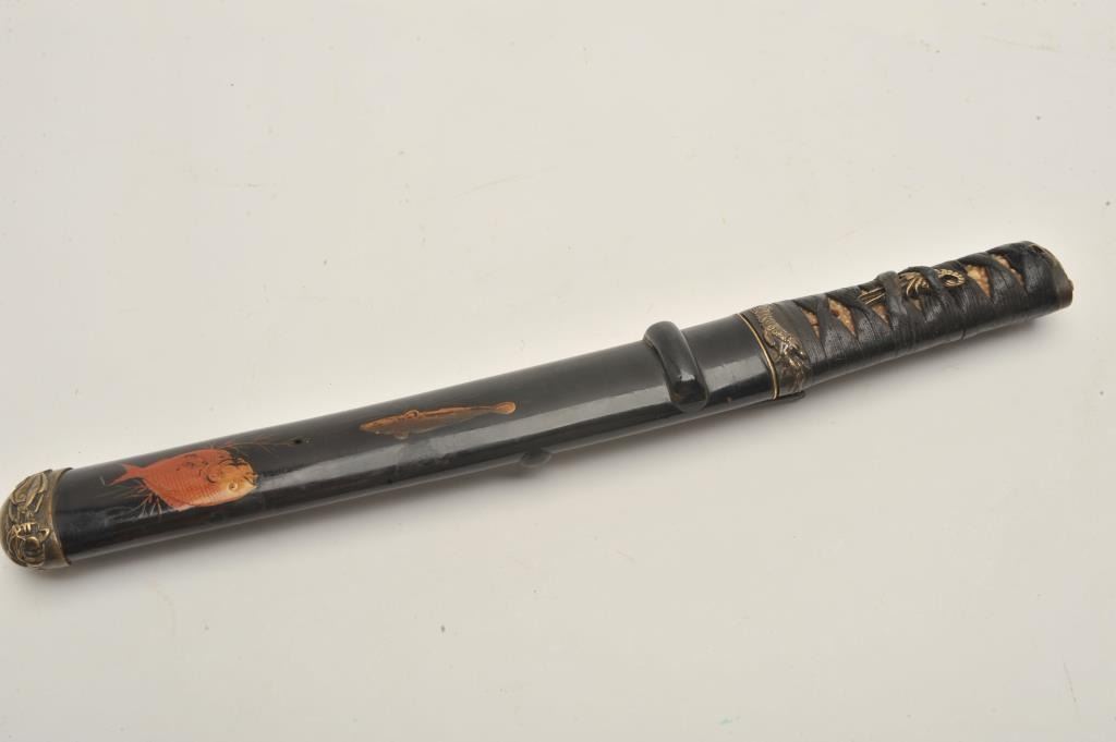 18CF-17 TANTOFully and finely mounted Japanese tanto with old family blade. 19th century soft metal mountings with matching scenes of fish, lobster, and scenes of the sea. Beautiful lacquered scabbard with fish. Mounts andscabbard are good to very good. The blade is late Koto to early Shinto and a little tired with light cleaning and no visible temper. Est.: $2000-$4000Fully and finely mounted Japanese tanto with old family blade. 19th century soft metal mountings with matching scenes of fish, lobster, and scenes of the sea. Beautiful lacquered scabbard with fish. Mounts andscabbard are good to very good. The blade is late Koto to early Shinto and a little tired with light cleaning and no visible temper. Est.: $2000-$4000