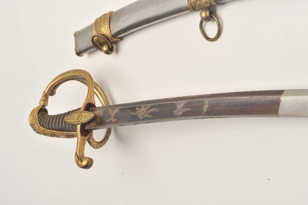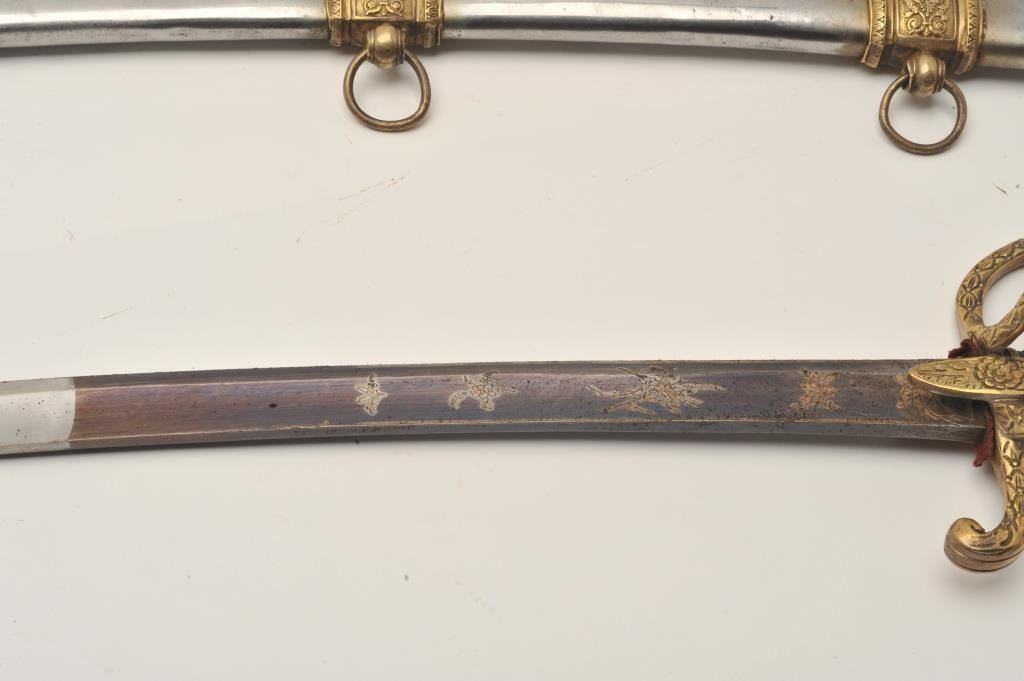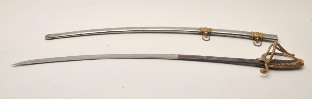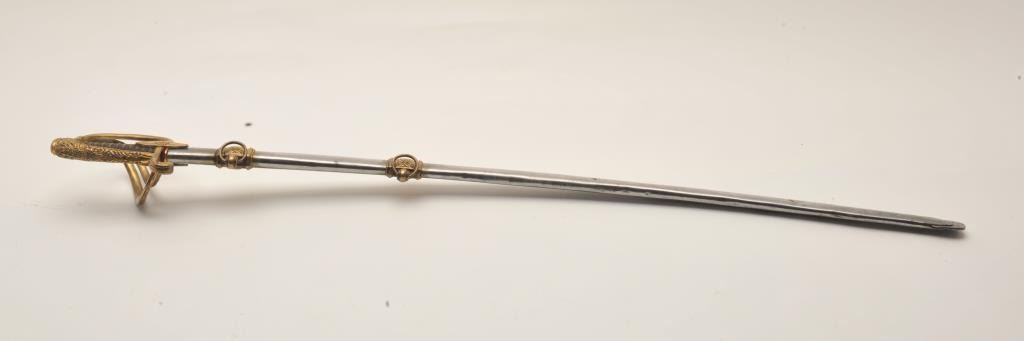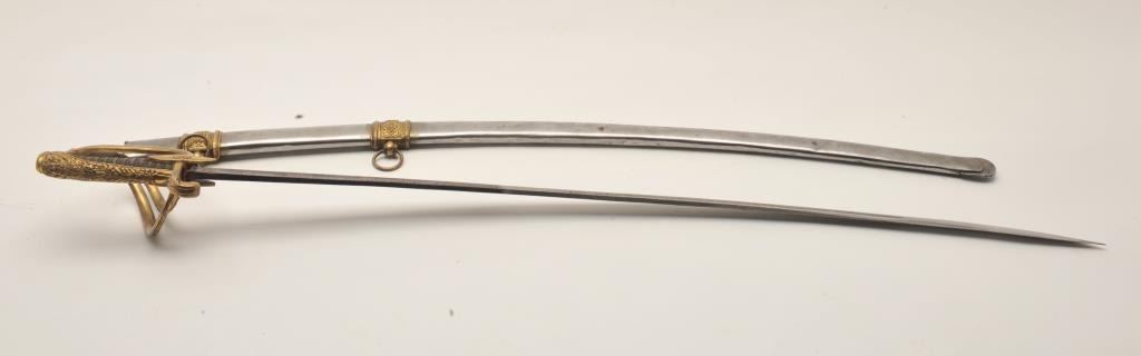 18AR-9 FRENCH 1ST EMPIRE OFFICER'SFrench 1st Empire Officer’s sword and metal scabbard with decorated hangers, approximately 38” overall with a 32.5” blade displaying blued and gold gild on top 11” of blade, decorative brass guard and pommel with wire wrapped grip; sword is in overall good to very good condition with some scattered light pitting; scabbard is good to very good with some scattered old dents and a couple small spots of surface rust. Est.:$2,500-$5,000.French 1st Empire Officer’s sword and metal scabbard with decorated hangers, approximately 38” overall with a 32.5” blade displaying blued and gold gild on top 11” of blade, decorative brass guard and pommel with wire wrapped grip; sword is in overall good to very good condition with some scattered light pitting; scabbard is good to very good with some scattered old dents and a couple small spots of surface rust. Est.:$2,500-$5,000.