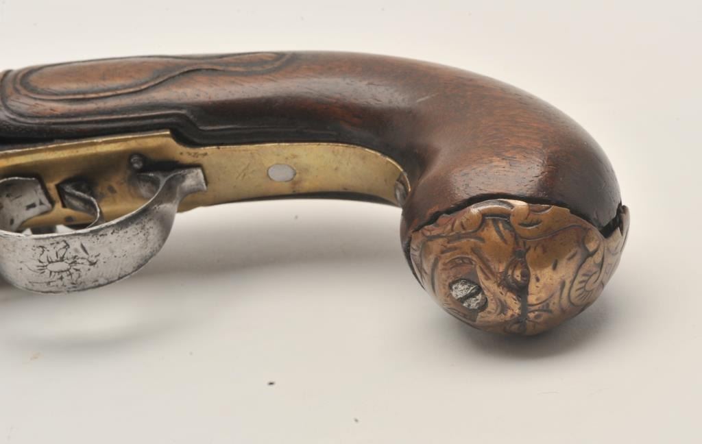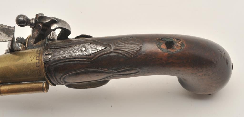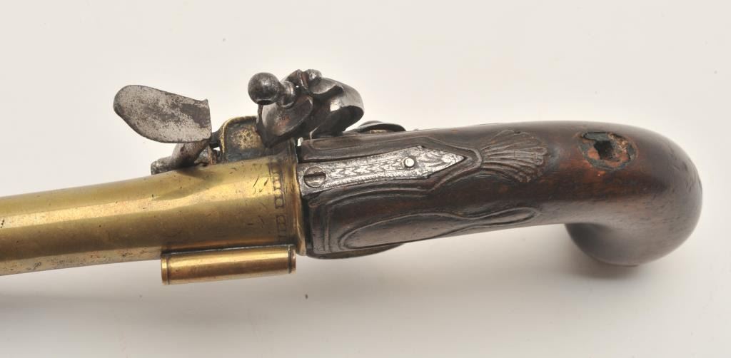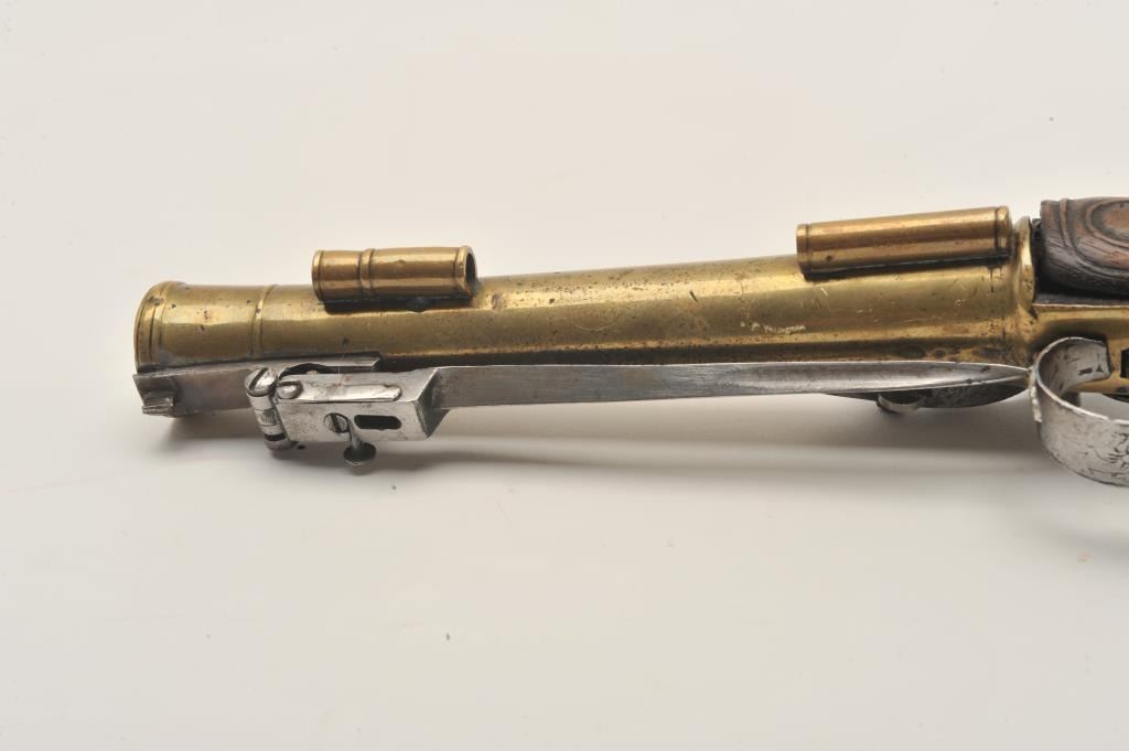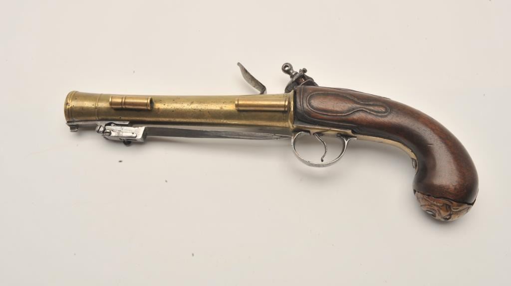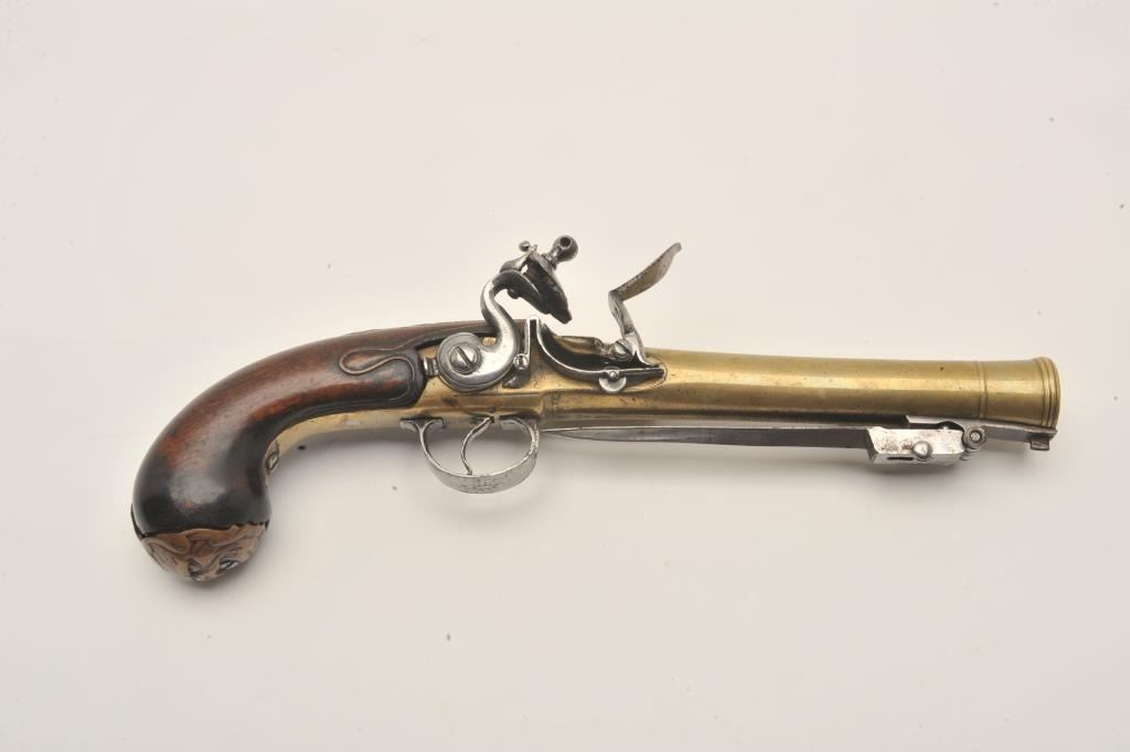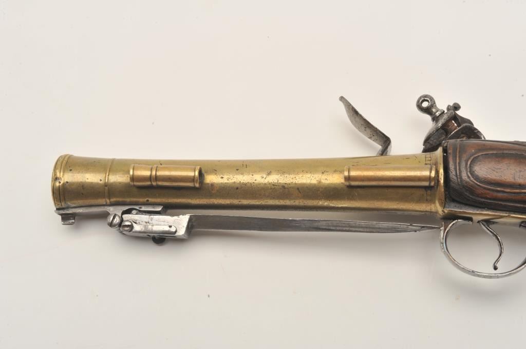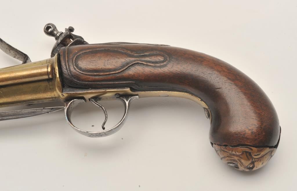 18ASS-12 BLUNDERBUSS MASK BUTTBrass barrel flintlock blunderbuss pistol with spring bayonet, wood stock, mask butt cap, approximately 13” overall with a 7” barrel; overall good condition; pleasing patina to brass barrel, action not working,stock good but missing escutcheon at top of wrist; also missing wood ramrod. (Antique). Est.: $2,000-$4,000.Brass barrel flintlock blunderbuss pistol with spring bayonet, wood stock, mask butt cap, approximately 13” overall with a 7” barrel; overall good condition; pleasing patina to brass barrel, action not working,stock good but missing escutcheon at top of wrist; also missing wood ramrod. (Antique). Est.: $2,000-$4,000.