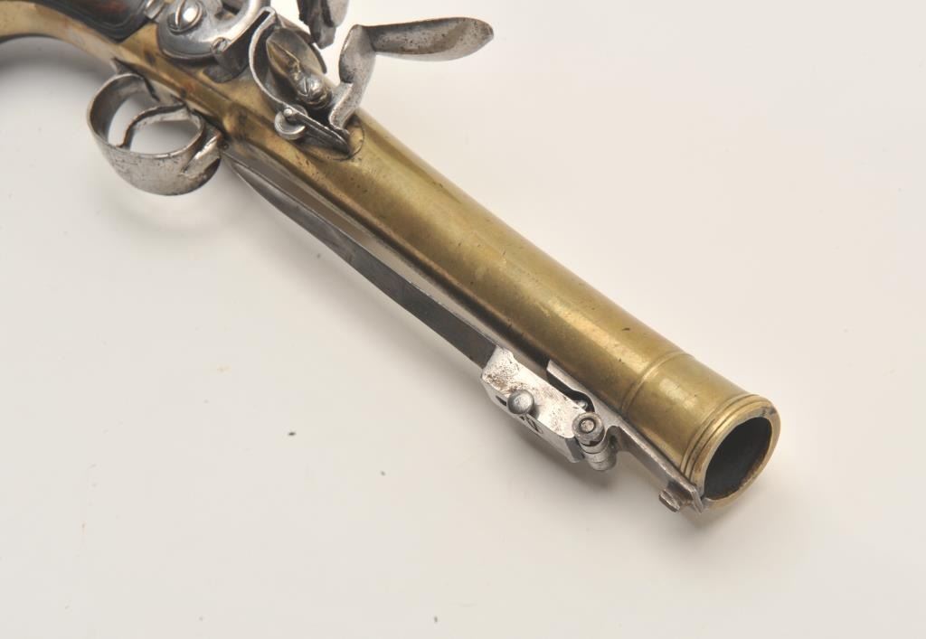 Lot 185 18ASS-12 BLUNDERBUSS MASK BUTTBrass barrel flintlock blunderbuss pistol with spring bayonet, wood s