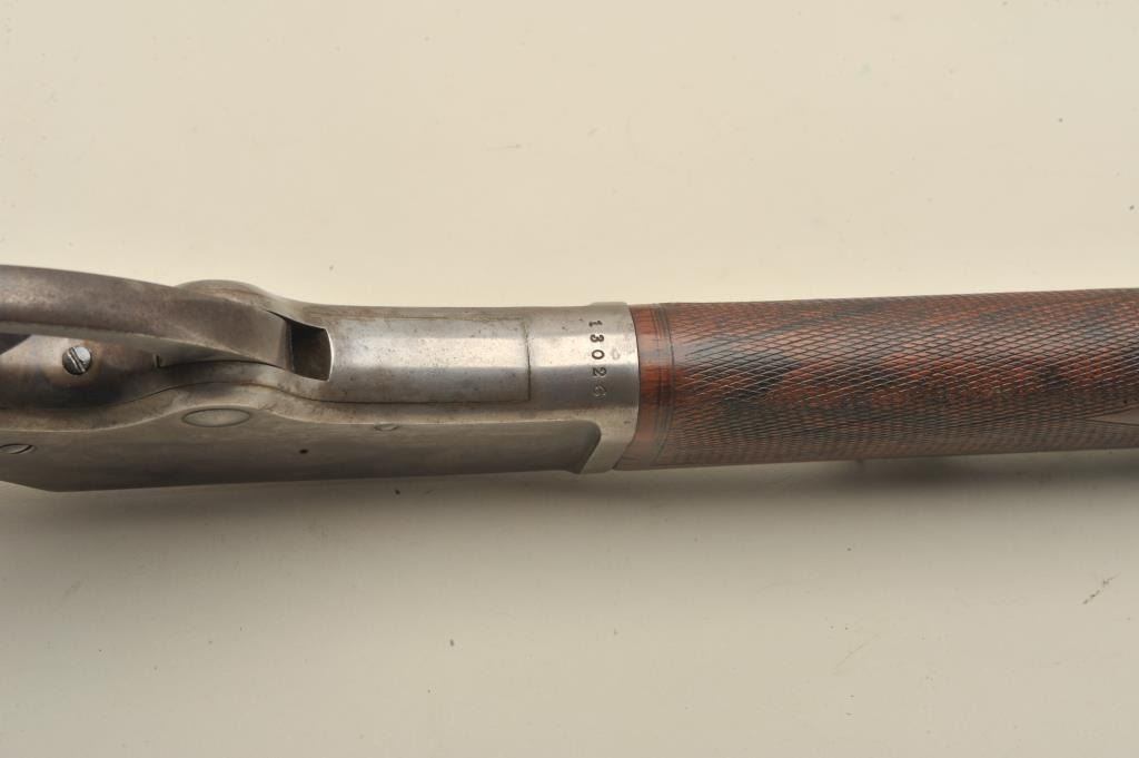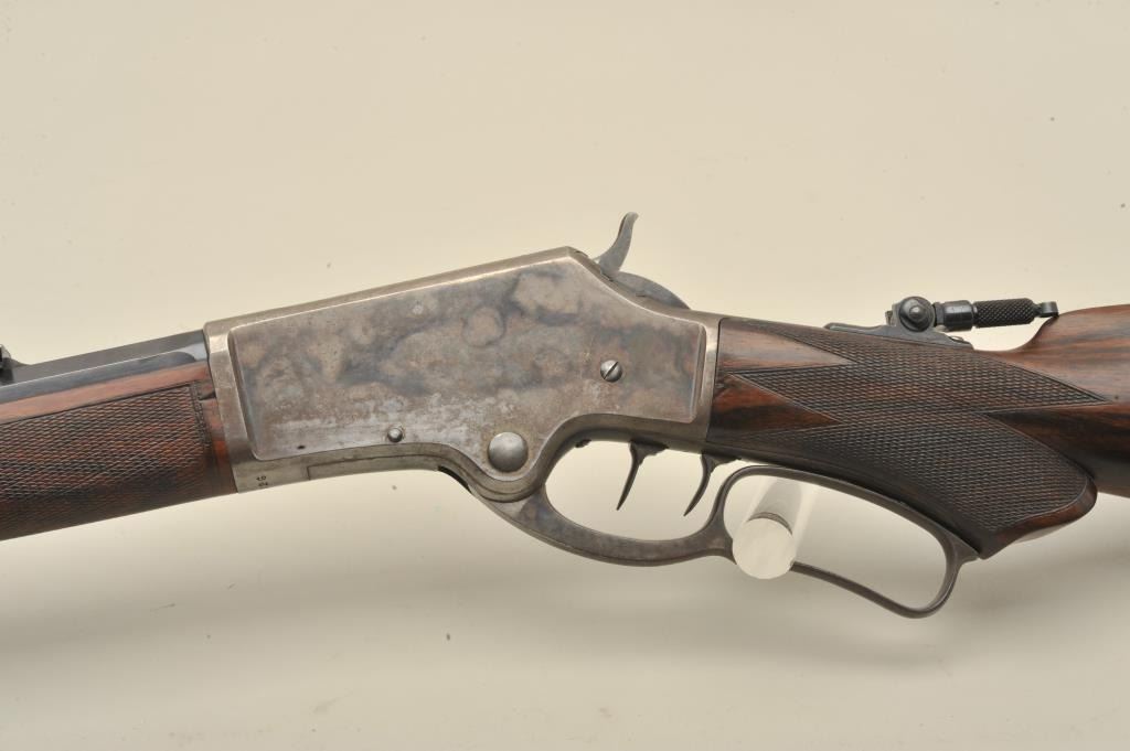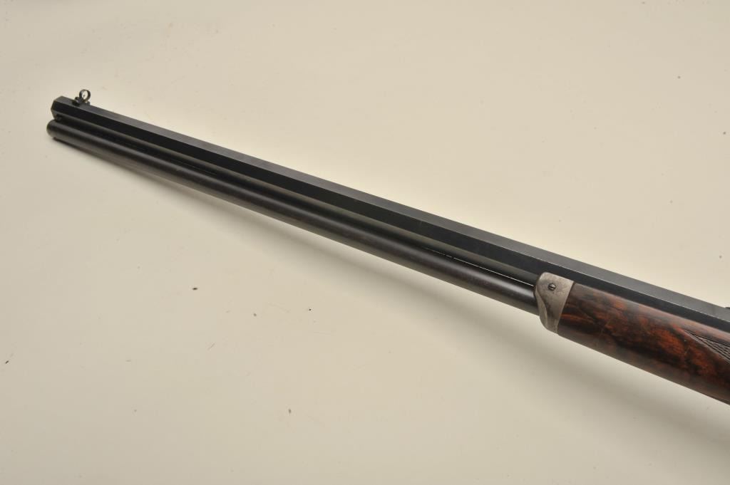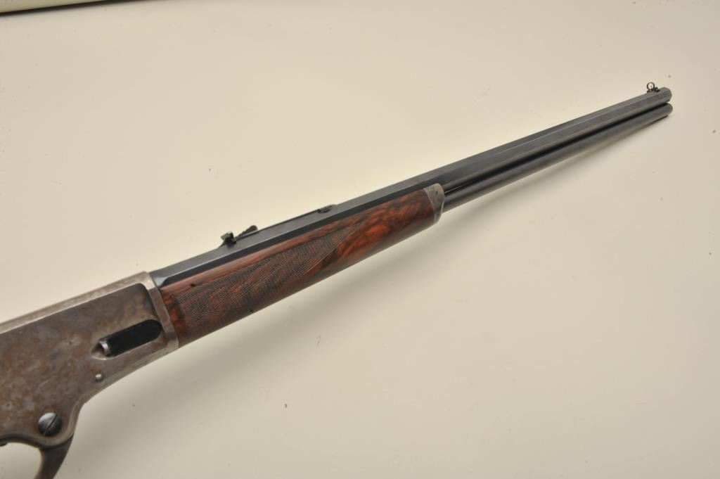 17KH-60 MARLINMarlin Model 1881 lever action rifle, .38-55 caliber, 28” octagon barrel, blued and case hardened finish, deluxe checkered semi-pistol grip wood stocks, adjustable folding tang sight and folding Beeches front sight, S/N13026, in overall very good to fine condition with majority of original blued finish on barrel and loading tube; considerable muted original case colors on receiver; double set triggers (working at time of description),near fine bore, crisp action, sharp markings and near fine beautifully grained wood stocks. (Antique). Est.: $2,000-$4,000.Marlin Model 1881 lever action rifle, .38-55 caliber, 28” octagon barrel, blued and case hardened finish, deluxe checkered semi-pistol grip wood stocks, adjustable folding tang sight and folding Beeches front sight, S/N13026, in overall very good to fine condition with majority of original blued finish on barrel and loading tube; considerable muted original case colors on receiver; double set triggers (working at time of description),near fine bore, crisp action, sharp markings and near fine beautifully grained wood stocks. (Antique). Est.: $2,000-$4,000.
