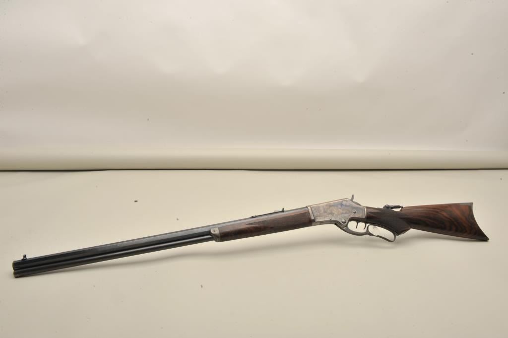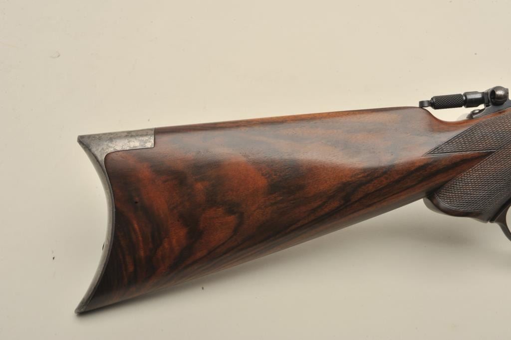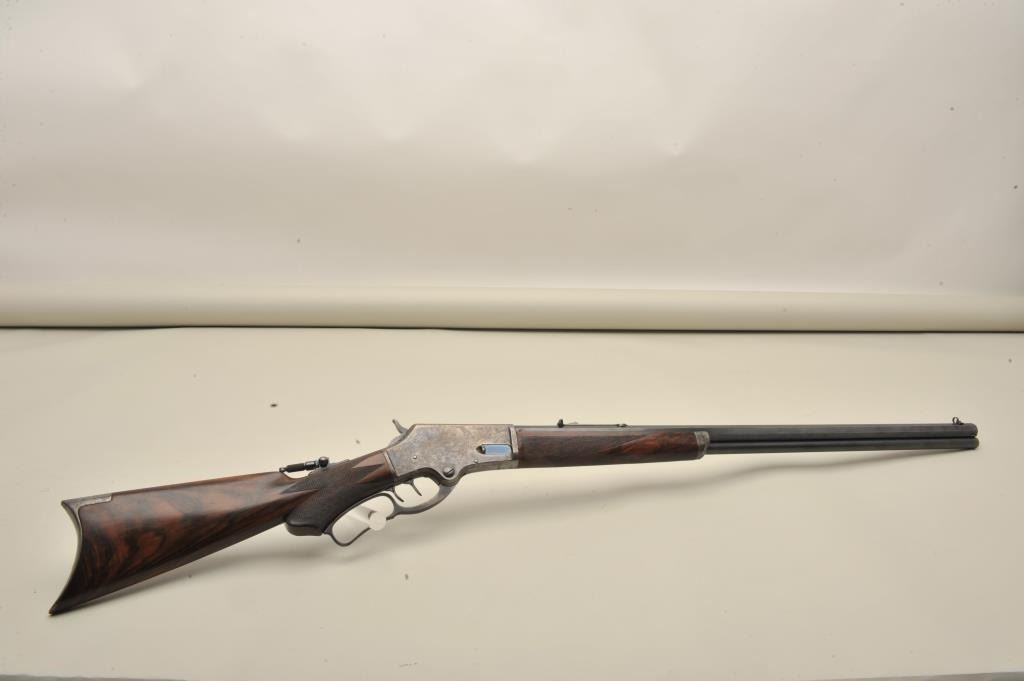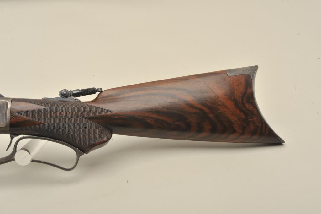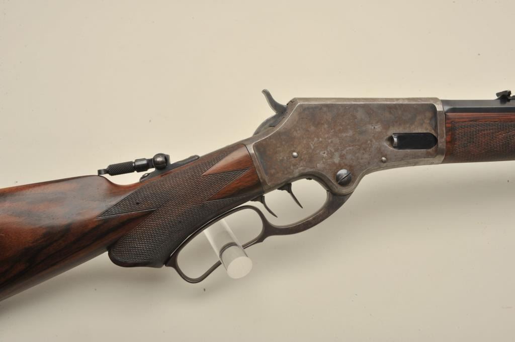 17KH-60 MARLINMarlin Model 1881 lever action rifle, .38-55 caliber, 28” octagon barrel, blued and case hardened finish, deluxe checkered semi-pistol grip wood stocks, adjustable folding tang sight and folding Beeches front sight, S/N13026, in overall very good to fine condition with majority of original blued finish on barrel and loading tube; considerable muted original case colors on receiver; double set triggers (working at time of description),near fine bore, crisp action, sharp markings and near fine beautifully grained wood stocks. (Antique). Est.: $2,000-$4,000.Marlin Model 1881 lever action rifle, .38-55 caliber, 28” octagon barrel, blued and case hardened finish, deluxe checkered semi-pistol grip wood stocks, adjustable folding tang sight and folding Beeches front sight, S/N13026, in overall very good to fine condition with majority of original blued finish on barrel and loading tube; considerable muted original case colors on receiver; double set triggers (working at time of description),near fine bore, crisp action, sharp markings and near fine beautifully grained wood stocks. (Antique). Est.: $2,000-$4,000.