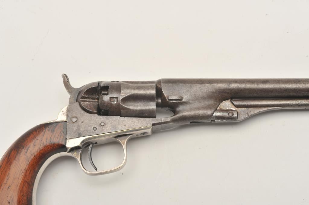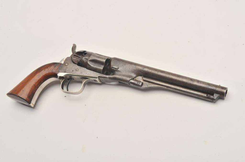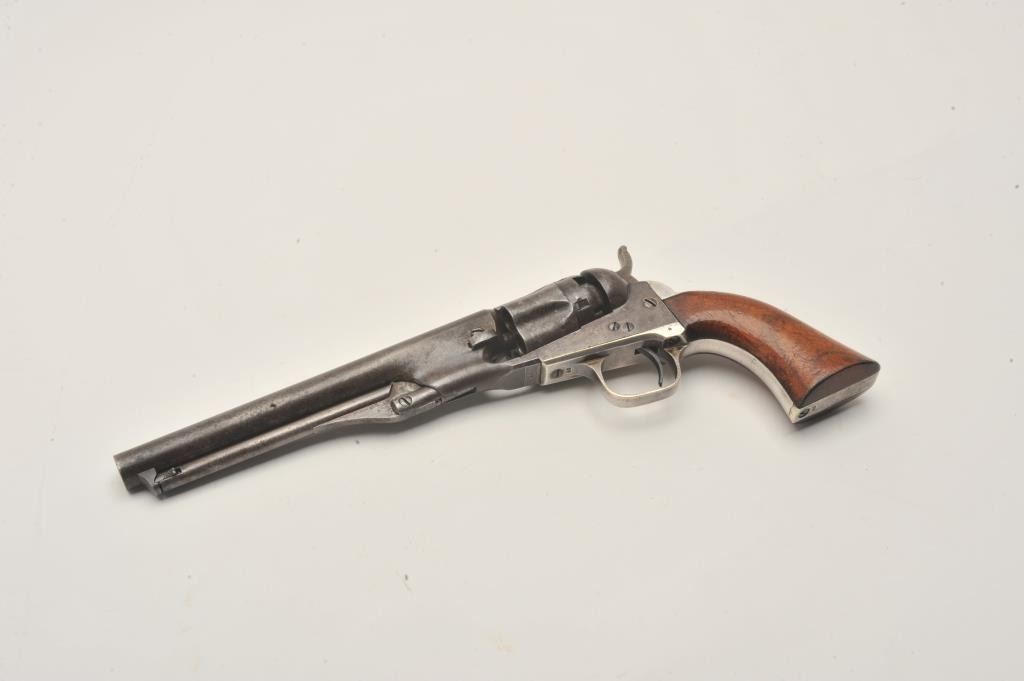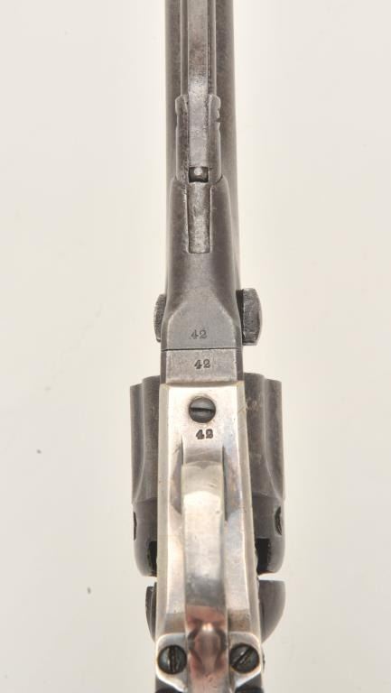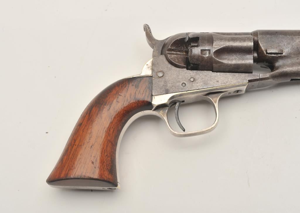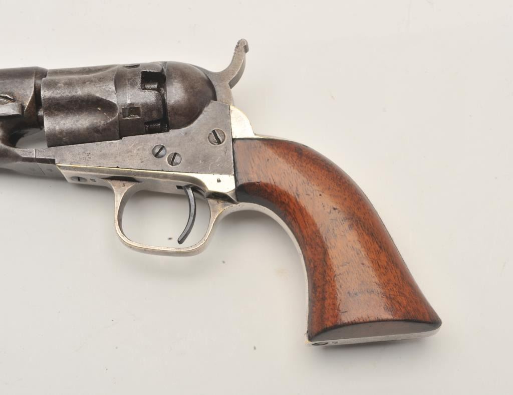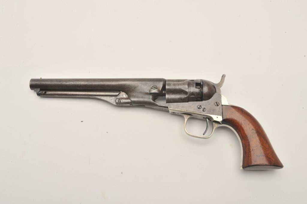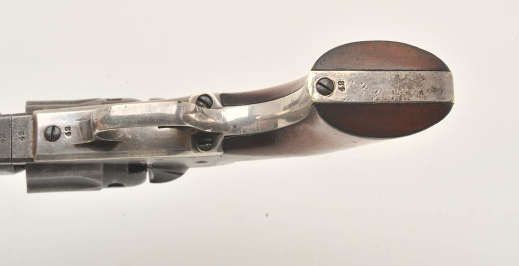 18CMT-1 COLT 1862 #42Colt Model 1862 Police percussion revolver, .36 caliber, desirable 6 ½” barrel, wood grips, Serial #42. The pistol is in very good overall condition with an overall grey/brown patina, muted case hardening onthe frame and approximately 90% of the silver still on the straps. The barrel is Hartford marked and the serial number 42 is visible in one of the cylinder flutes. The smooth wood grips retain a significant amount of the original varnish and all visible serial numbers are matching. There is a small amount of pin prick pitting noted on the barrel and rammer. The action functions crisply and the bore is good. A nice honestearly two digit serial number Colt circa 1861. Est.: $2,500-$4,000. (Antique).Colt Model 1862 Police percussion revolver, .36 caliber, desirable 6 ½” barrel, wood grips, Serial #42. The pistol is in very good overall condition with an overall grey/brown patina, muted case hardening onthe frame and approximately 90% of the silver still on the straps. The barrel is Hartford marked and the serial number 42 is visible in one of the cylinder flutes. The smooth wood grips retain a significant amount of the original varnish and all visible serial numbers are matching. There is a small amount of pin prick pitting noted on the barrel and rammer. The action functions crisply and the bore is good. A nice honestearly two digit serial number Colt circa 1861. Est.: $2,500-$4,000. (Antique).