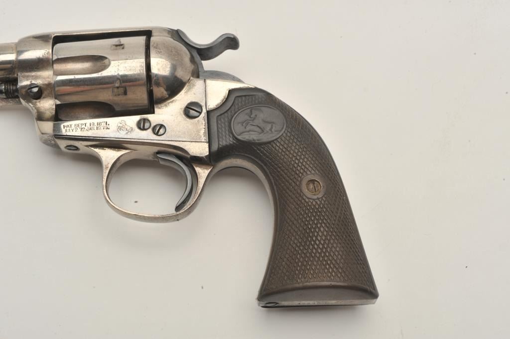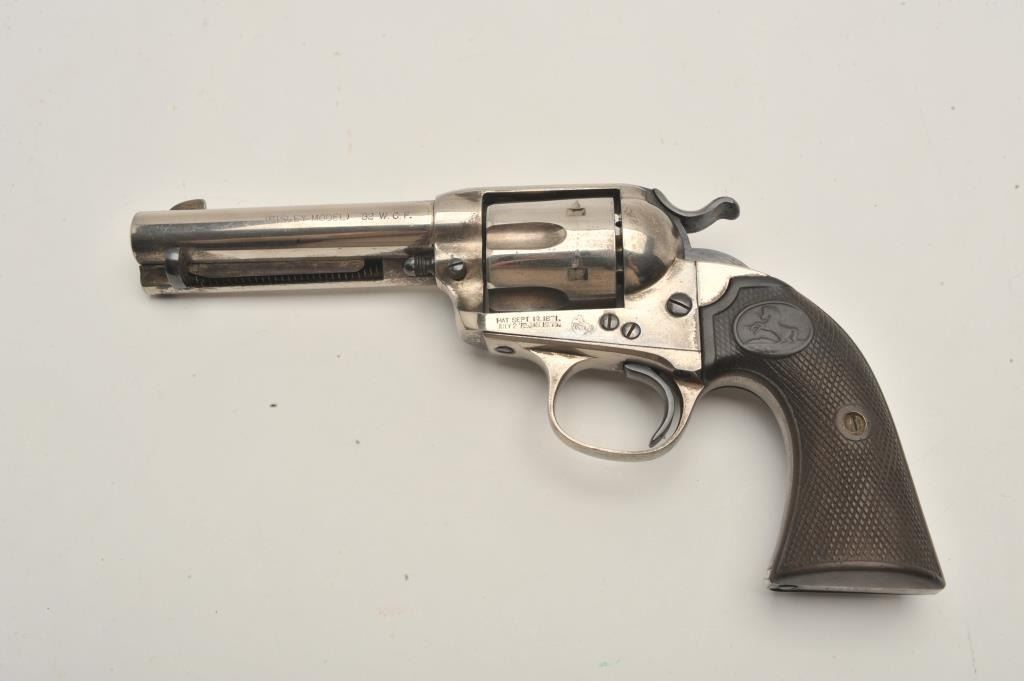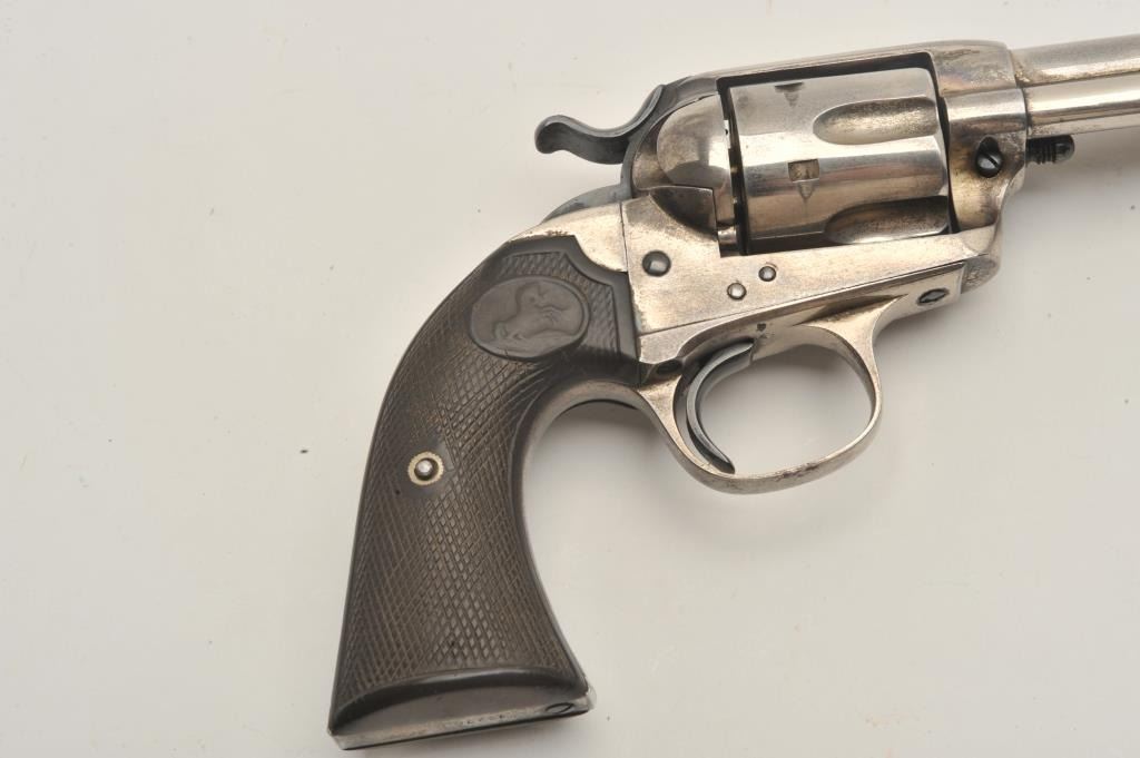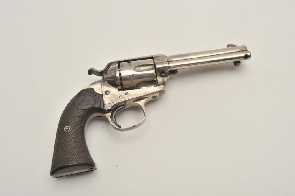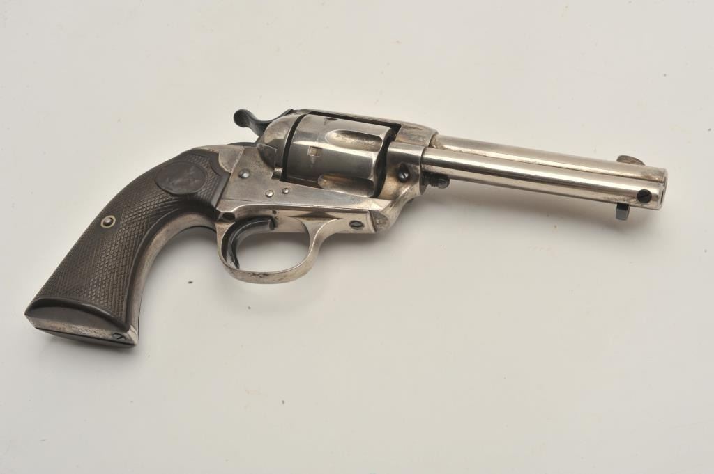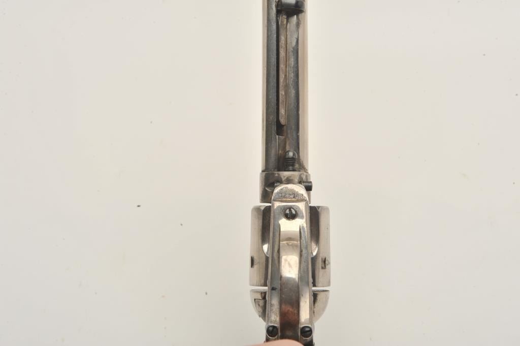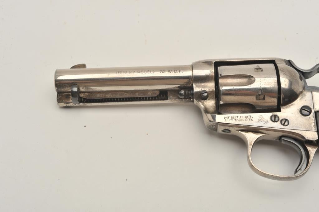 18BG-5 COLT BISLEY #122768Colt Bisley Model single action revolver, .32 W.C.F. caliber, 4.75” barrel, re-nickeled finish with re-stamped serial numbers 122768; overall good condition with crisp action, good markings and good checkered hard rubbergrips; accompanied by a copy of a hand written letter dated Feb. 11, 1959, stating “I C.R. Pettit certify that in May-1956 I received from Senor Roberto Gonzalez y Cardenas (General Cautu) and one time memberof the staff of Pancho Villa, two silver plated Colt Bisley .32-20 Single Action Revolvers No. 283822 (not included in lot) and No. 122768. These are the same guns sold to Mr. M. B. Taylor of Long Beach”.Signed, “C.R. Pettit”. (C&R/PPT). Est.: $1,500-$3,000.Colt Bisley Model single action revolver, .32 W.C.F. caliber, 4.75” barrel, re-nickeled finish with re-stamped serial numbers 122768; overall good condition with crisp action, good markings and good checkered hard rubbergrips; accompanied by a copy of a hand written letter dated Feb. 11, 1959, stating “I C.R. Pettit certify that in May-1956 I received from Senor Roberto Gonzalez y Cardenas (General Cautu) and one time memberof the staff of Pancho Villa, two silver plated Colt Bisley .32-20 Single Action Revolvers No. 283822 (not included in lot) and No. 122768. These are the same guns sold to Mr. M. B. Taylor of Long Beach”.Signed, “C.R. Pettit”. (C&R/PPT). Est.: $1,500-$3,000.
