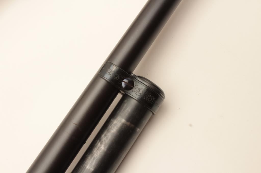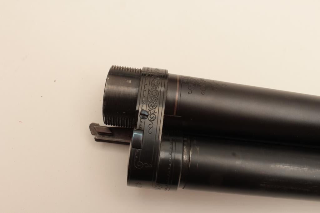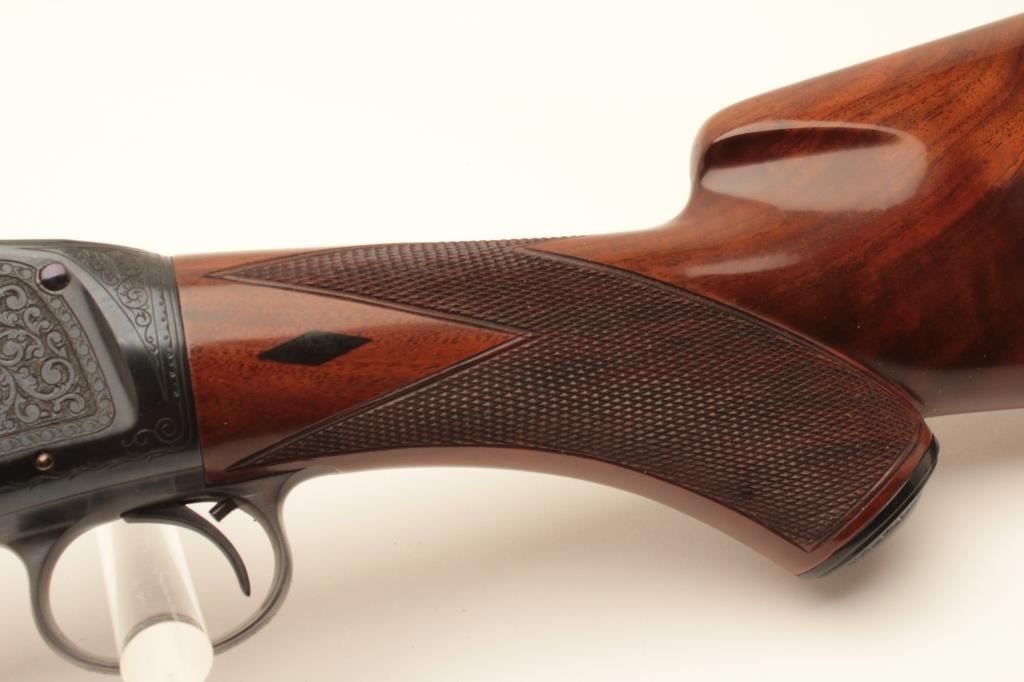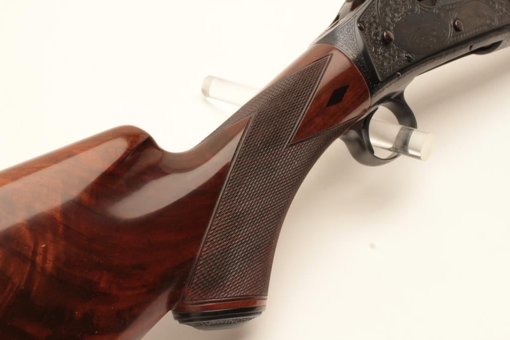 18BG-9 WINCHESTER MDL 97 #433801Rare Winchester Model 1897 Black Diamond pump action takedown shotgun, “E” factory style engraved, two barrel set (each barrel banded; one barrel is 30”, full choke; other barrel is 26”, cylinder choke), 2 forearms,re-finished blued and deluxe checkered wood stocks with black diamond inlays on both sides of wrist, red hard rubber butt pad, S/N E433801, in overall very good to near fine condition as restored; panel game scenes onboth sides of receiver, both bores are very good to near fine condition, near fine deluxe checkered wood butt stock and forends displaying beautiful graining. (C&R/PPT). Est.: $2,500-$5,000.Rare Winchester Model 1897 Black Diamond pump action takedown shotgun, “E” factory style engraved, two barrel set (each barrel banded; one barrel is 30”, full choke; other barrel is 26”, cylinder choke), 2 forearms,re-finished blued and deluxe checkered wood stocks with black diamond inlays on both sides of wrist, red hard rubber butt pad, S/N E433801, in overall very good to near fine condition as restored; panel game scenes onboth sides of receiver, both bores are very good to near fine condition, near fine deluxe checkered wood butt stock and forends displaying beautiful graining. (C&R/PPT). Est.: $2,500-$5,000.
