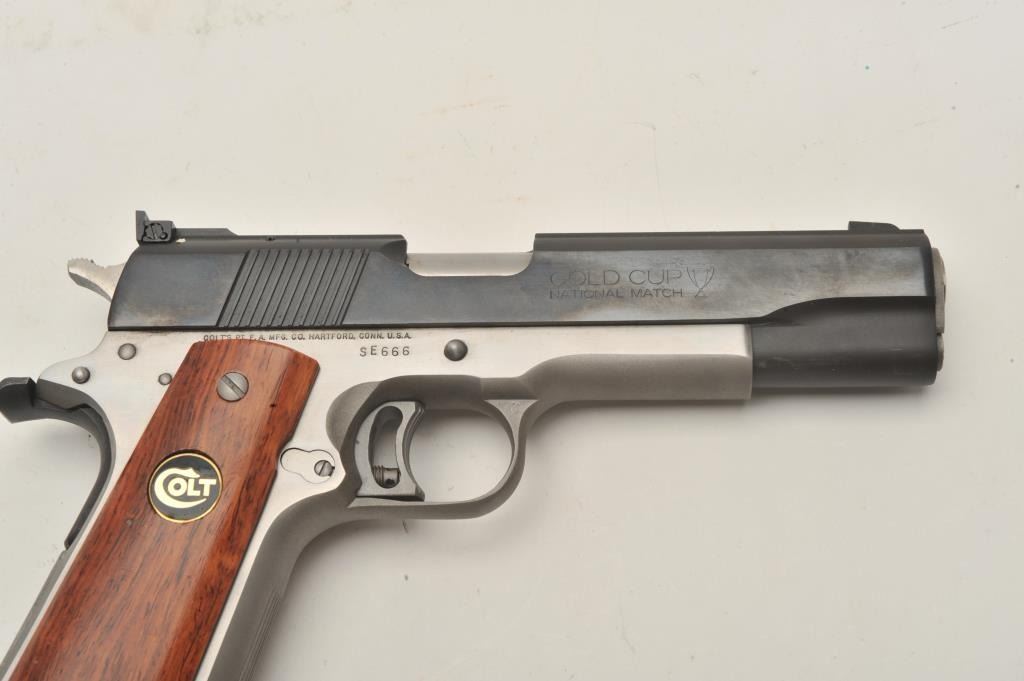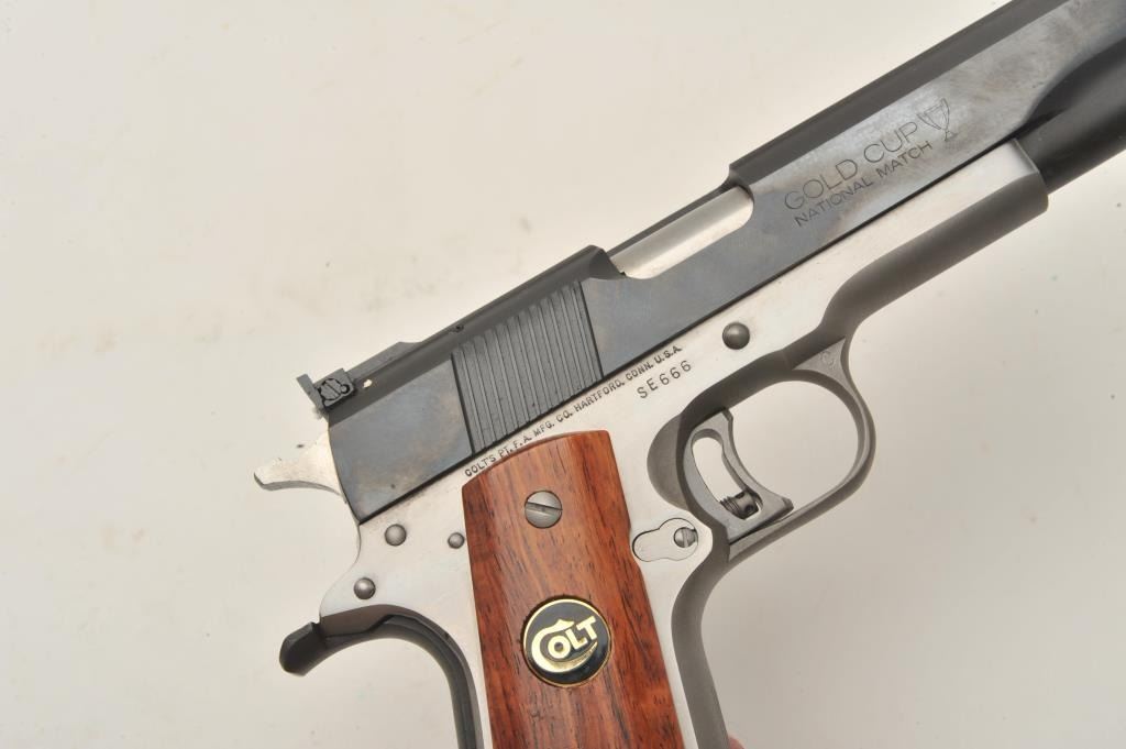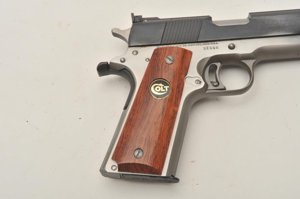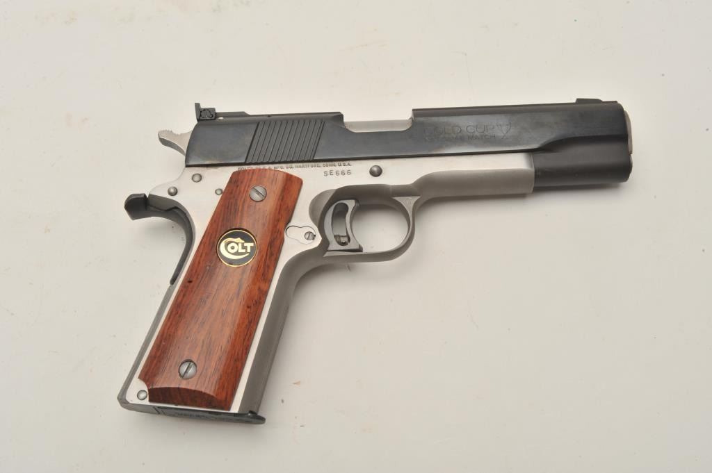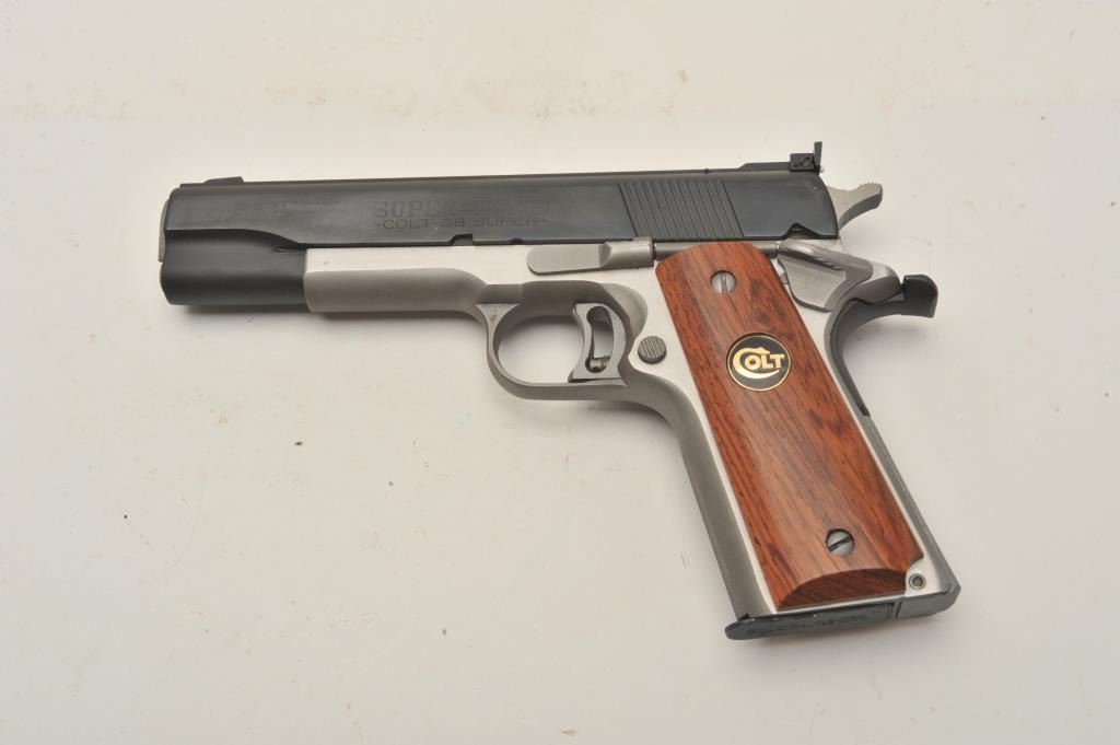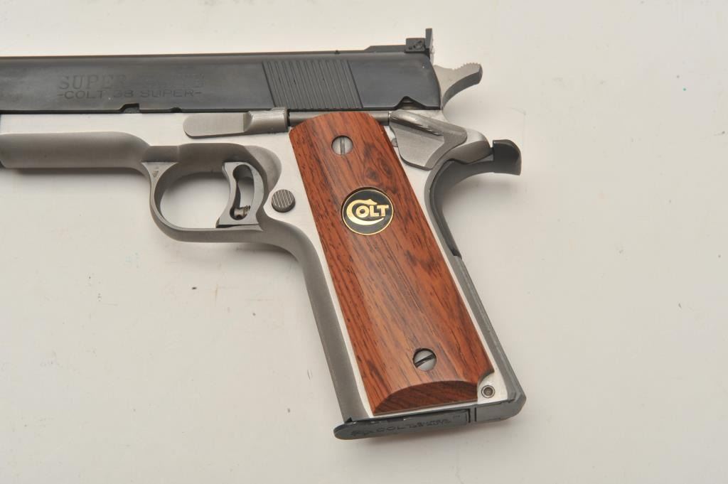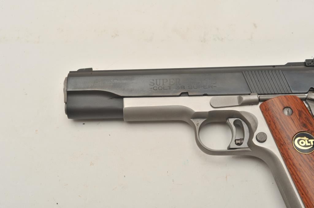 18BM-21 COLT SUPER ELITEColt Super Elite .38 Super Gold Cup, #SE666, two tone with stainless frame and blued slide, 5" barrel, adjustable sights, adjustable trigger with smooth medallion grips. Pistol is in excellent conditionoverall, excellent bore and action. Includes original box in very good condition, manual and one mag. (Modern / PPT) Est. $1250-2500Colt Super Elite .38 Super Gold Cup, #SE666, two tone with stainless frame and blued slide, 5" barrel, adjustable sights, adjustable trigger with smooth medallion grips. Pistol is in excellent conditionoverall, excellent bore and action. Includes original box in very good condition, manual and one mag. (Modern / PPT) Est. $1250-2500