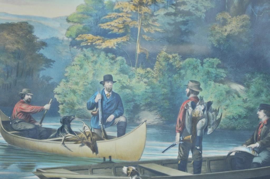 EVE-27 CURRIER AND IVES PRINTCurrier and Ives print (Hand Colored) and titled “Life in the Woods” “Returning to Camp” dated 1860. The artwork measures 19” x 27 ½” inside to border, 24” x 31 ½” frame and 29 ½” x 36 ½” to the outside. The conditionis near fine and very nicely framed. The estate of Eric Vaule. Est.: $750-$1500Currier and Ives print (Hand Colored) and titled “Life in the Woods” “Returning to Camp” dated 1860. The artwork measures 19” x 27 ½” inside to border, 24” x 31 ½” frame and 29 ½” x 36 ½” to the outside. The conditionis near fine and very nicely framed. The estate of Eric Vaule. Est.: $750-$1500