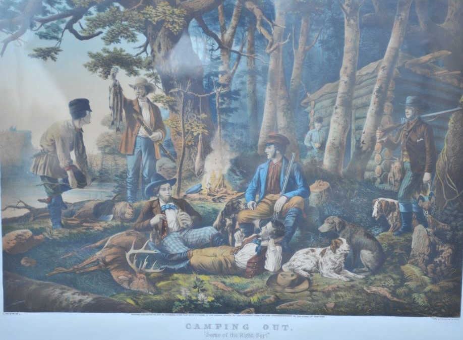 EVE-28 CURRIER & IVES PRINTFramed to match last lot and in same series. Currier and Ives 1856 dated and titled “Camping out, some of the right sort”. Artist signed in block “L. Maurer Del”. A great scene of hunting camp with dogs. Near finecondition with minor warping. The colors are vivid. Very impressive. The estate of Eric Vaule. Est.: $1000-$2000Framed to match last lot and in same series. Currier and Ives 1856 dated and titled “Camping out, some of the right sort”. Artist signed in block “L. Maurer Del”. A great scene of hunting camp with dogs. Near finecondition with minor warping. The colors are vivid. Very impressive. The estate of Eric Vaule. Est.: $1000-$2000