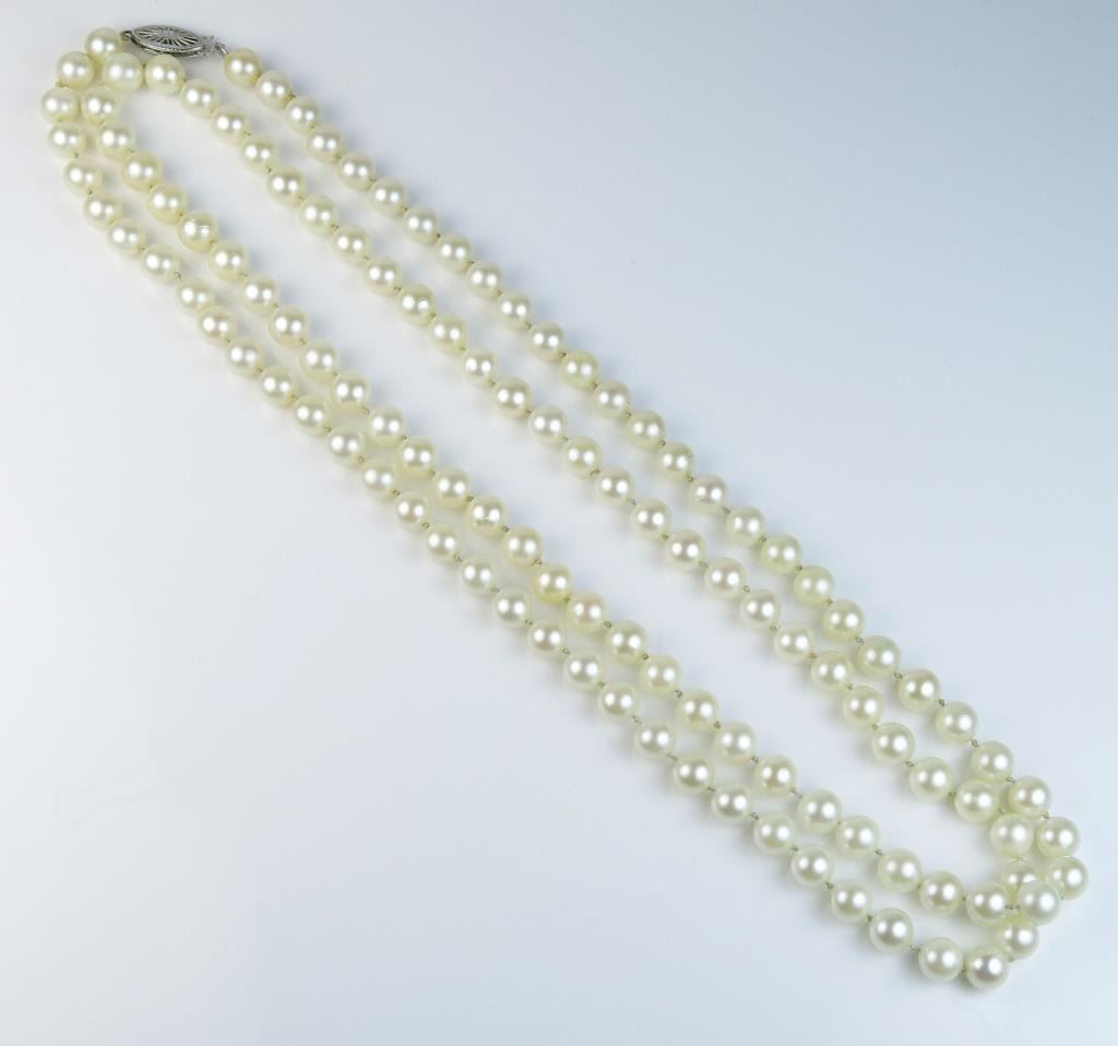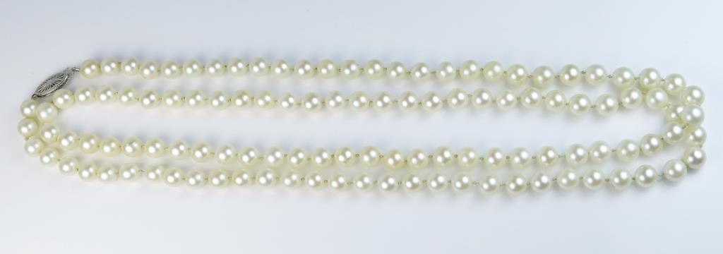 18CAI-51 PEARL NECKLACEElegant Vintage style cultured pearls averaging 6.00 MM in diameters of a fine luster and color and 32 inches in length and 14 karat white clasp. Estimates $600-$900Elegant Vintage style cultured pearls averaging 6.00 MM in diameters of a fine luster and color and 32 inches in length and 14 karat white clasp. Estimates $600-$900