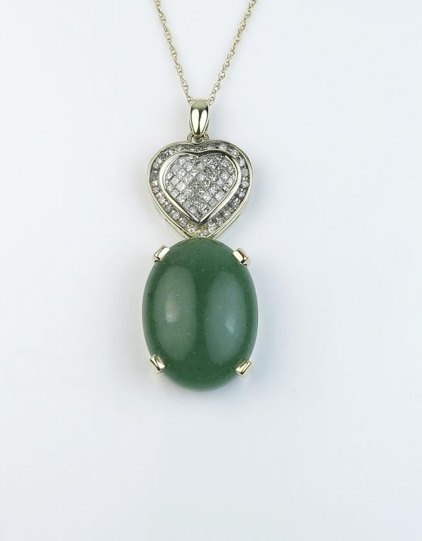 18CAI-52 JADEITE/JADE PENDANTElegant pendant featured a green Jadeite/ Jade weighing 14.30 carats and approx. 1.00 carat in princess and round cut Diamonds of H-I colors and VS/SI clarity set in 14/10 karat yellow gold. Estimates $1,500-$2,000Elegant pendant featured a green Jadeite/ Jade weighing 14.30 carats and approx. 1.00 carat in princess and round cut Diamonds of H-I colors and VS/SI clarity set in 14/10 karat yellow gold. Estimates $1,500-$2,000