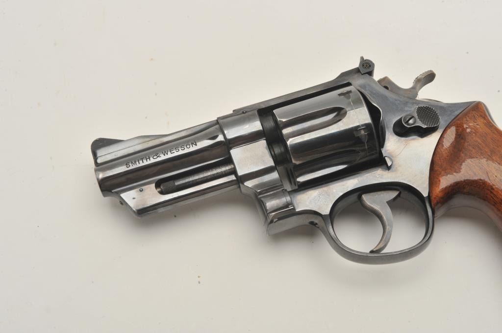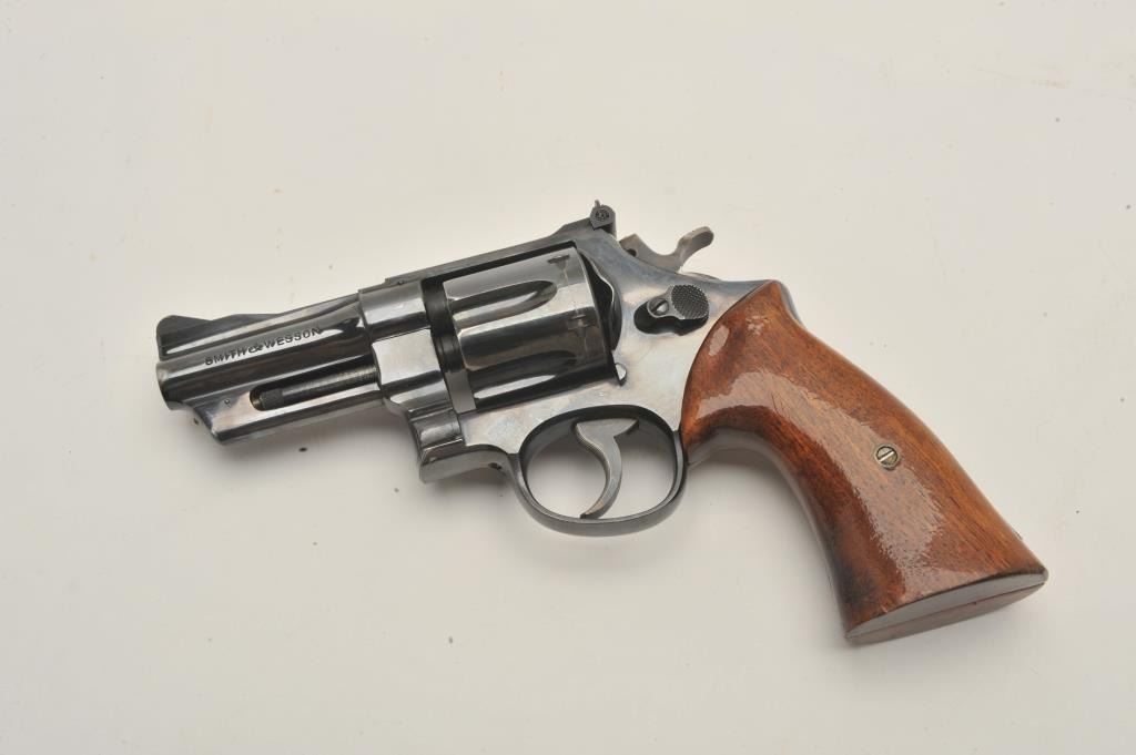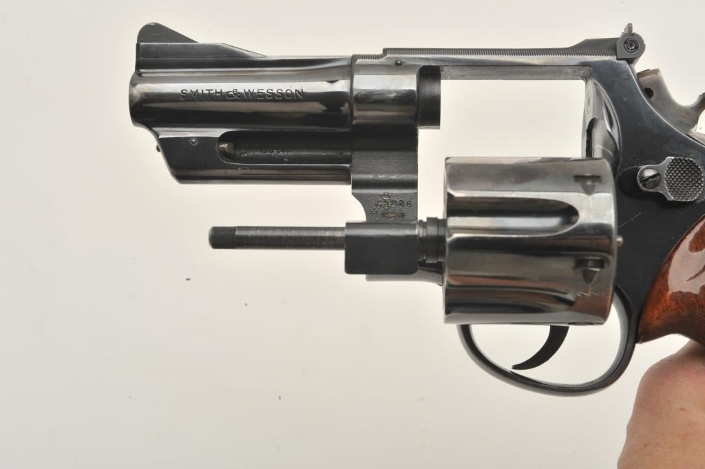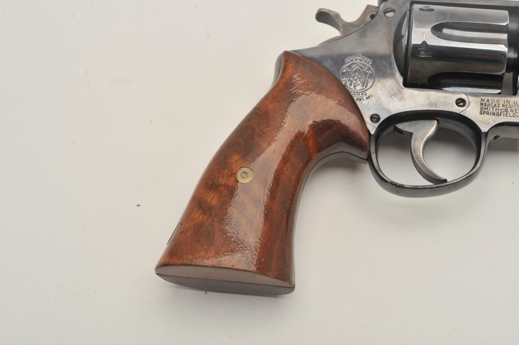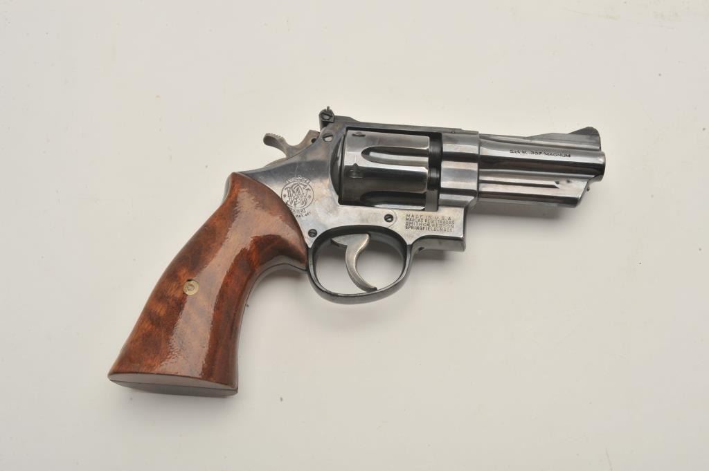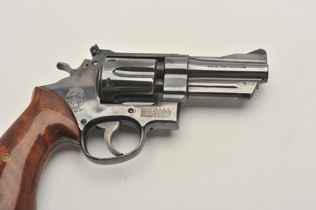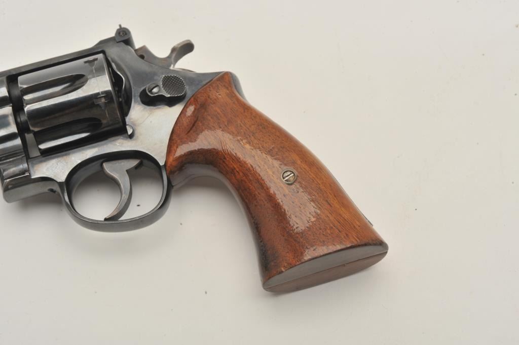 18BG-2 S&W PRE 27Smith & Wesson pre-Model 27 5-screw DA revolver, .357 Magnum caliber, 3.5” barrel, blued finish, replacement wood combat grips, S/N 138648, in overall fine condition with majority of original blued finish remaining,some high point and muzzle wear, crisp action, fine bore, sharp markings and very good to fine grips. (C&R/PPT). Est.: $900-$1,800.Smith & Wesson pre-Model 27 5-screw DA revolver, .357 Magnum caliber, 3.5” barrel, blued finish, replacement wood combat grips, S/N 138648, in overall fine condition with majority of original blued finish remaining,some high point and muzzle wear, crisp action, fine bore, sharp markings and very good to fine grips. (C&R/PPT). Est.: $900-$1,800.