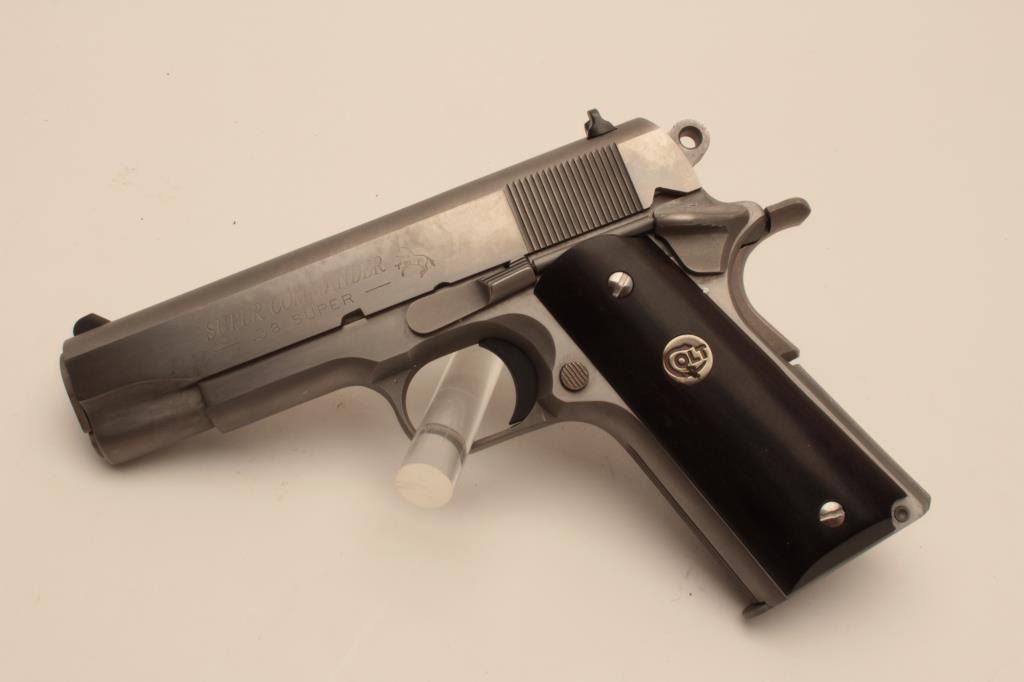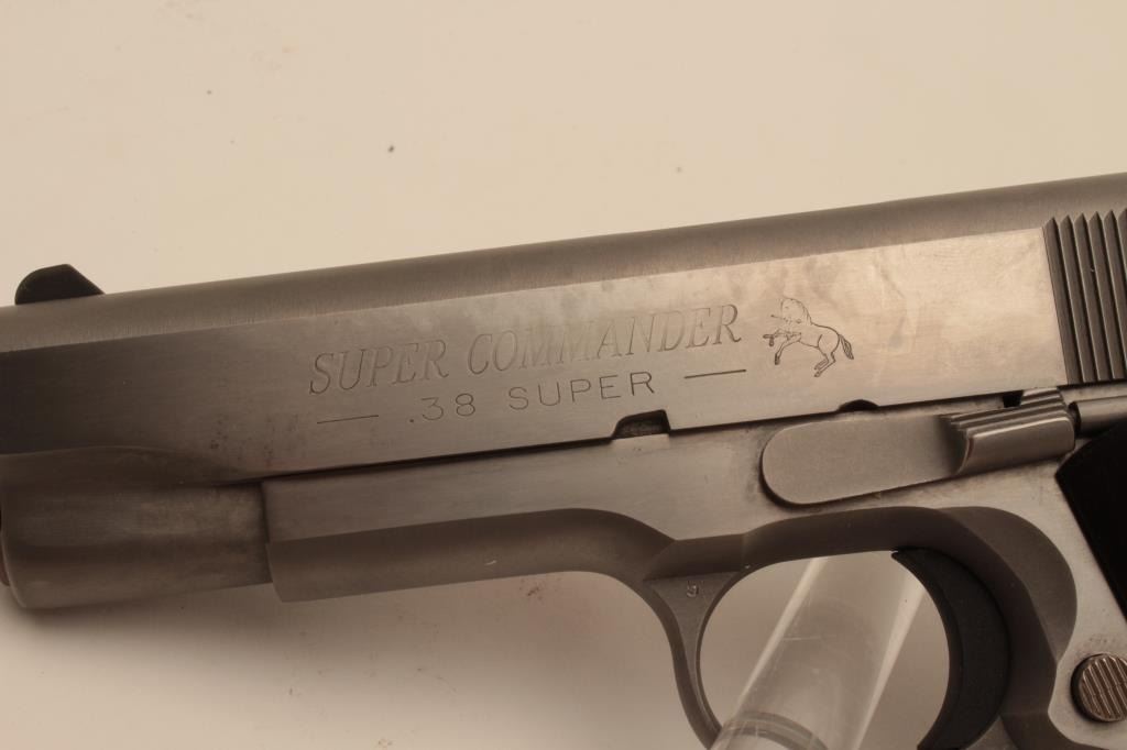18BM-17 COLT COMMANDERColt Super Commander, .38 Super cal., #CSC555, stainless, 4 1/4" barrel, stainless, adjustable sights, smooth medallion rosewood grips. This Colt Custom Shop pistol is in fine to excellent condition overall, and will improve with cleaning. Includes Colt Custom Shop burgundy box in very good condition with owners manual and two correct mags, (Modern / PPT) Est. $900-1800Colt Super Commander, .38 Super cal., #CSC555, stainless, 4 1/4" barrel, stainless, adjustable sights, smooth medallion rosewood grips. This Colt Custom Shop pistol is in fine to excellent condition overall, and will improve with cleaning. Includes Colt Custom Shop burgundy box in very good condition with owners manual and two correct mags, (Modern / PPT) Est. $900-1800