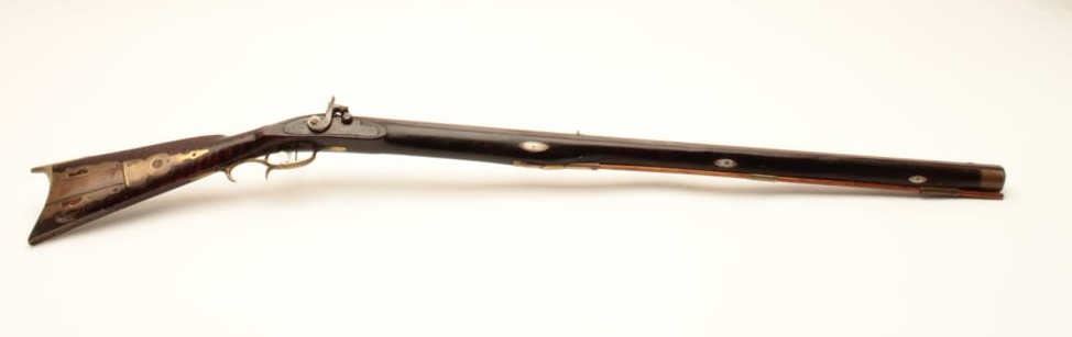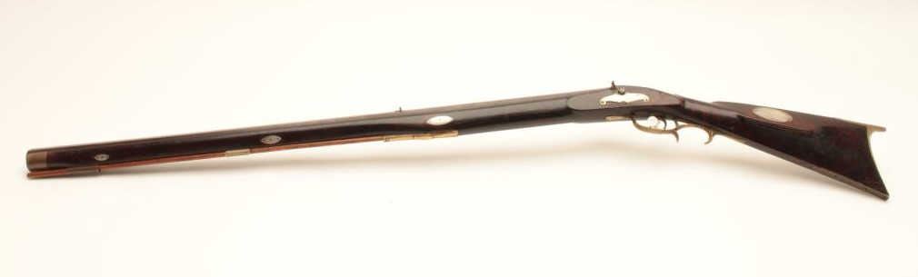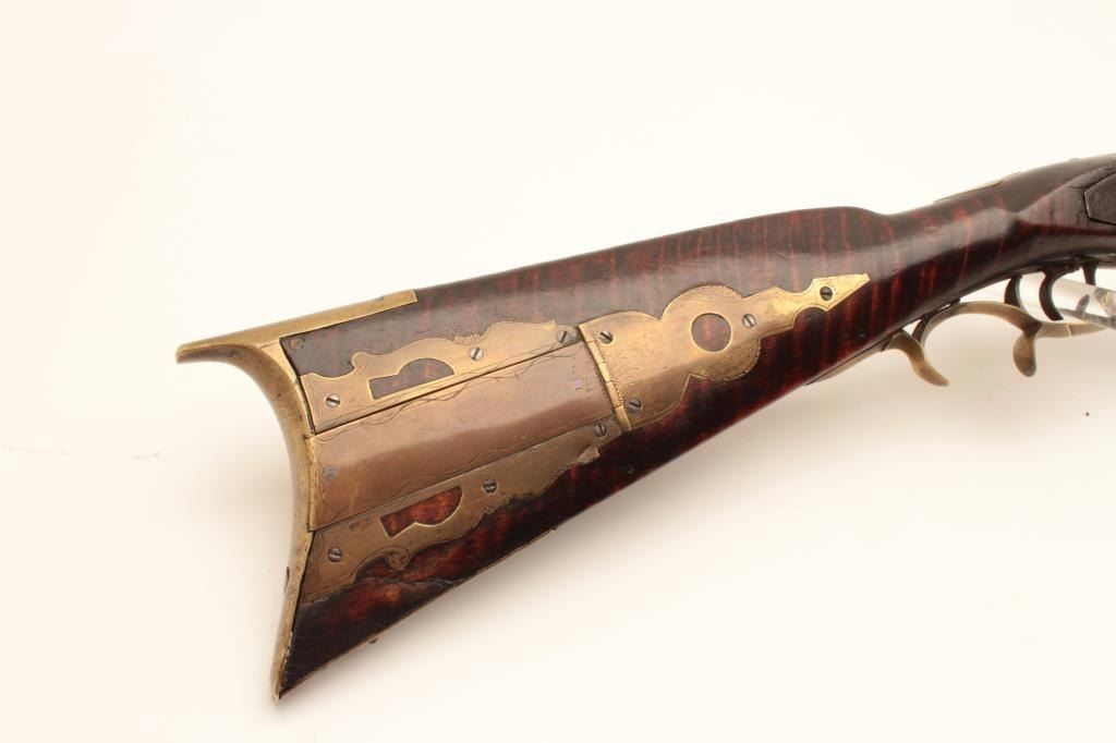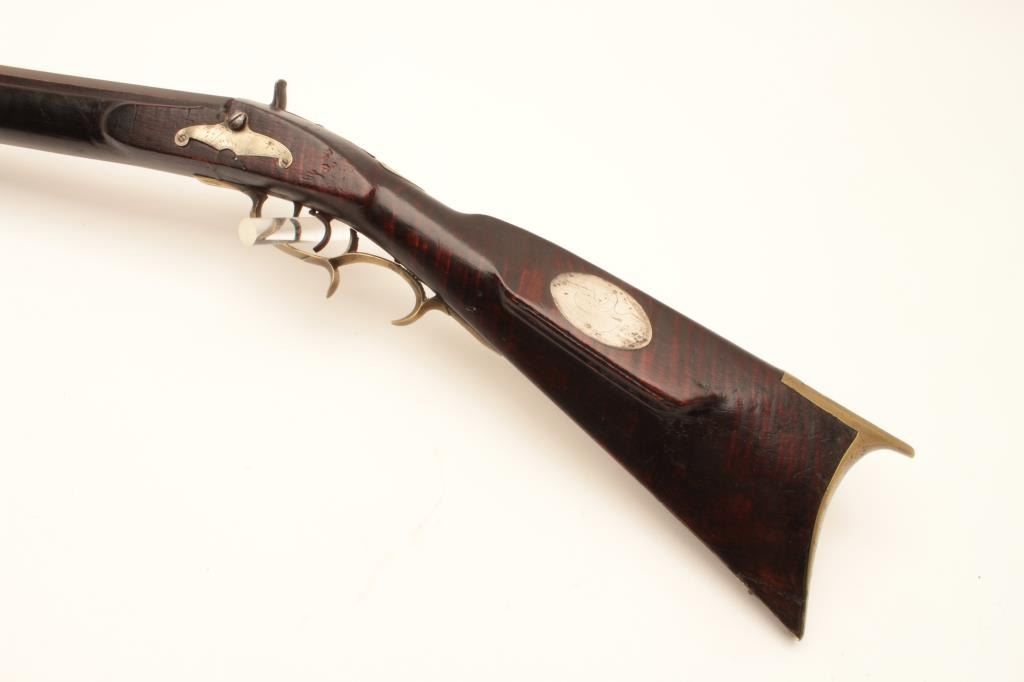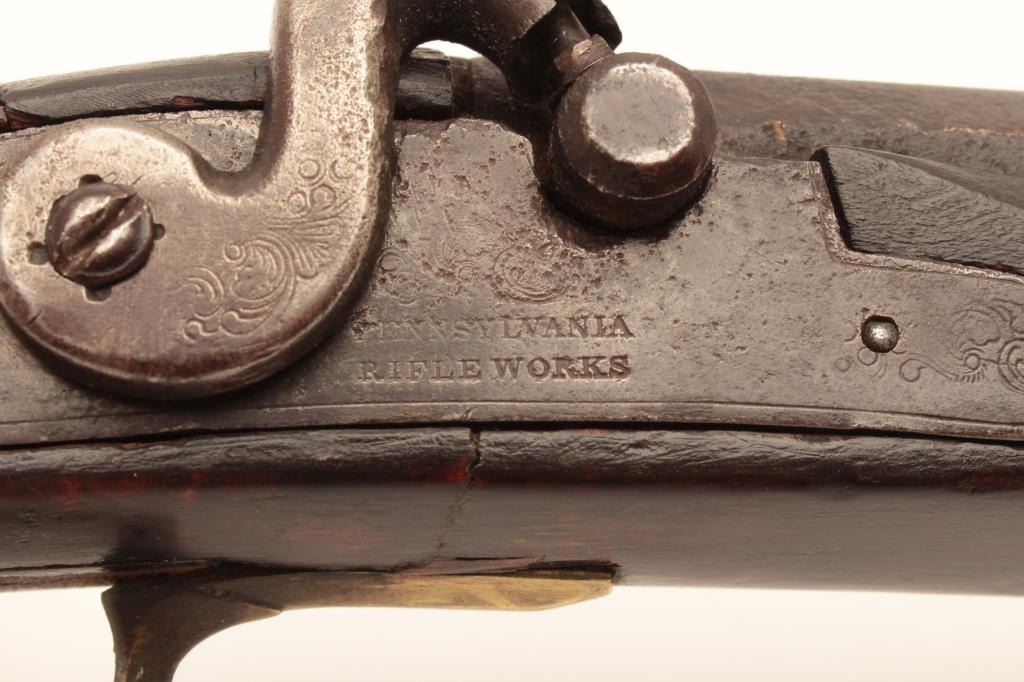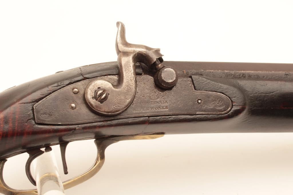 18BP-1 PENN. RIFLE WORKS PLAINS RIFLEPennsylvania Rifle Works full stock percussion Plains rifle, approximately .40 caliber. The rifle is in good overall condition with a 34” heavy octagon barrel. The barrel has taken on a brown patina with a silver blade front sight and light to moderate surface erosion. The side plate and hammer have light engraving and some pin prick pitting. The side plate is marked, “PENNSYLVANIA GUN WORKS”. The full-lengthwood stock is in good condition with a brass cap at the muzzle, brass trigger guard, elaborate patch box and crescent butt plate. In addition to beautiful fiddle back figure, the stock has significant silverornamentation with six silver inlays along the barrel channel, a silver heart behind the tang and a silver escutcheon plate on the cheek piece where someone has hand engraved an American eagle with shield. The rifleretains its wood ramrod with brass hardware. Est.: $750-$1,500. (Antique).Pennsylvania Rifle Works full stock percussion Plains rifle, approximately .40 caliber. The rifle is in good overall condition with a 34” heavy octagon barrel. The barrel has taken on a brown patina with a silver blade front sight and light to moderate surface erosion. The side plate and hammer have light engraving and some pin prick pitting. The side plate is marked, “PENNSYLVANIA GUN WORKS”. The full-lengthwood stock is in good condition with a brass cap at the muzzle, brass trigger guard, elaborate patch box and crescent butt plate. In addition to beautiful fiddle back figure, the stock has significant silverornamentation with six silver inlays along the barrel channel, a silver heart behind the tang and a silver escutcheon plate on the cheek piece where someone has hand engraved an American eagle with shield. The rifleretains its wood ramrod with brass hardware. Est.: $750-$1,500. (Antique).
