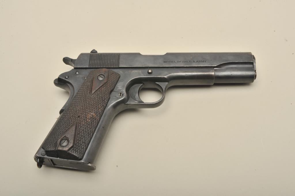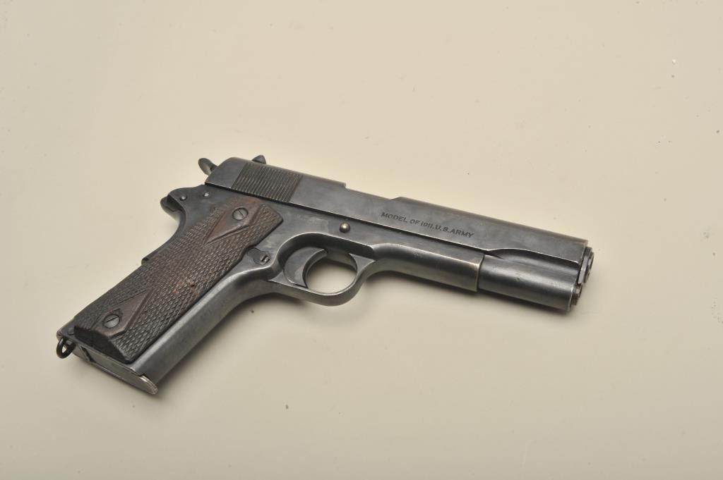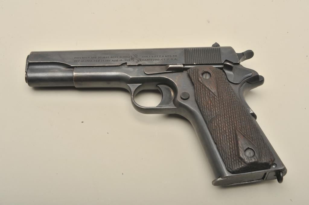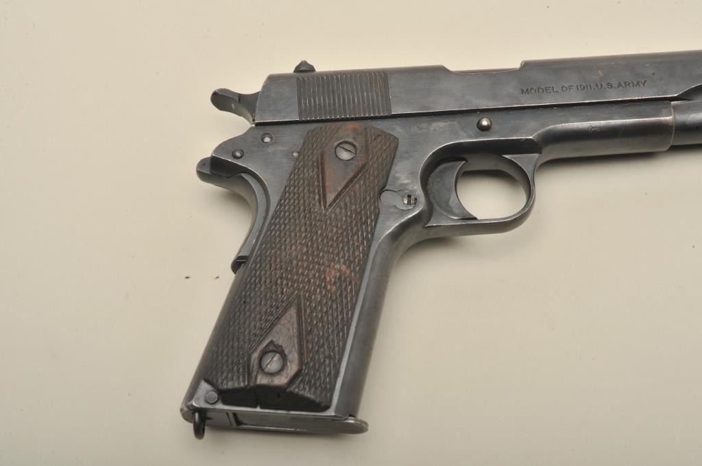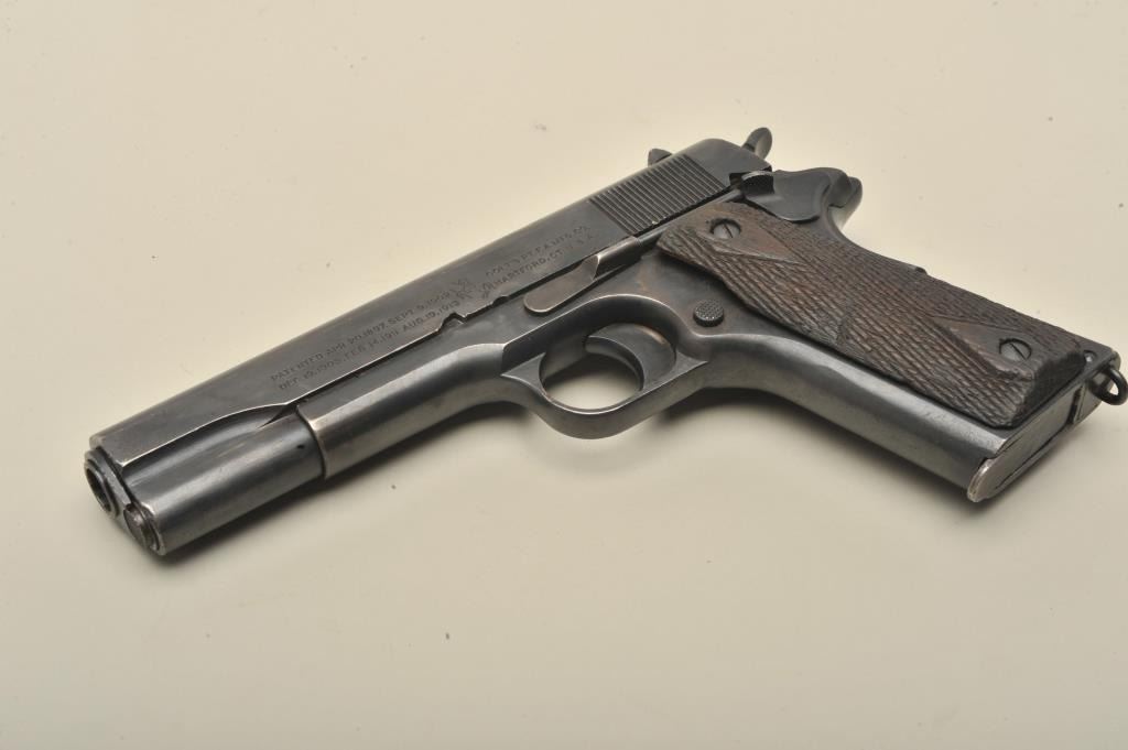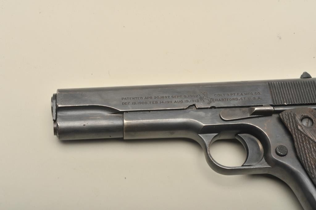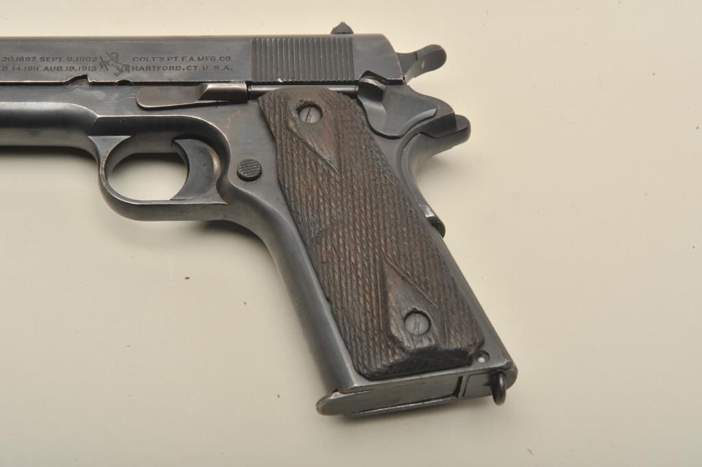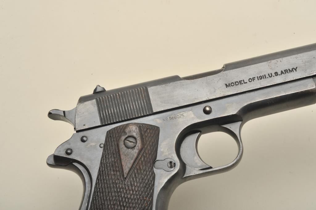 17FL-157 COLT 1911 #566025Colt Model 1911 U.S. semi-automatic pistol, .45 caliber, 5” barrel, re-blued finish, checkered wood grips, S/N 566025, in overall good condition as re-finished, good bore, action and markings, worn grips showing someold mars and losses to edges and a small old crack at the bottom of the right grip. (C&R/PPT). Est.: $600-$1,200.Colt Model 1911 U.S. semi-automatic pistol, .45 caliber, 5” barrel, re-blued finish, checkered wood grips, S/N 566025, in overall good condition as re-finished, good bore, action and markings, worn grips showing someold mars and losses to edges and a small old crack at the bottom of the right grip. (C&R/PPT). Est.: $600-$1,200.