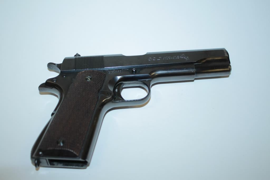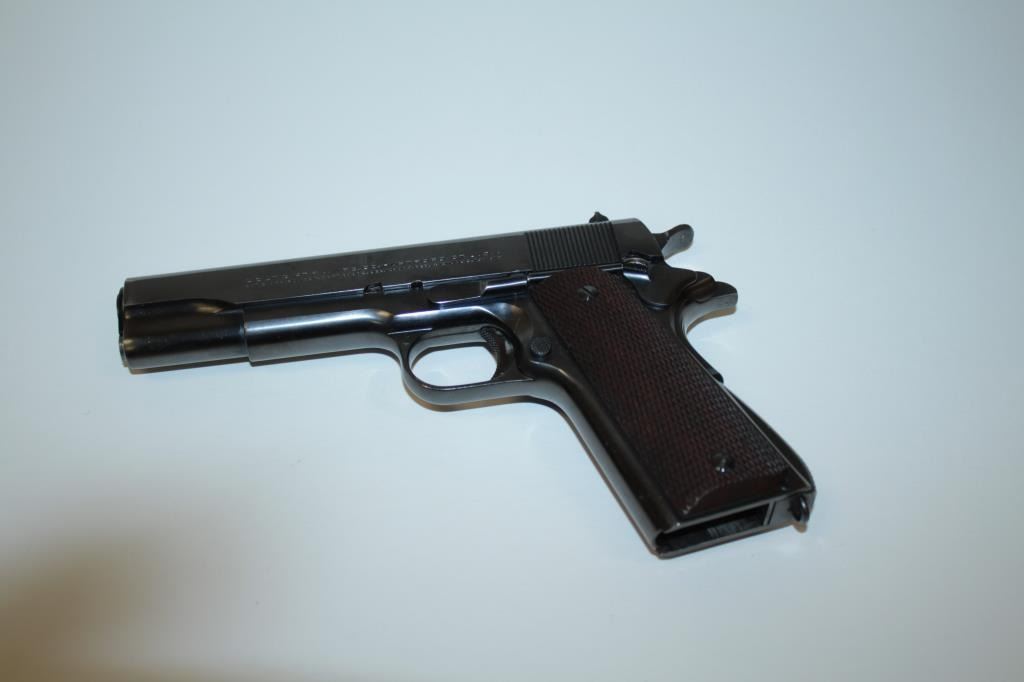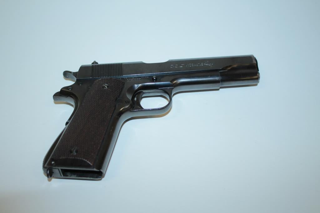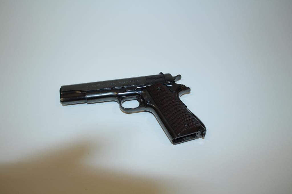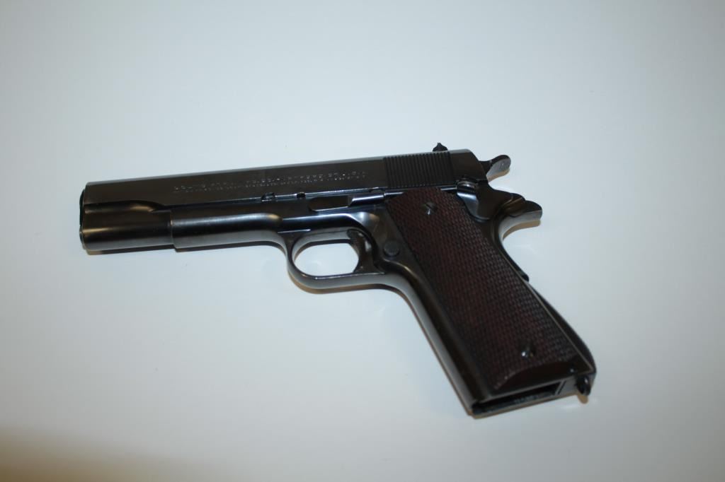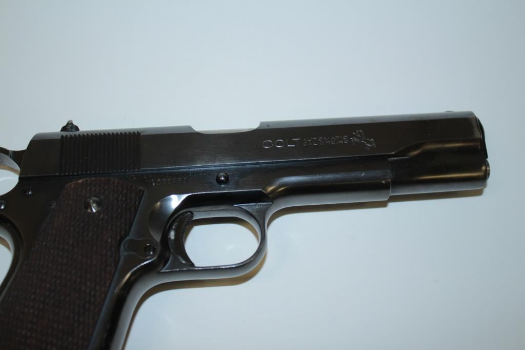 17FL-302 COLT 1911-A1 COMM. #C156455Colt Government Model 1911-A1 semi-automatic pistol, .45 caliber, 5” barrel, blued finish, checkered wood grips, no magazine, S/N C156455, in overall fine condition showing approximately 97% original finish with justsome high point and slight muzzle wear, fine bore, crisp action, sharp markings and fine grips. (C&R/PPT). Est.: $2,000-$4,000.Colt Government Model 1911-A1 semi-automatic pistol, .45 caliber, 5” barrel, blued finish, checkered wood grips, no magazine, S/N C156455, in overall fine condition showing approximately 97% original finish with justsome high point and slight muzzle wear, fine bore, crisp action, sharp markings and fine grips. (C&R/PPT). Est.: $2,000-$4,000.