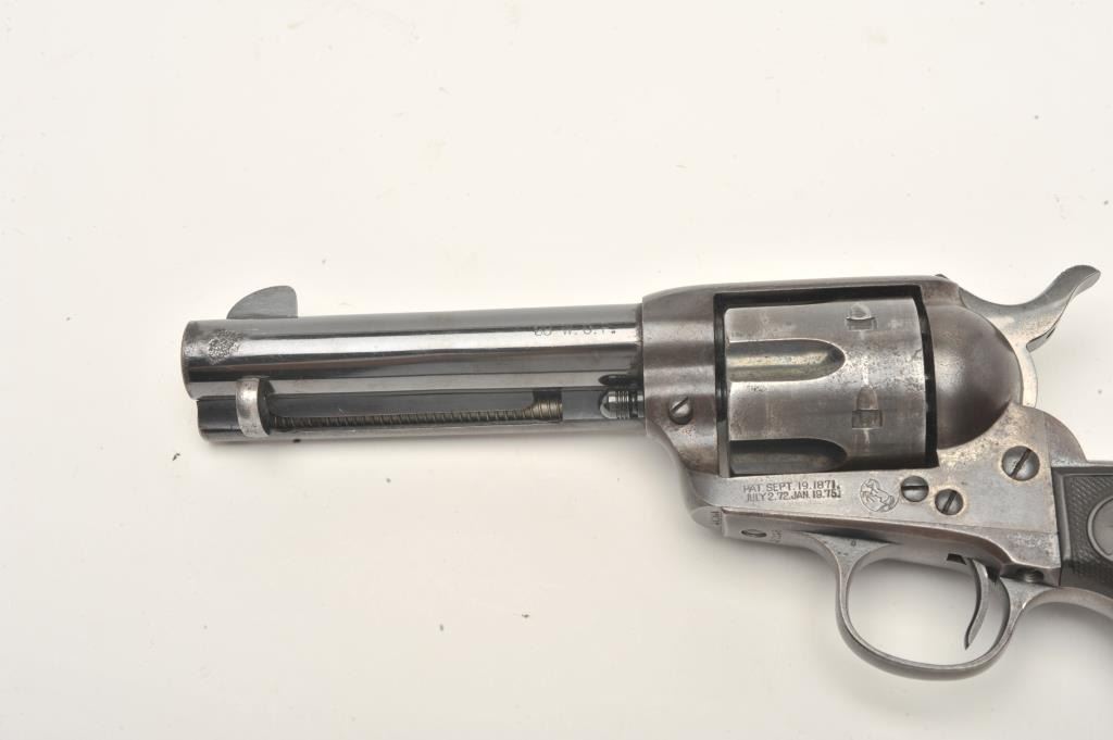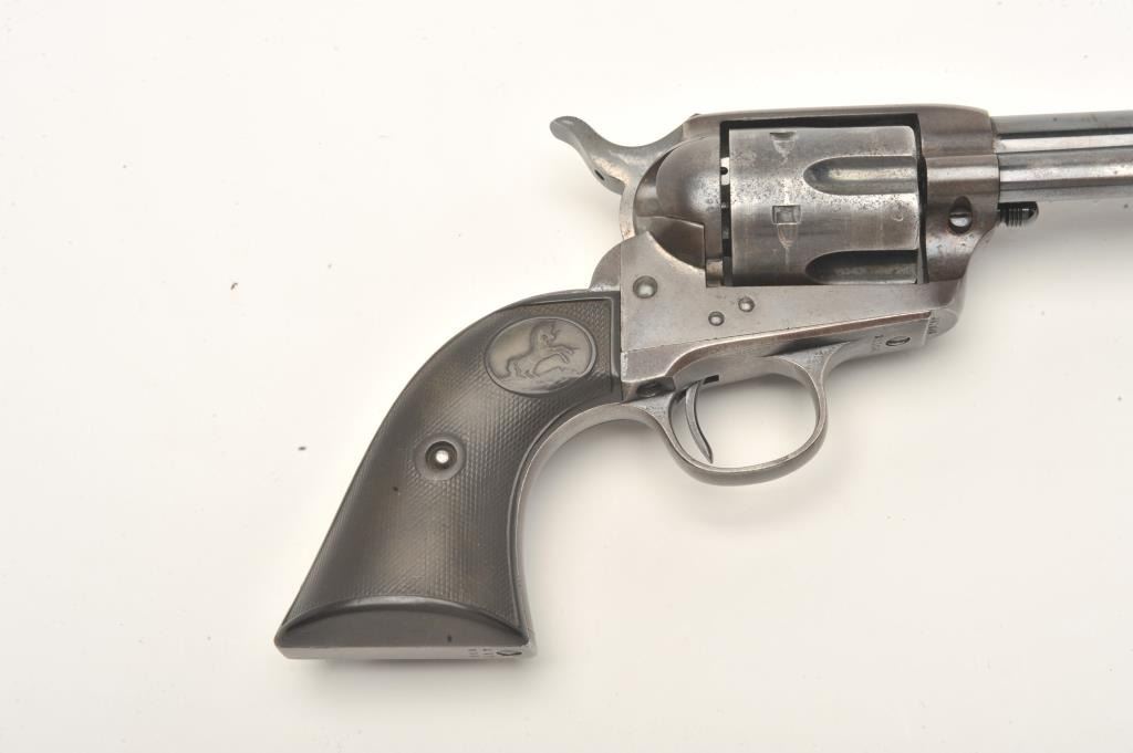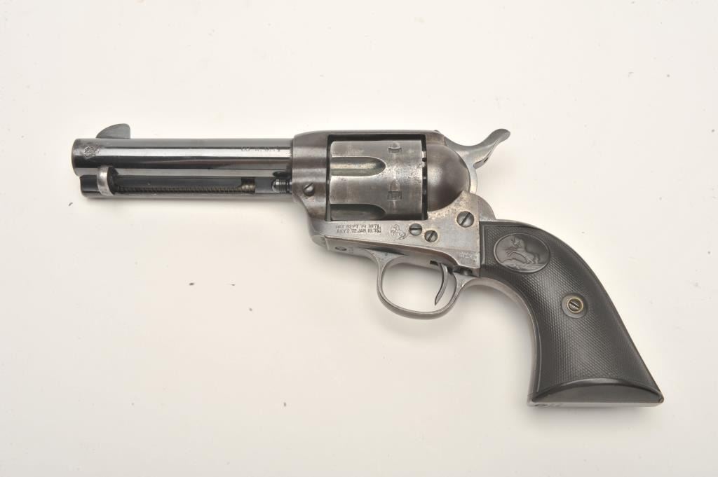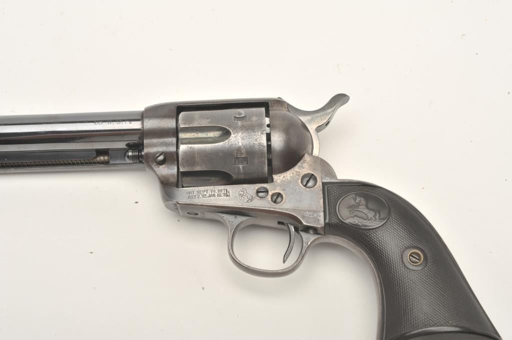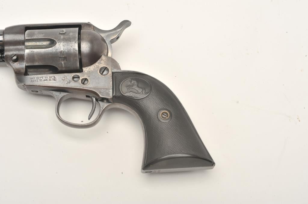 17FS-39 COLT SA 4.75" .38/40 W/LETTER #267098Colt SAA revolver, .38/40 caliber, 4.75” barrel, blued finish, checkered hard rubber grips, S/N 267098, in overall good to very good condition displaying the majority of original blue to barrel assembly, an areaof pitting to the left muzzle area and some scattered pitting to cylinder, dark patina otherwise, good bore, crisp action, sharp markings and good grips. Accompanied by a Colt factory letter confirmingcaliber, barrel length and finish, stocks “Not Listed”; shipped to Simmons Hardware Co., St. Louis, MO. on May 8, 1905, fifty guns in shipment. (C&R/No PPT). Est.: $1,500-$3,000.Colt SAA revolver, .38/40 caliber, 4.75” barrel, blued finish, checkered hard rubber grips, S/N 267098, in overall good to very good condition displaying the majority of original blue to barrel assembly, an areaof pitting to the left muzzle area and some scattered pitting to cylinder, dark patina otherwise, good bore, crisp action, sharp markings and good grips. Accompanied by a Colt factory letter confirmingcaliber, barrel length and finish, stocks “Not Listed”; shipped to Simmons Hardware Co., St. Louis, MO. on May 8, 1905, fifty guns in shipment. (C&R/No PPT). Est.: $1,500-$3,000.