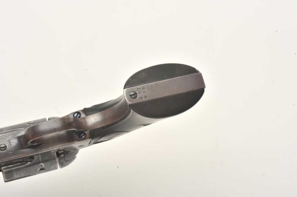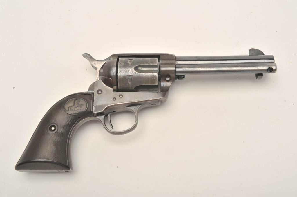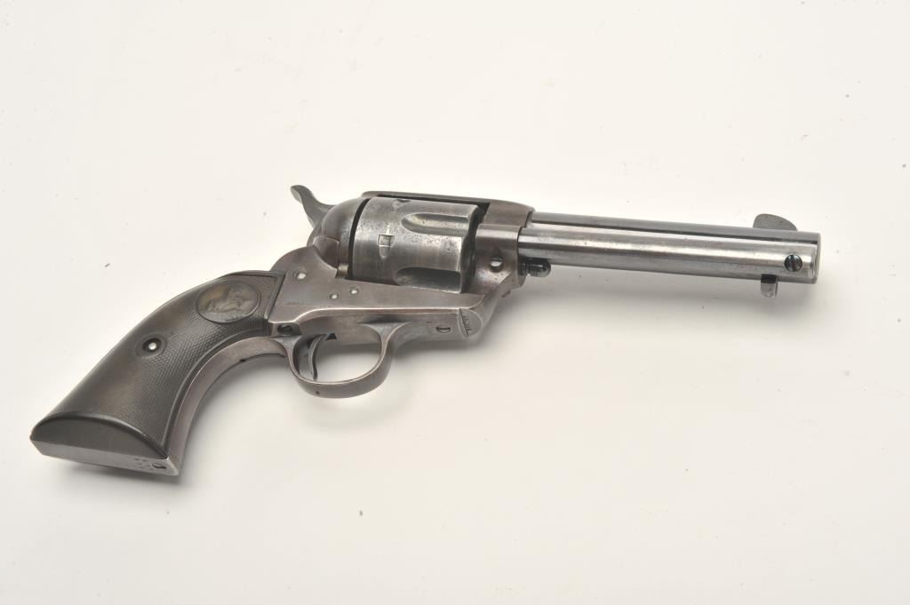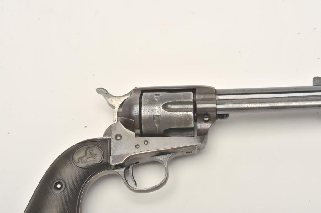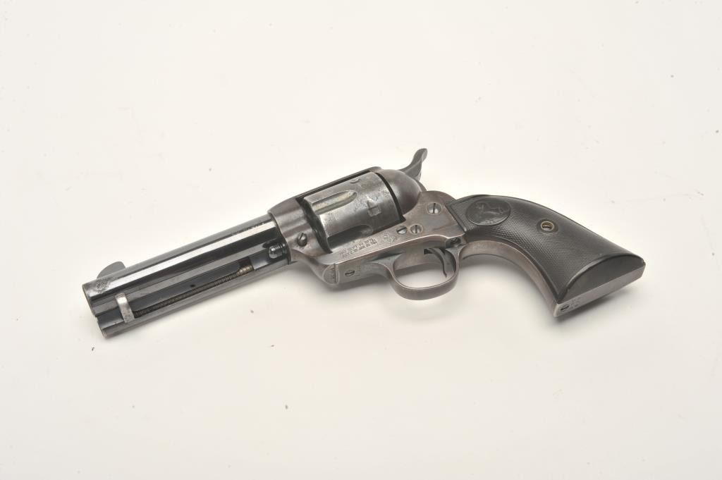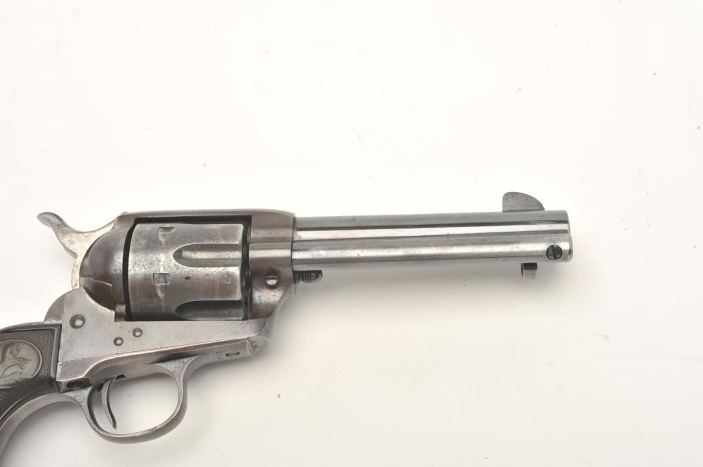17FS-39 COLT SA 4.75" .38/40 W/LETTER #267098Colt SAA revolver, .38/40 caliber, 4.75” barrel, blued finish, checkered hard rubber grips, S/N 267098, in overall good to very good condition displaying the majority of original blue to barrel assembly, an areaof pitting to the left muzzle area and some scattered pitting to cylinder, dark patina otherwise, good bore, crisp action, sharp markings and good grips. Accompanied by a Colt factory letter confirmingcaliber, barrel length and finish, stocks “Not Listed”; shipped to Simmons Hardware Co., St. Louis, MO. on May 8, 1905, fifty guns in shipment. (C&R/No PPT). Est.: $1,500-$3,000.Colt SAA revolver, .38/40 caliber, 4.75” barrel, blued finish, checkered hard rubber grips, S/N 267098, in overall good to very good condition displaying the majority of original blue to barrel assembly, an areaof pitting to the left muzzle area and some scattered pitting to cylinder, dark patina otherwise, good bore, crisp action, sharp markings and good grips. Accompanied by a Colt factory letter confirmingcaliber, barrel length and finish, stocks “Not Listed”; shipped to Simmons Hardware Co., St. Louis, MO. on May 8, 1905, fifty guns in shipment. (C&R/No PPT). Est.: $1,500-$3,000.