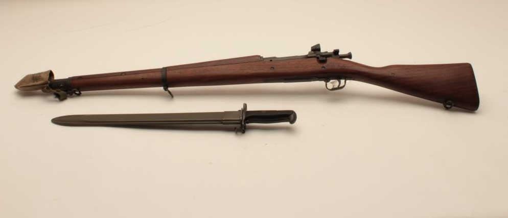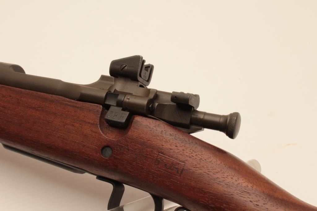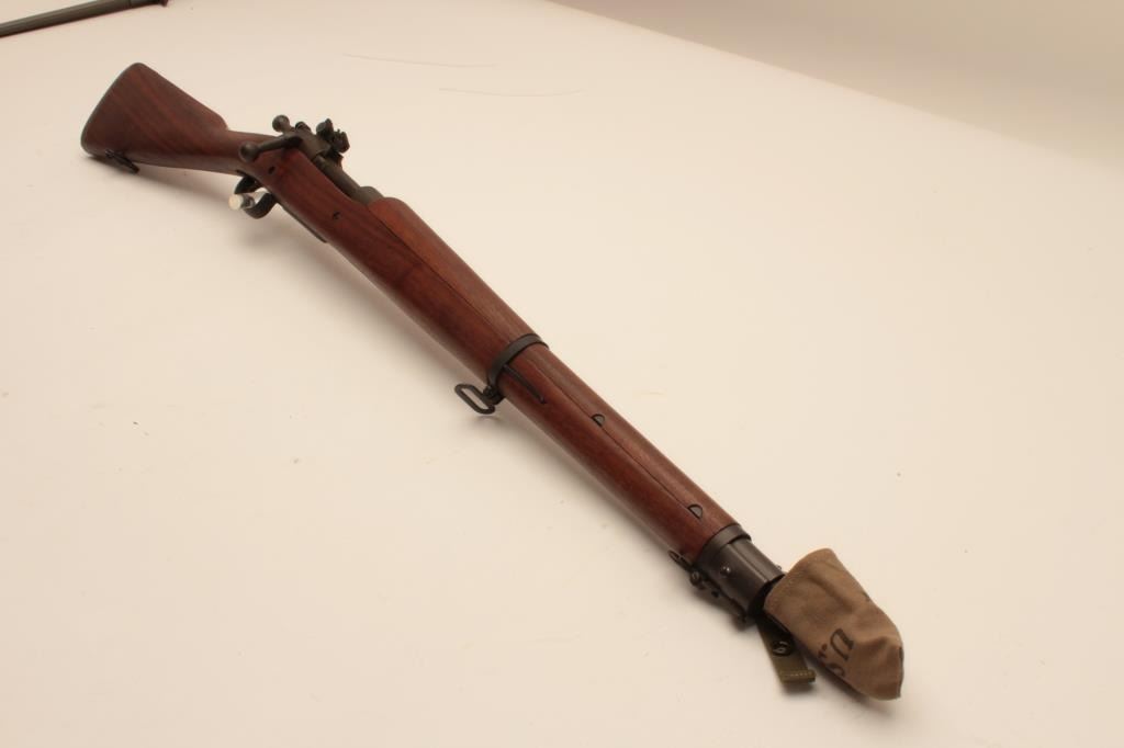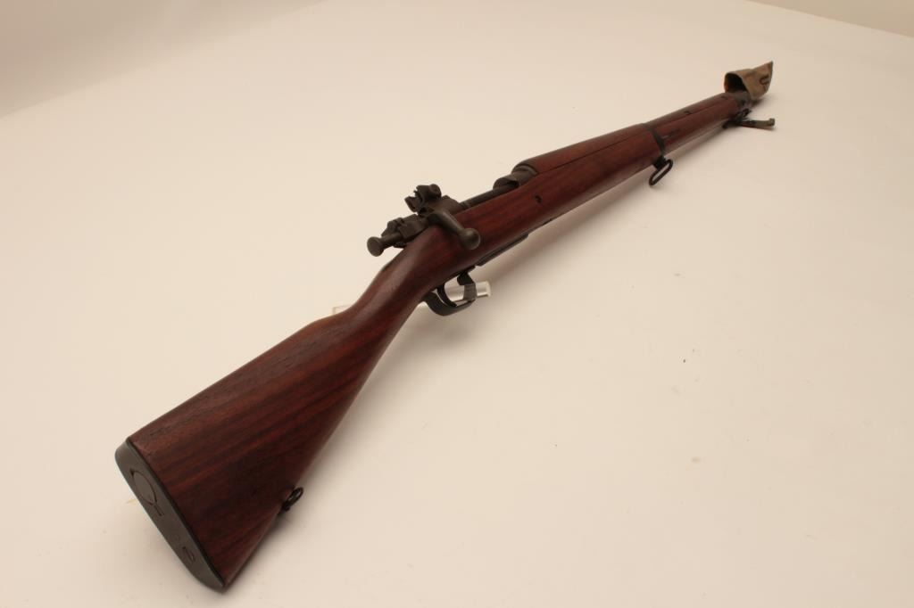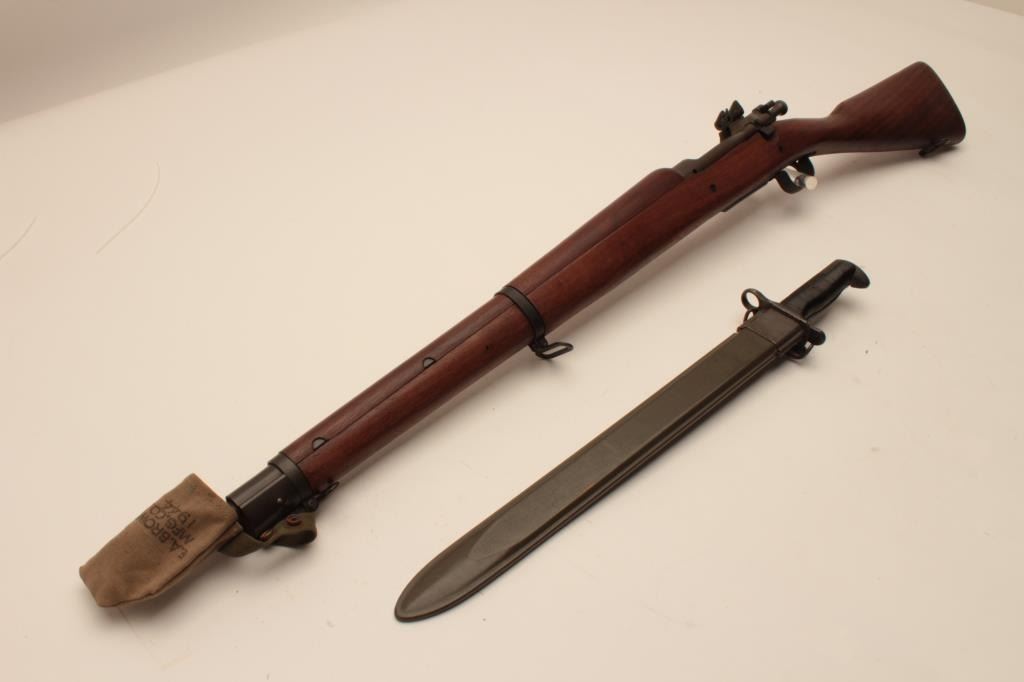 17MH-51 REMINGTON 03-A3 #4116637U.S. Springfield Model 03-A3 bolt action rifle by Remington, .30-06 caliber, 12-43 dated Remington barrel, military finish, wood stock, 1944 dated canvas muzzle cover, S/N 4116637, in overall excellent to mintycondition; circle P proof with “RA”, “FJA”, “OG” and crossed cannons inspection marks on left side of stock; with bayonet (dated 1942) and sheath. (C&R/PPT). Est.: $600-$1,200.U.S. Springfield Model 03-A3 bolt action rifle by Remington, .30-06 caliber, 12-43 dated Remington barrel, military finish, wood stock, 1944 dated canvas muzzle cover, S/N 4116637, in overall excellent to mintycondition; circle P proof with “RA”, “FJA”, “OG” and crossed cannons inspection marks on left side of stock; with bayonet (dated 1942) and sheath. (C&R/PPT). Est.: $600-$1,200.