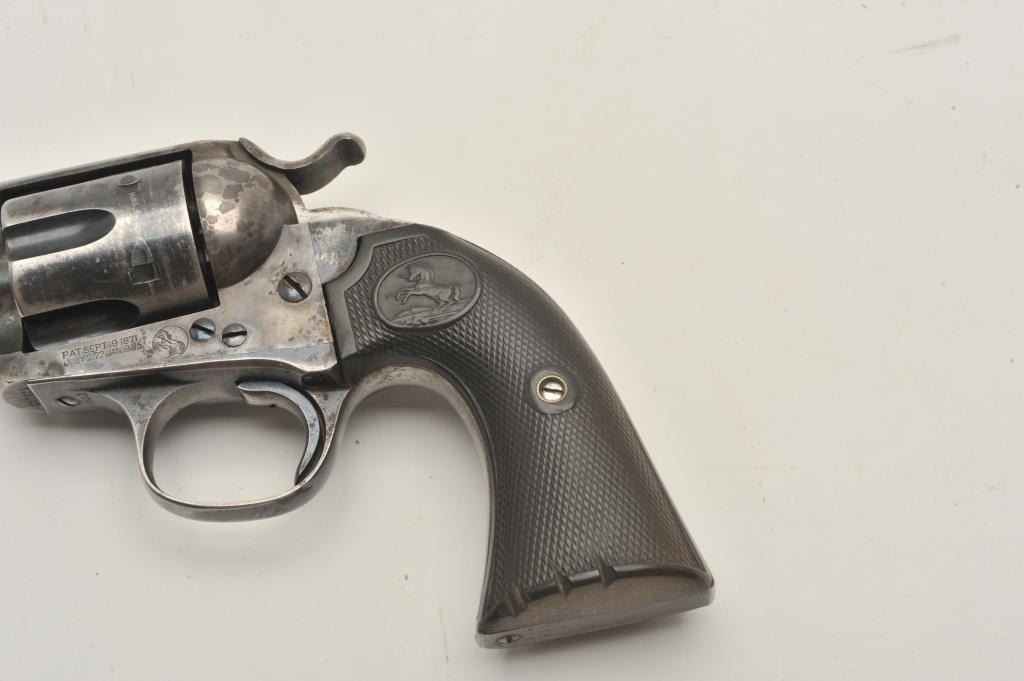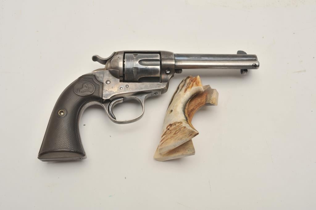 18BG-6 COLT BISLEY #307631Colt Bisley Model single action revolver, .38-40 caliber, 4.75” barrel, blued and case hardened finish, checkered black hard rubber grips with “C.D. Cannon/La Grande/Oregon carved on the inside of the right grip; S/N307631 (accompanied by an extra pair of stag grips); in overall very good condition showing 30-50%original blued finish, traces of original case colors on the frame, crisp action, sharp markings and good bore; gripsare good overall with old “hash marks” on bottom of left grip. (C&R/PPT). Est.: $1,000-$2,000.Colt Bisley Model single action revolver, .38-40 caliber, 4.75” barrel, blued and case hardened finish, checkered black hard rubber grips with “C.D. Cannon/La Grande/Oregon carved on the inside of the right grip; S/N307631 (accompanied by an extra pair of stag grips); in overall very good condition showing 30-50%original blued finish, traces of original case colors on the frame, crisp action, sharp markings and good bore; gripsare good overall with old “hash marks” on bottom of left grip. (C&R/PPT). Est.: $1,000-$2,000.