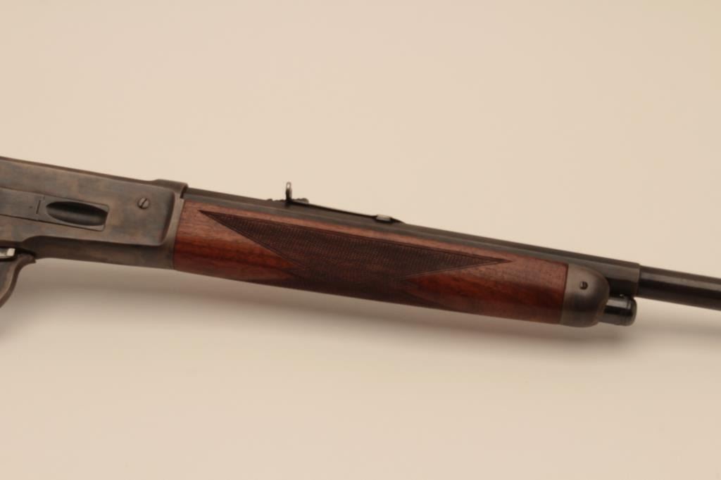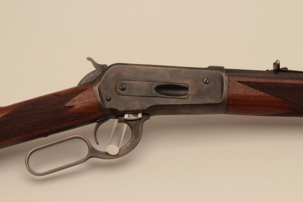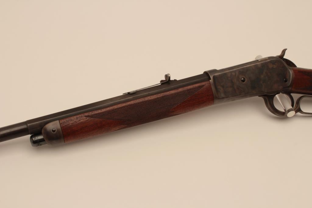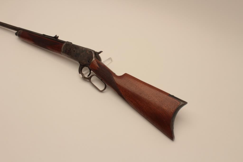 18BG-11 1886 WINCHESTER #79126Winchester Model 1886 lever action rifle, re-barreled to .45-70 caliber and custom restored; 26” half round/half octagon barrel, blued and case hardened finish, checkered wood stocks, S/N 79126; overall good to verygood as custom restored, very good bore, crisp action, beautiful case colors on receiver, lever, hammer, butt plate and forend cap; very good wood. (Antique). Est.: $750-$1,500.Winchester Model 1886 lever action rifle, re-barreled to .45-70 caliber and custom restored; 26” half round/half octagon barrel, blued and case hardened finish, checkered wood stocks, S/N 79126; overall good to verygood as custom restored, very good bore, crisp action, beautiful case colors on receiver, lever, hammer, butt plate and forend cap; very good wood. (Antique). Est.: $750-$1,500.