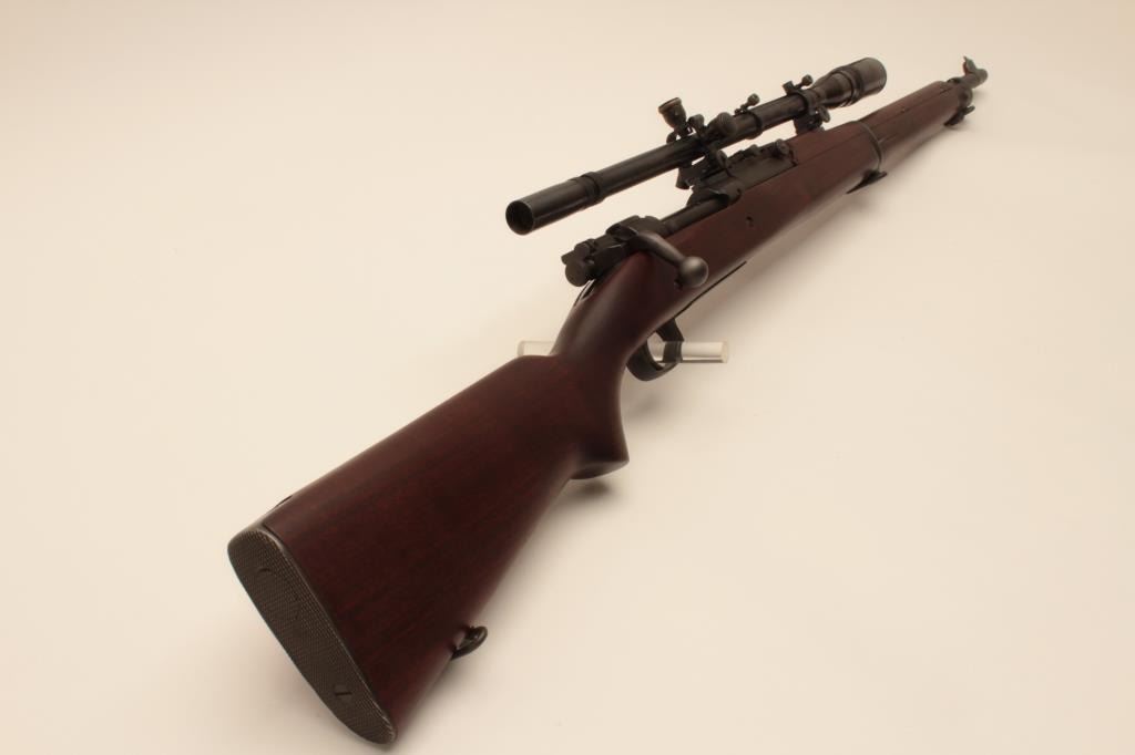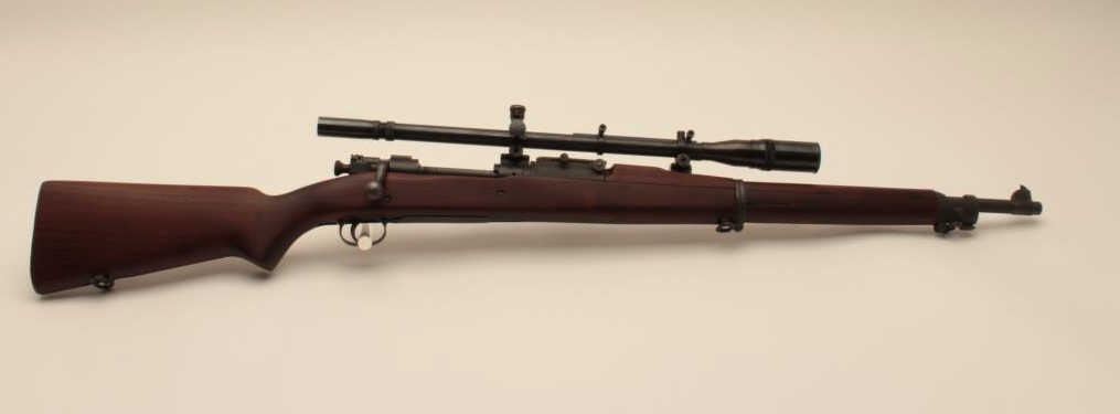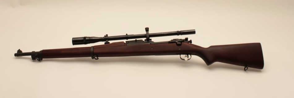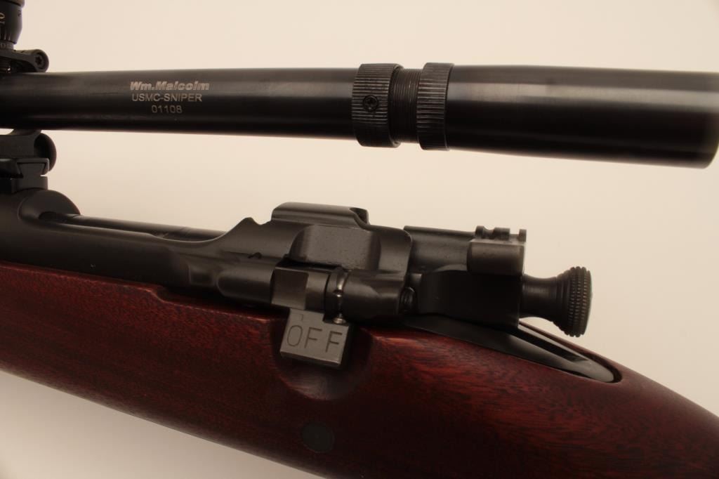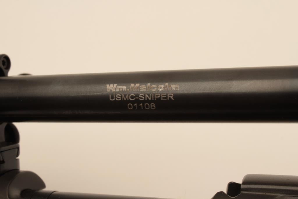 18AD-5 SPRINGFIELD 1903 #1394382U.S. Springfield Armory Model 1903 bolt action rifle, .30 caliber, Serial #1394382. The rifle is in fine overall condition with a 24” RIA barrel dated 4-22 with the flaming bomb insignia. The barrel features a rampedblade front and military tangent style rear sights. The rifle has been re-parkerized and retains nearly all of its military finish. The smooth wood stock is in very good condition with sling swivels and only lightstorage marks noted. The butt stock ends with a checkered steel butt plate with trap. The rifle is topped with CMP blocks and a Wm. Malcolm USMC-SNIPER scope. The bore is very good, the action is crisp and themarkings are sharp on this desirable Springfield. Est.: $750-$1,500. (C+R).U.S. Springfield Armory Model 1903 bolt action rifle, .30 caliber, Serial #1394382. The rifle is in fine overall condition with a 24” RIA barrel dated 4-22 with the flaming bomb insignia. The barrel features a rampedblade front and military tangent style rear sights. The rifle has been re-parkerized and retains nearly all of its military finish. The smooth wood stock is in very good condition with sling swivels and only lightstorage marks noted. The butt stock ends with a checkered steel butt plate with trap. The rifle is topped with CMP blocks and a Wm. Malcolm USMC-SNIPER scope. The bore is very good, the action is crisp and themarkings are sharp on this desirable Springfield. Est.: $750-$1,500. (C+R).