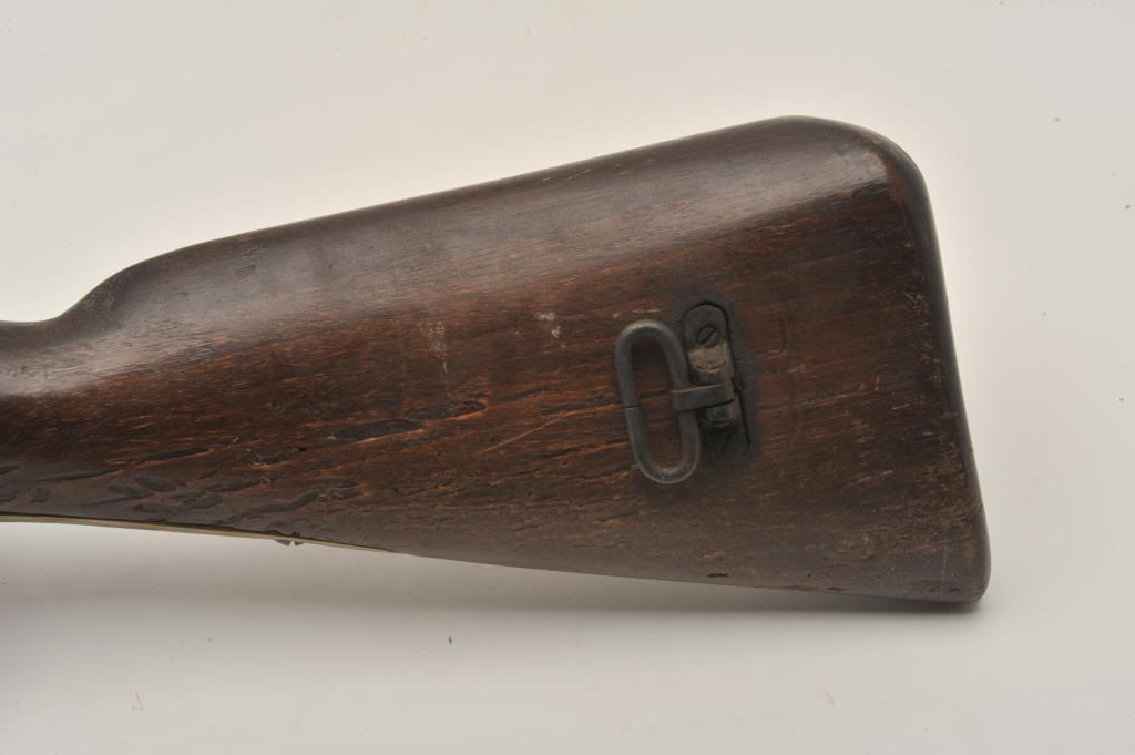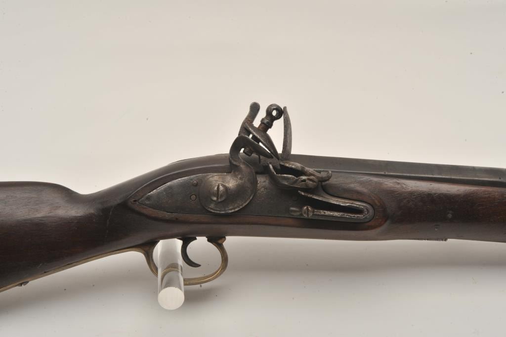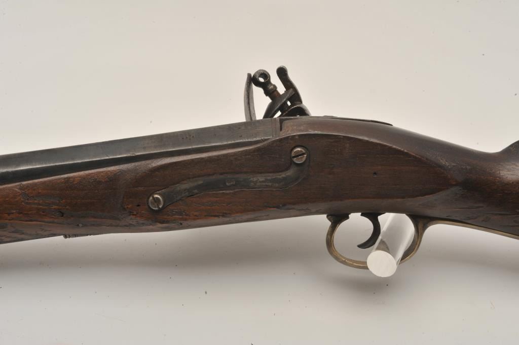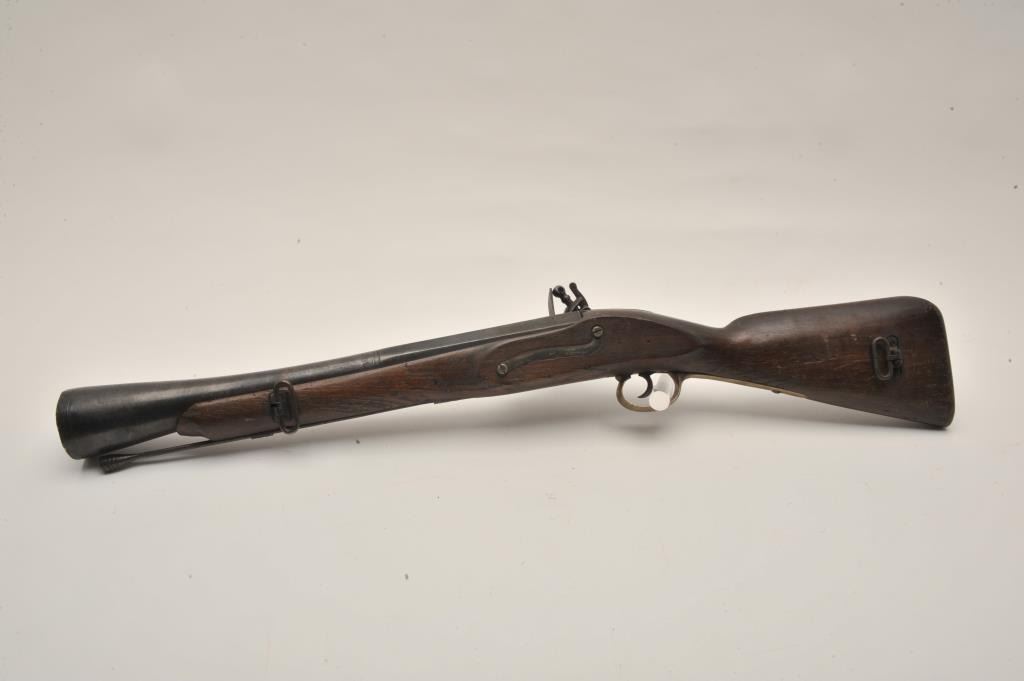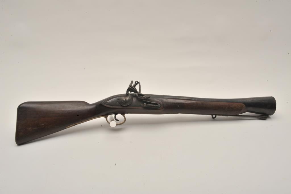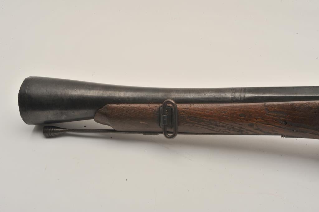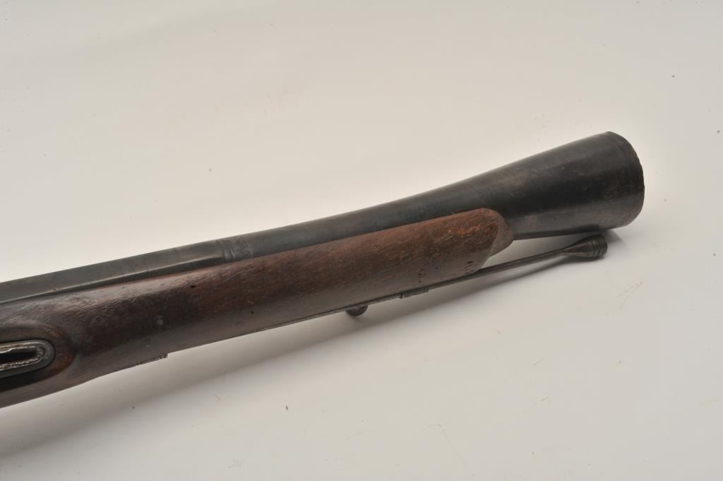 18AR-25 FRENCH MARINE B.B.French Marine blunder buss with iron barrel, side mounted swivels for sling, circa late 18th-19th century. Measures 33 ½” overall with a 19 ¼” barrel flared to 2 ½” across inner dimensions of the muzzle. Brass trigger guard with no butt plate and the ramrod is retained. Very light engraving and dots at the breech from North Africa or Mid-East. Fair to good metal with dark patina. The wood is very good and may be set back ½” to 1 ½”at the front of fore end long, long ago. (Antique) Est.: $1250-$2500French Marine blunder buss with iron barrel, side mounted swivels for sling, circa late 18th-19th century. Measures 33 ½” overall with a 19 ¼” barrel flared to 2 ½” across inner dimensions of the muzzle. Brass trigger guard with no butt plate and the ramrod is retained. Very light engraving and dots at the breech from North Africa or Mid-East. Fair to good metal with dark patina. The wood is very good and may be set back ½” to 1 ½”at the front of fore end long, long ago. (Antique) Est.: $1250-$2500