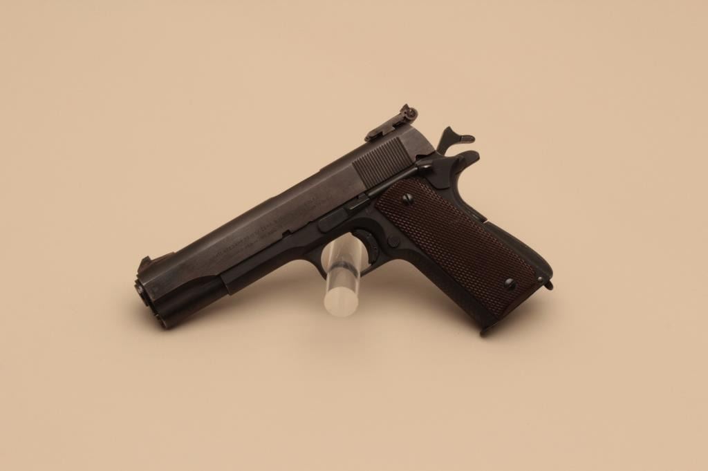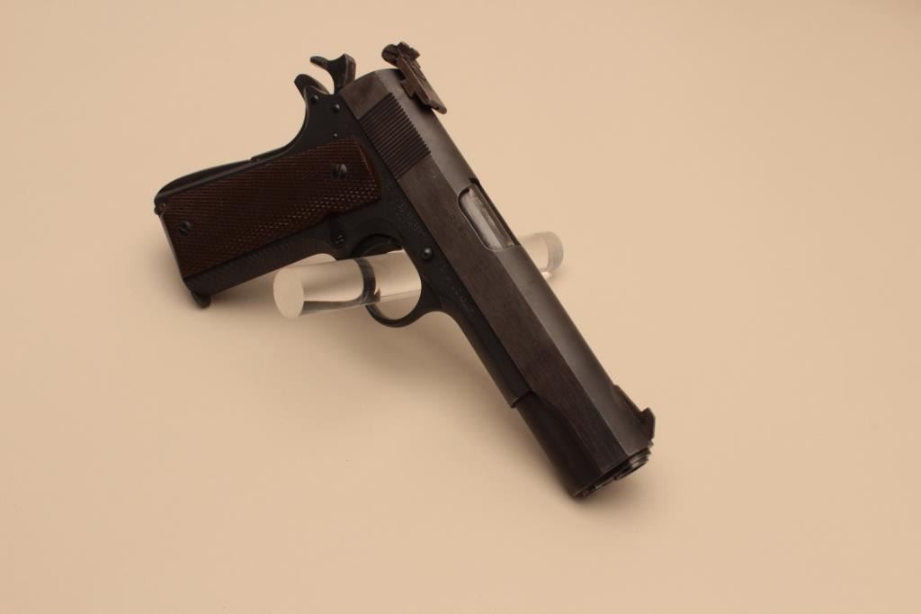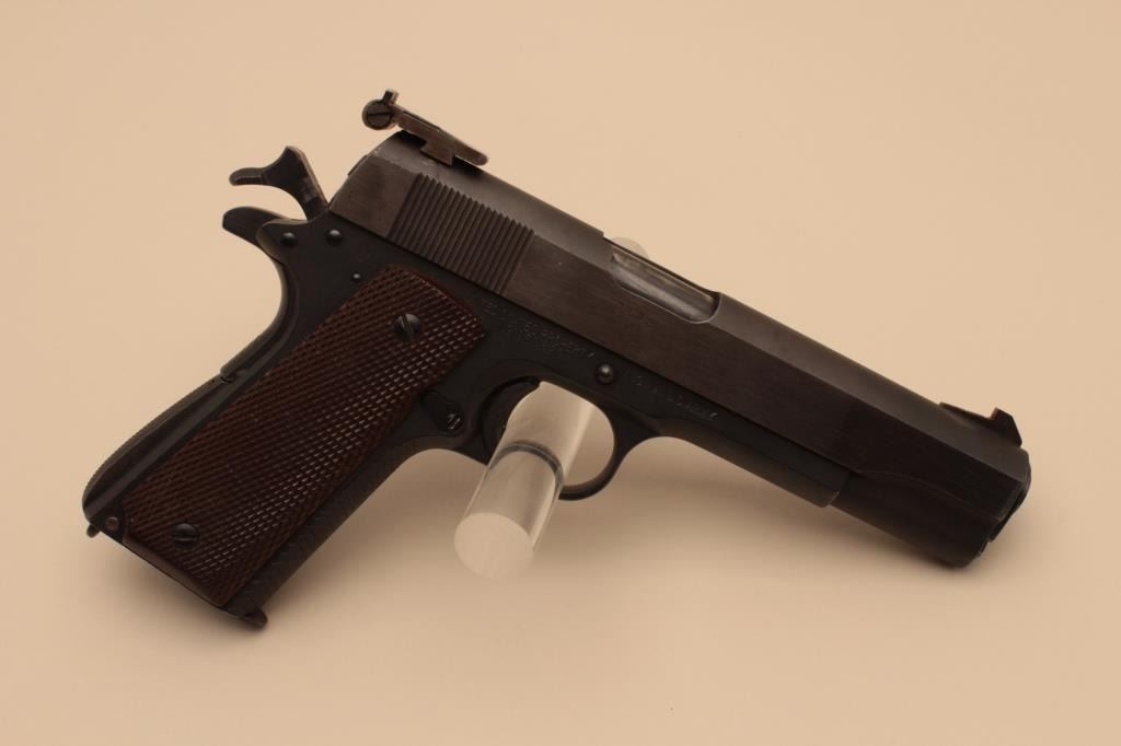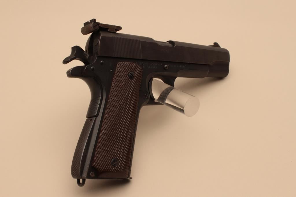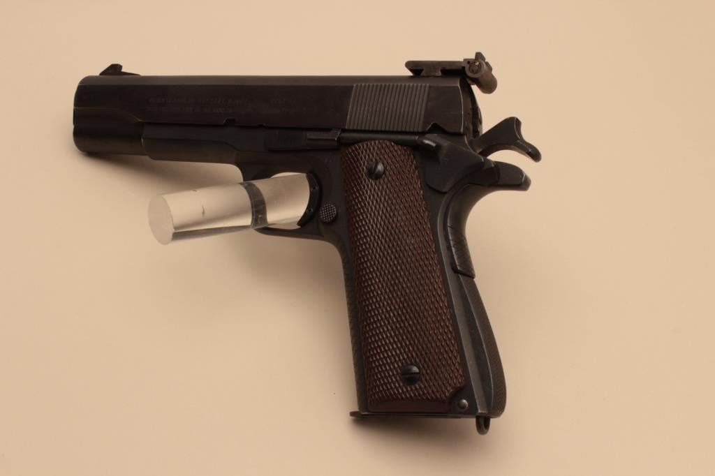 17FL-136 COLT 1911 A-1 #921829Colt Model 1911-A1 semi-automatic pistol, National Match marked barrel, .45 caliber, 5” barrel, mat black finish, checkered brown grips, Elliason adjustable rear sight, S/N 921829 with “0893” stamped on right side ofslide below ejection port, added trigger shoe; in overall good to very good condition displaying the majority of its finish, hand checkered front grip strap and rear grip safety; very good bore, good markings andfine grips; action is not working and in need of attention by a competent gunsmith. (C&R/PPT). Est.: $1,400-$2,800.Colt Model 1911-A1 semi-automatic pistol, National Match marked barrel, .45 caliber, 5” barrel, mat black finish, checkered brown grips, Elliason adjustable rear sight, S/N 921829 with “0893” stamped on right side ofslide below ejection port, added trigger shoe; in overall good to very good condition displaying the majority of its finish, hand checkered front grip strap and rear grip safety; very good bore, good markings andfine grips; action is not working and in need of attention by a competent gunsmith. (C&R/PPT). Est.: $1,400-$2,800.