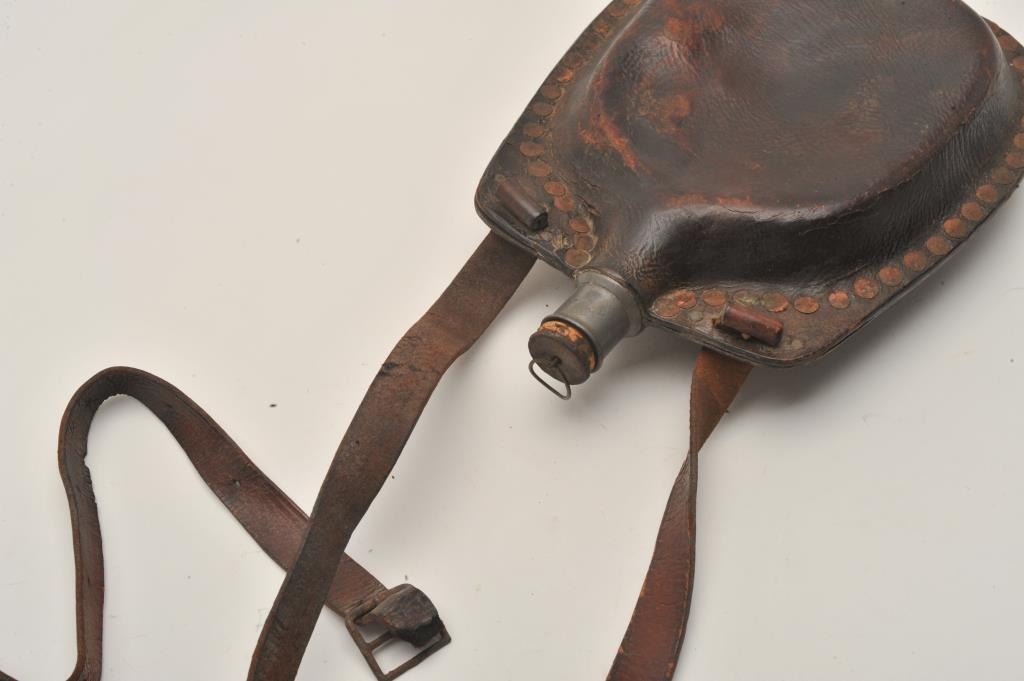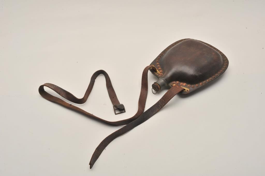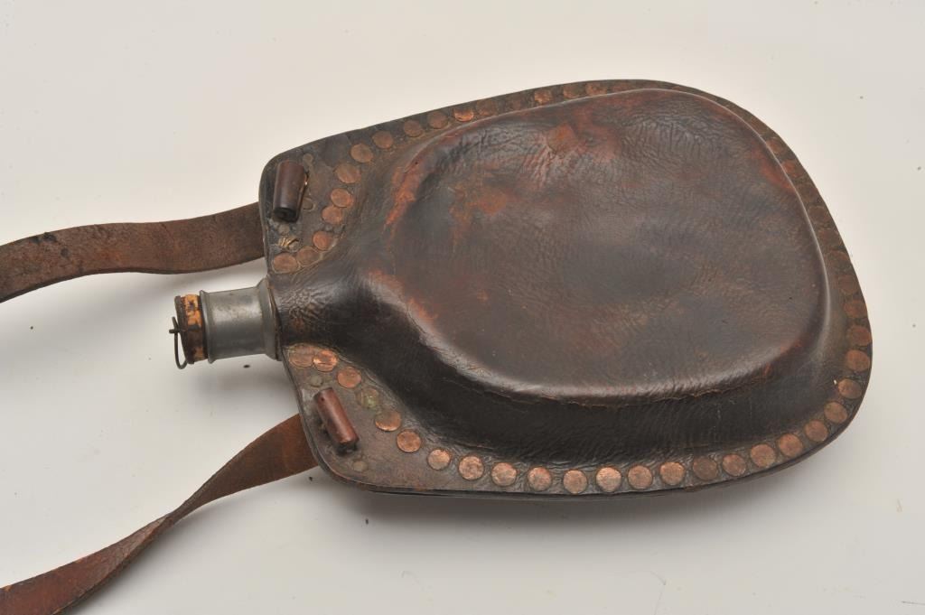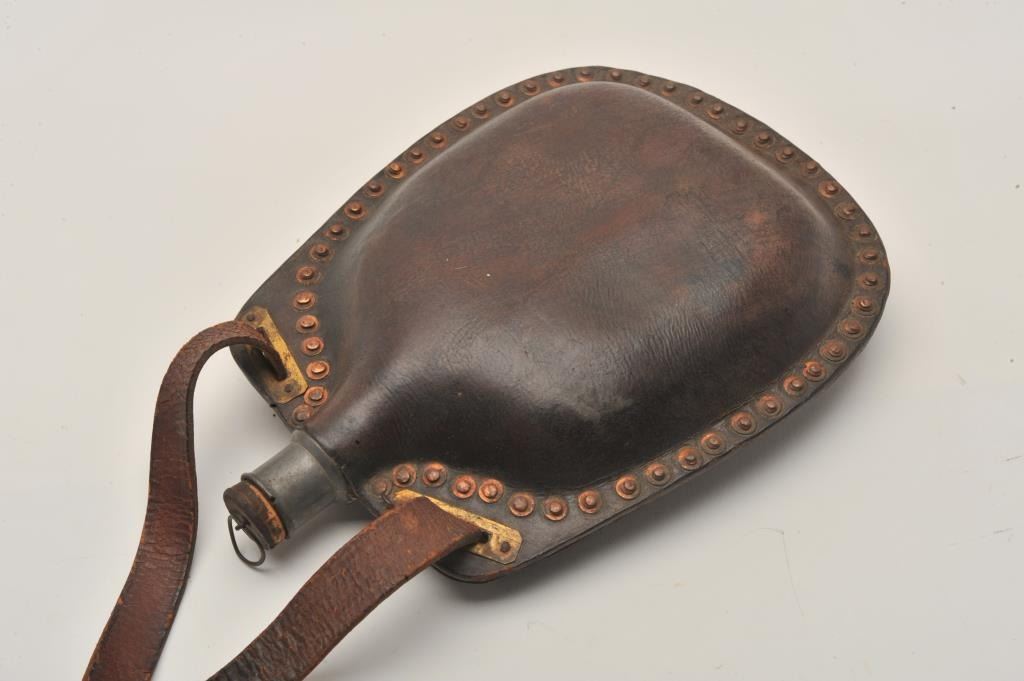 18AL-20 CIVIL WAR ERABoiled leather canteen with copper rivets, pewter spout and original cork plug. Original strap broken but retained and otherwise very good. Probably private purchase Mid-19th century. Est.: $300-$600Boiled leather canteen with copper rivets, pewter spout and original cork plug. Original strap broken but retained and otherwise very good. Probably private purchase Mid-19th century. Est.: $300-$600