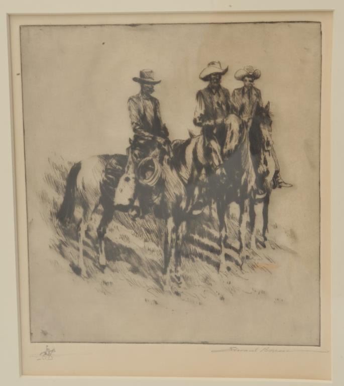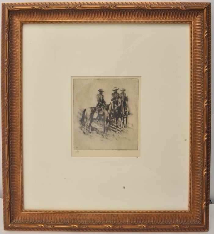 18AL-81 ORIGINAL BOREIN ETCHINGOriginal Borein etching of 3 horsemen – remarked with vignette of man on horseback; hand signed lower right hand corner; image size approximately 7” x 6”; excellent “Toby” frame and mat, approximately 21” x 19”overall. Est.: $600-$1,200.Original Borein etching of 3 horsemen – remarked with vignette of man on horseback; hand signed lower right hand corner; image size approximately 7” x 6”; excellent “Toby” frame and mat, approximately 21” x 19”overall. Est.: $600-$1,200.