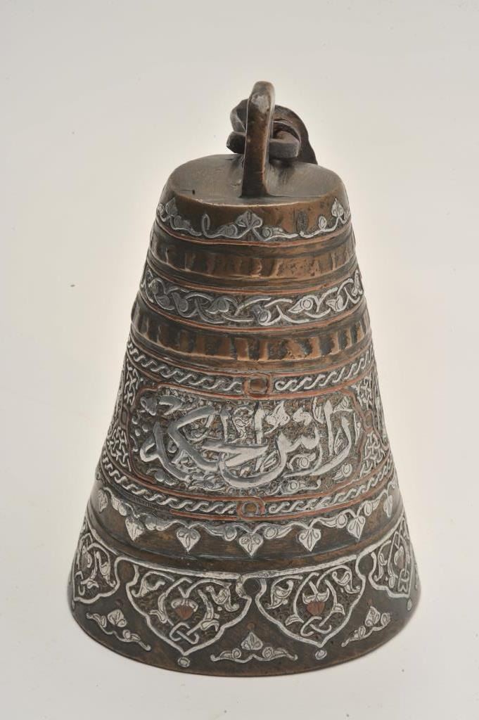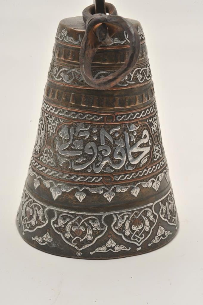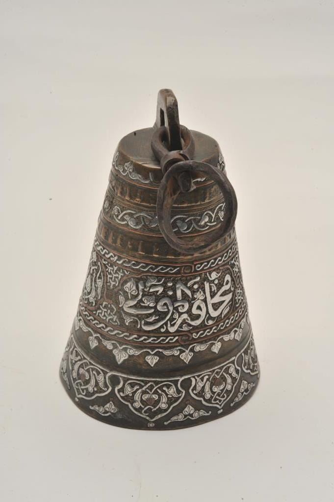 EVE-82 SILVER INLAID BRASS BELLOrnate Mid-eastern silver inlaid brass bell with extensive writings. High quality and very decorative. Measures 7 ½” tall. Though by Mr. Vaule to be for a favorite camel of high worth. The estate of Eric Vaule. Est.:$350-$700Ornate Mid-eastern silver inlaid brass bell with extensive writings. High quality and very decorative. Measures 7 ½” tall. Though by Mr. Vaule to be for a favorite camel of high worth. The estate of Eric Vaule. Est.:$350-$700