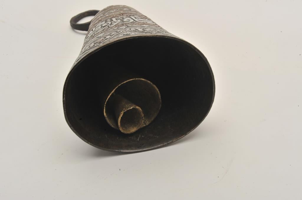 Lot 269 EVE-82 SILVER INLAID BRASS BELLOrnate Mid-eastern silver inlaid brass bell with extensive writings.