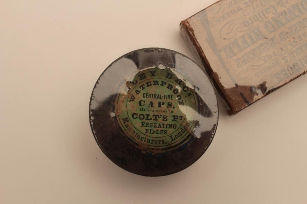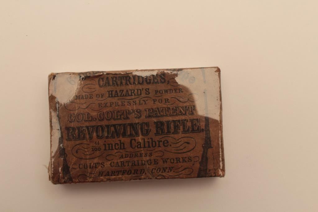 18AN-11 .44 CAL. SKIN CARTRIDGE BOX.44 caliber skin cartridge box for Colt’s (Root) Model rifle with picture label. The box is very good to fine. The cartridges removed for safety. Along with large size Eley cap tin marked for repeating rifles. The label is very good. Caps removed. Great for display with Root 1855. Est.: $500-$1000.44 caliber skin cartridge box for Colt’s (Root) Model rifle with picture label. The box is very good to fine. The cartridges removed for safety. Along with large size Eley cap tin marked for repeating rifles. The label is very good. Caps removed. Great for display with Root 1855. Est.: $500-$1000