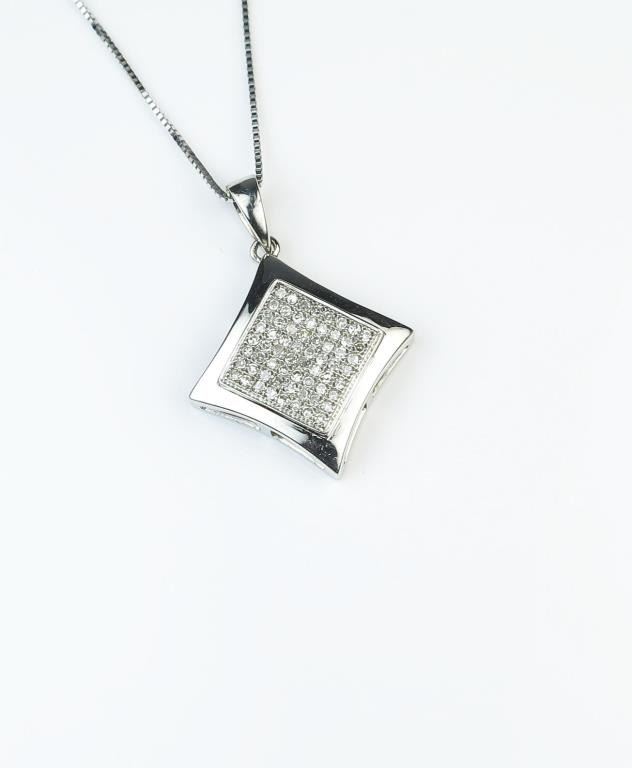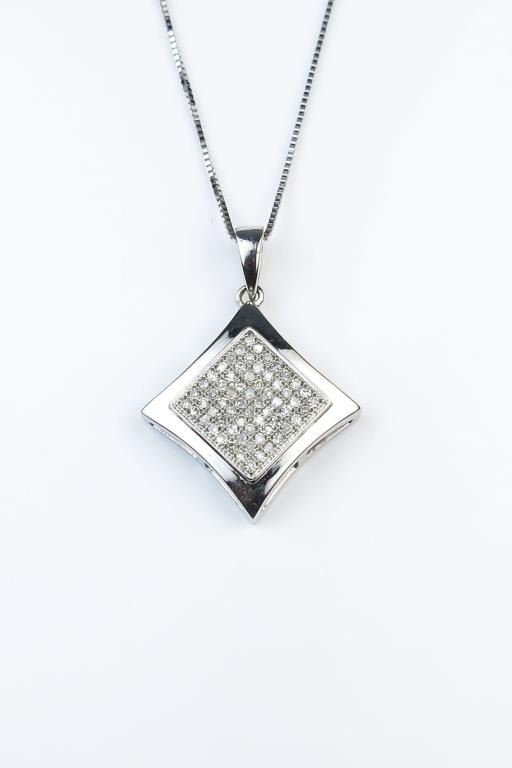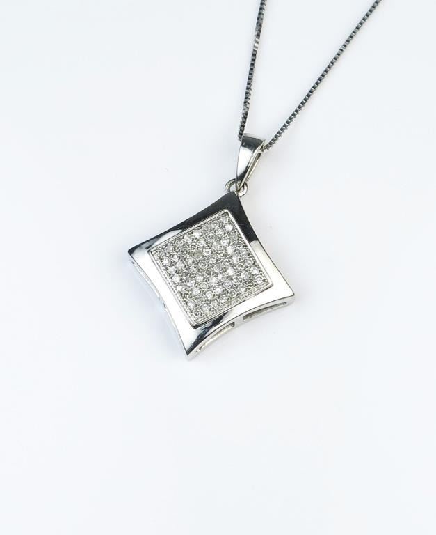 18CAI-59 DIAMOND PENDANTDazzling pendant set with 64 round Diamonds weighing approx. 0.50 carats of G-H colors and VS/SI clarity micro set in a 14 karat white gold setting and chain. Estimates $600-$900Dazzling pendant set with 64 round Diamonds weighing approx. 0.50 carats of G-H colors and VS/SI clarity micro set in a 14 karat white gold setting and chain. Estimates $600-$900