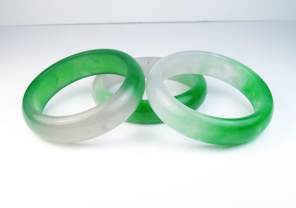 18CAI-56 3 BANGLE BRACELETSLot of three Green and Lavender Jade bangle bracelets. Estimates $300-$700Lot of three Green and Lavender Jade bangle bracelets. Estimates $300-$700