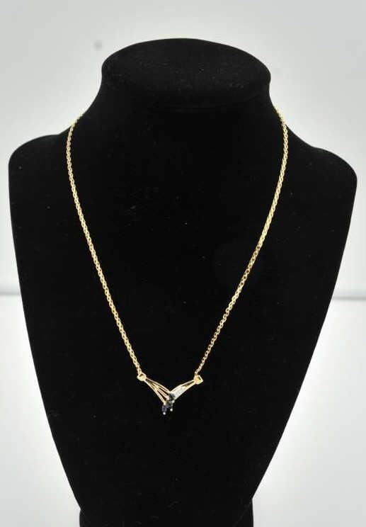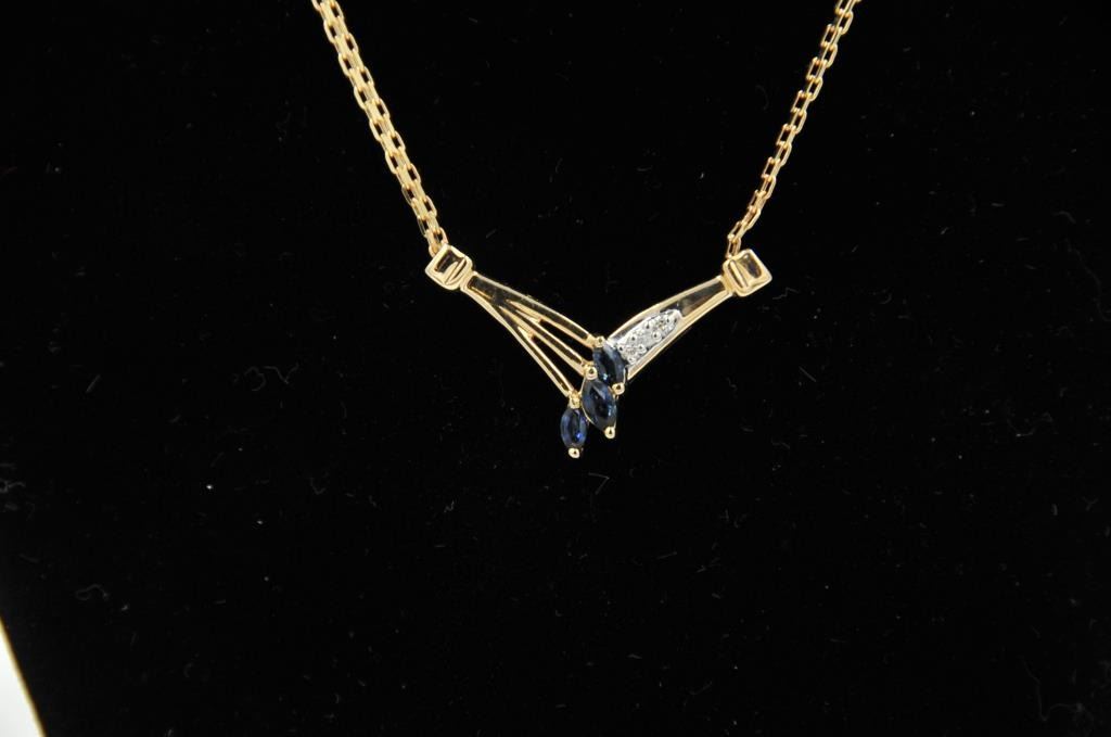 18PRS-12 SAPPHIRE & DIAMOND NECKLACEOne beautiful 3 marquee sapphire and diamond necklace in 14k yellow gold EST:$300-500One beautiful 3 marquee sapphire and diamond necklace in 14k yellow gold EST:$300-500