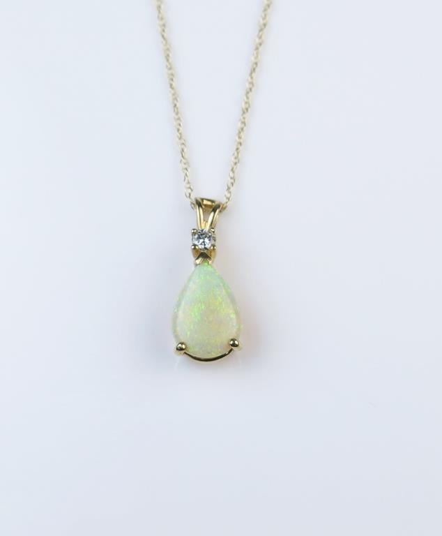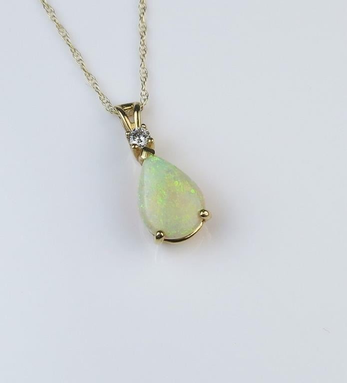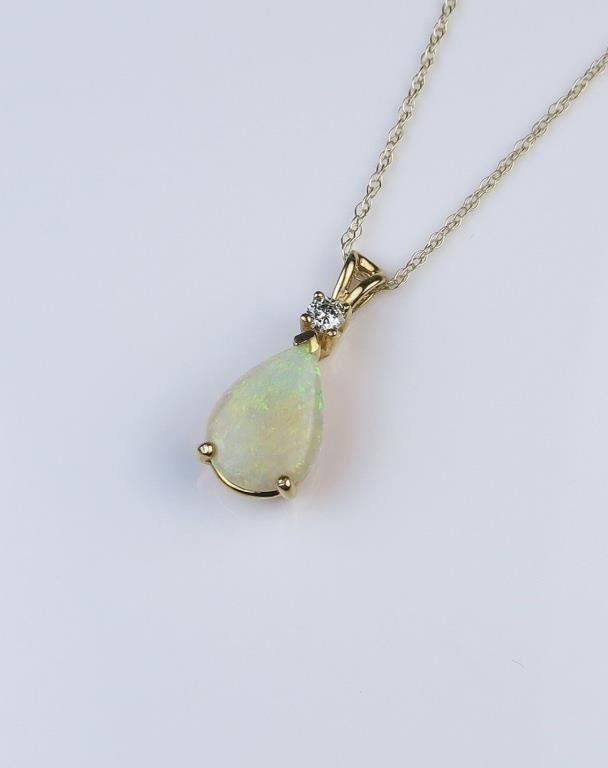 18CAI-41 OPAL & DIAMOND PENDANTElegant Australian Opal and Diamond pendant in 14 karat yellow gold and 10 karat gold chain. Estimates $600-$900Elegant Australian Opal and Diamond pendant in 14 karat yellow gold and 10 karat gold chain. Estimates $600-$900