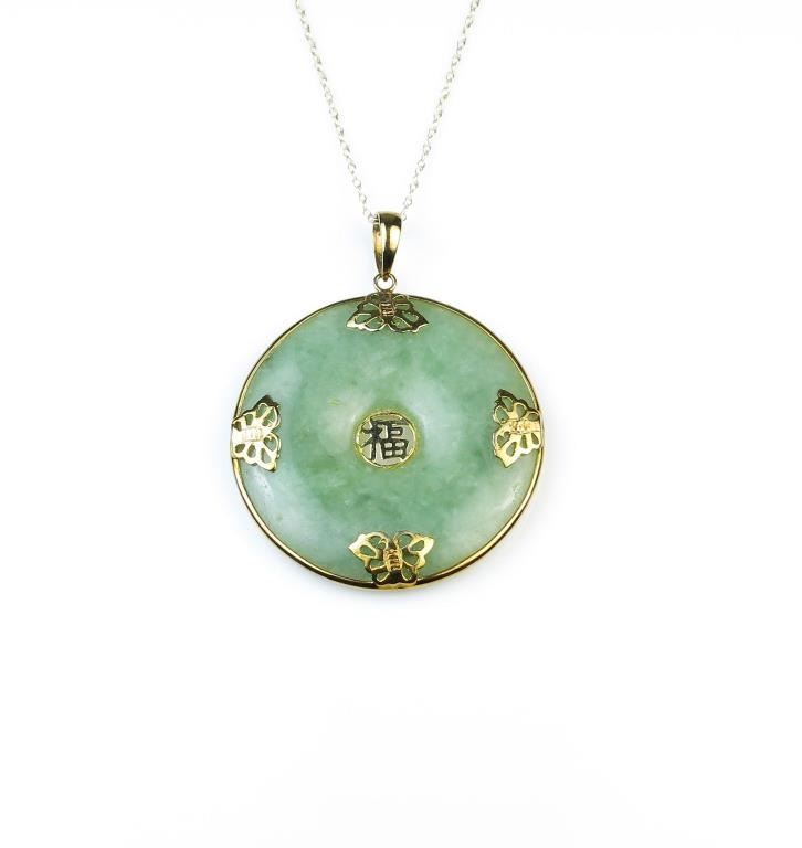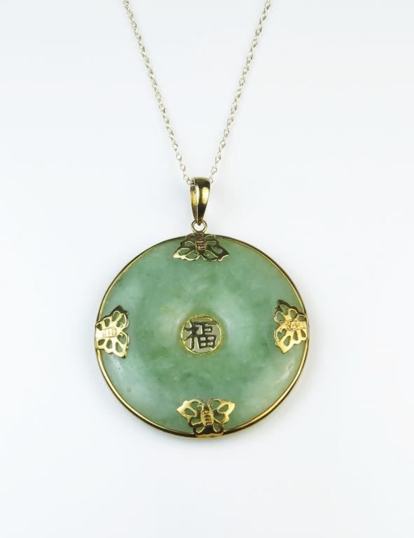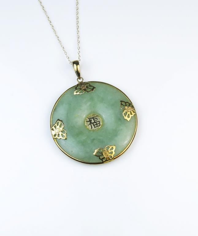 158CAI-53 JADE/JADEITE DISCVery elegant green Jade/Jadeite disc in 14 karat yellow gold on a 10 karat gold chain. Measures approx. one inch in diameter. Estimates $800-$1,200Very elegant green Jade/Jadeite disc in 14 karat yellow gold on a 10 karat gold chain. Measures approx. one inch in diameter. Estimates $800-$1,200